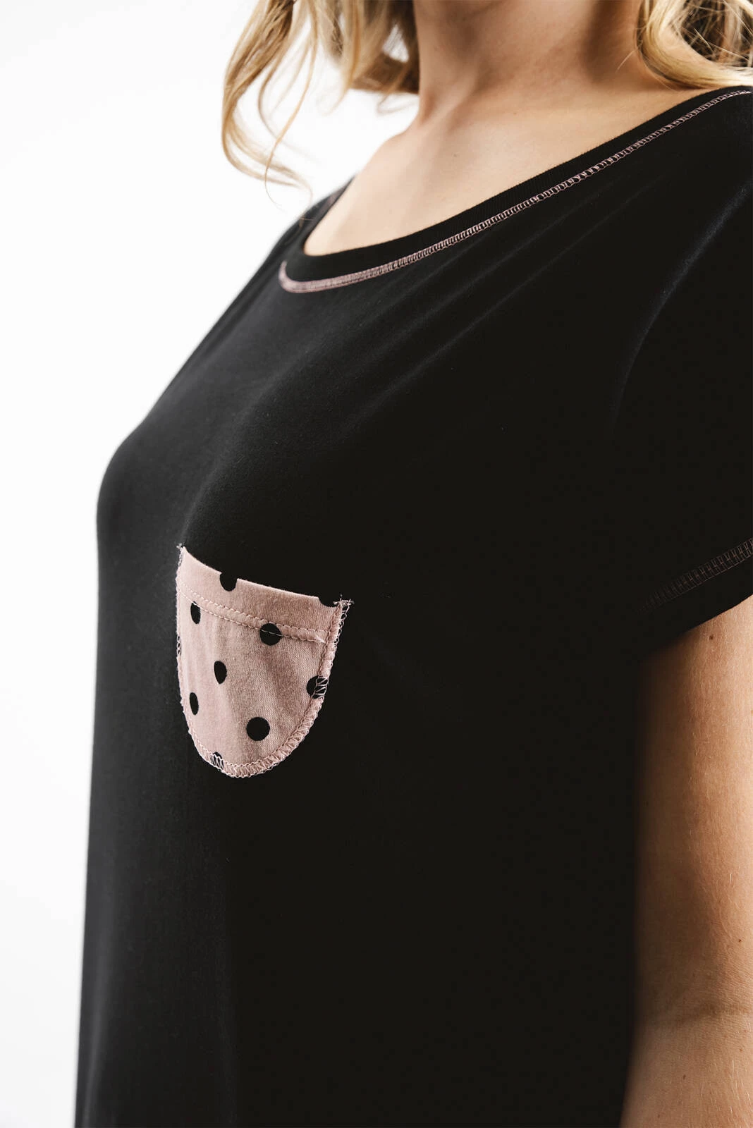 Kolorystyka: Połączenie czerni i różu nadaje piżamie stylowego i eleganckiego wyglądu. Czarny kolor dodaje wyrafinowania, podczas gdy różowe akcenty wprowadzają element świeżości i subtelności, tworząc harmonijną całość.