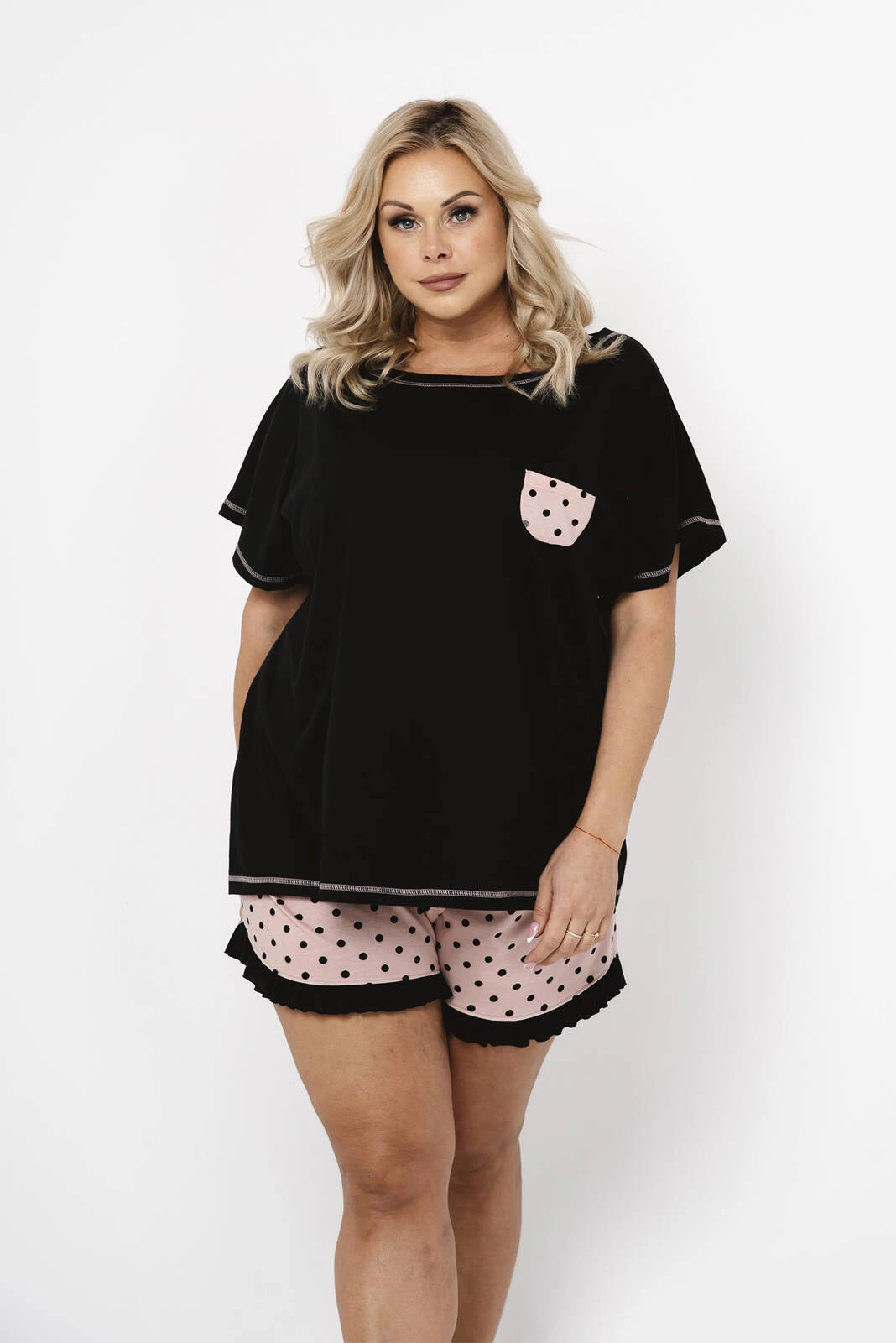 Modny Design: Piżama cechuje się ponadczasowym stylem, który łączy funkcjonalność z estetyką. Górna część piżamy ma dekolt w łódkę ozdobiony szwem w kontrastującym różu co dodaje całości elegancji i subtelnego uroku. Krótkie spodenki w urocze kropeczki zapewniają pełną swobodę ruchów i dodają stylu.