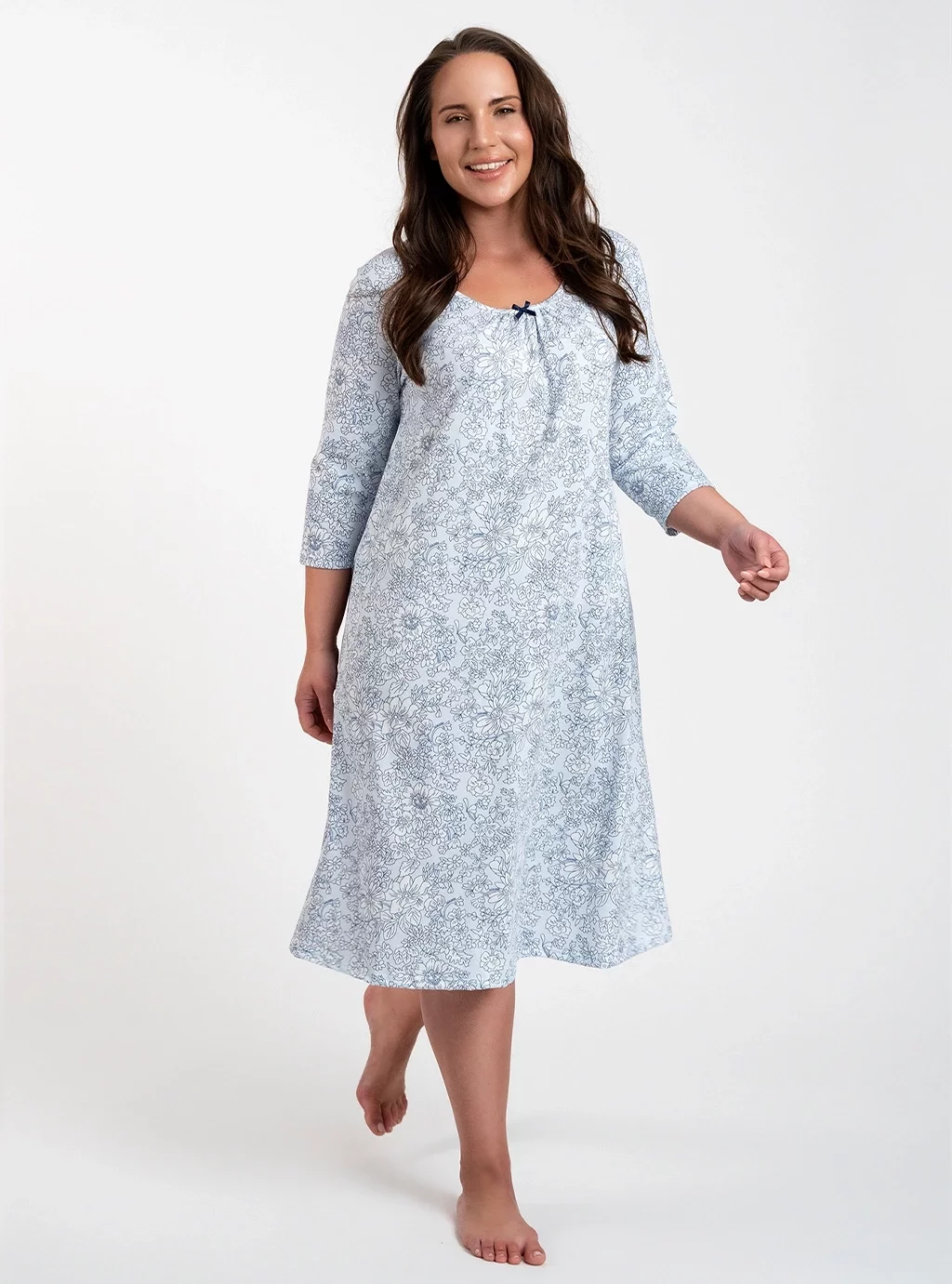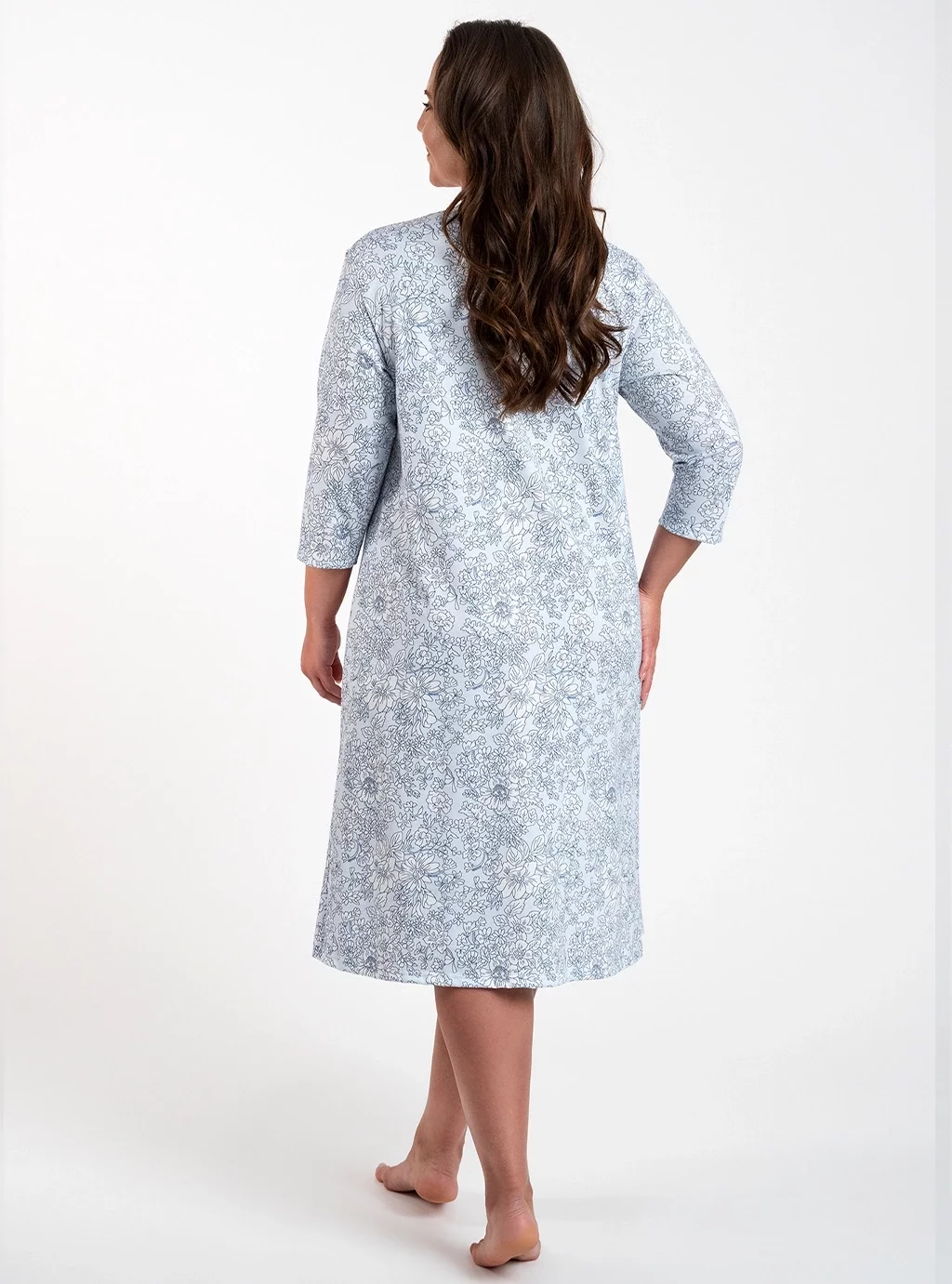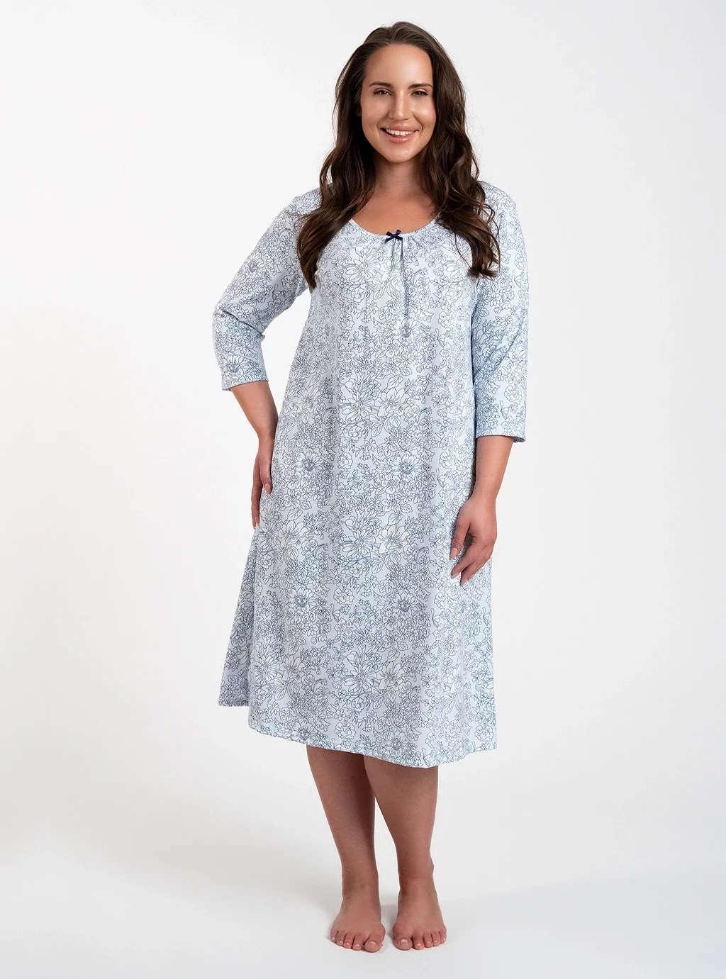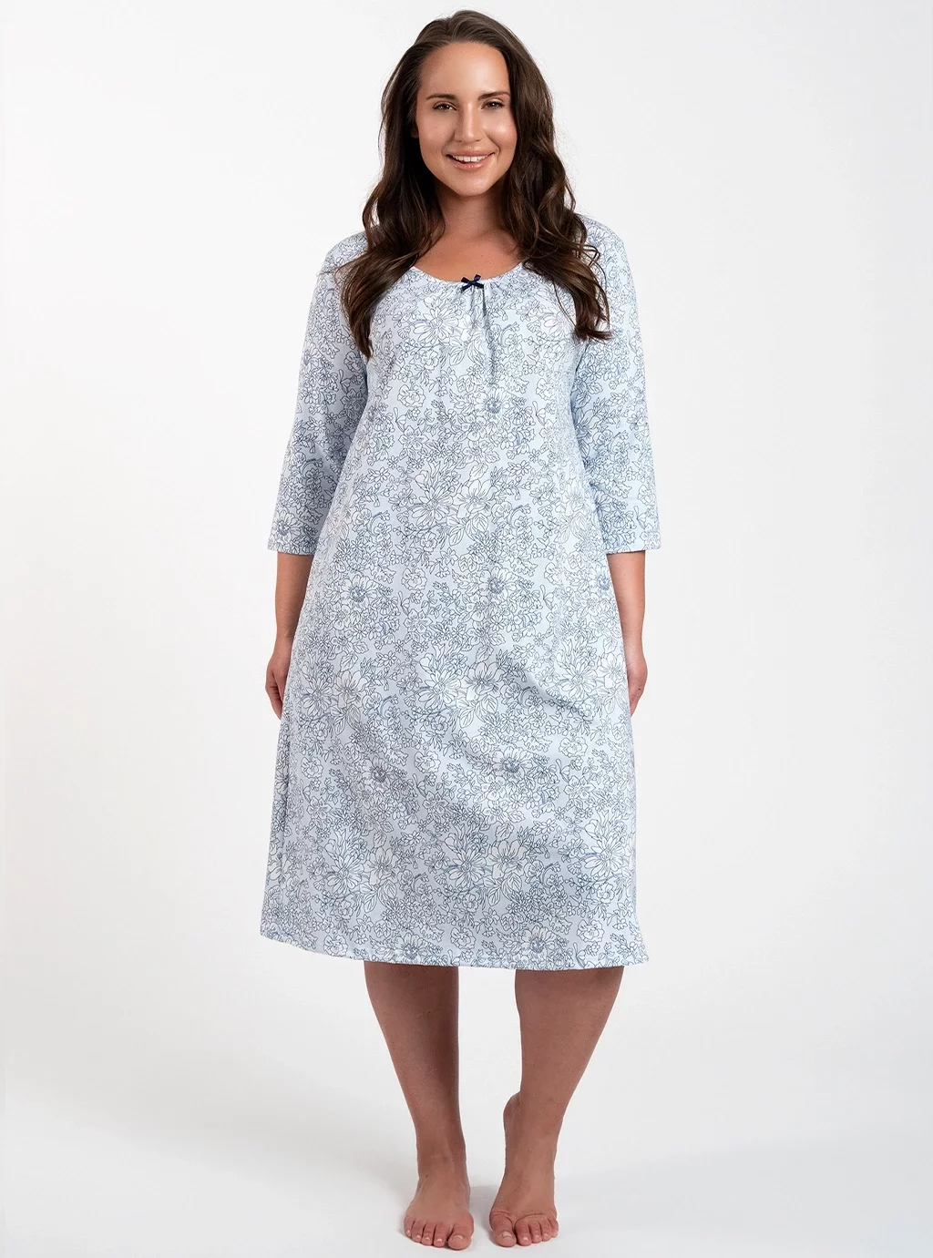 Antonia to koszula nocna damska w delikatne białe kwiaty na błękitnym tle. Została zaprojektowana z myślą o kobietach, które pragną nie tylko spokojnego snu, ale również chcą czuć się wyjątkowo i pięknie podczas nocnego wypoczynku. Ta niezwykle przyjemna w dotyku koszula z dłuższym rękawem 3/4, marszczonym dekoltem oraz uroczą ozdobną kokardką , zapewni Wam komfort oraz elegancki wygląd.