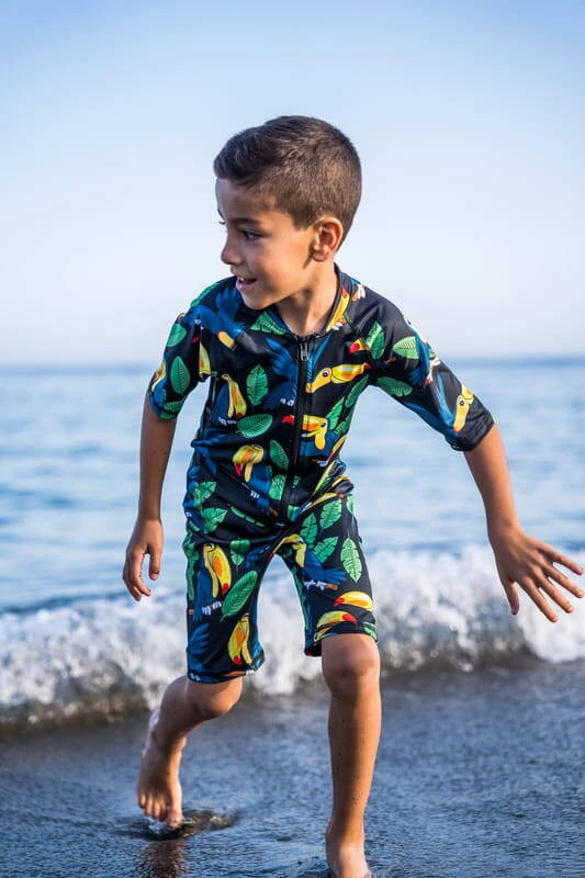 Kombinezon kąpielowy dziecięcy w czarnym kolorze z motywem tukana to doskonały wybór dla małych miłośników wodnych zabaw. Ten dziecięcy strój kąpielowy zapewnia nie tylko komfort, ale także ochronę przed szkodliwym promieniowaniem UV, stając się niezbędnym elementem letniej garderoby każdego dziecka. Dziecięcy kombinezon kąpielowy uv został uszyty z wysokiej jakości materiałów, bezpiecznych dla Waszej pociechy. Ten niebanalny czarny kombinezon dziecięcy/ strój kąpielowy gwarantuje i wykazuje niezwykłą trwałość i odporność na użytkowanie. Motyw tukana na czarnym tle dodaje strojowi charakteru który z pewnością spodoba się maluchom zwłaszcza chłopcom. Kombinezon kąpielowy UPF 50 zapewnia dodatkową ochronę przed promieniowaniem UV, dzięki czemu dzieci mogą bezpiecznie bawić się na słońcu.