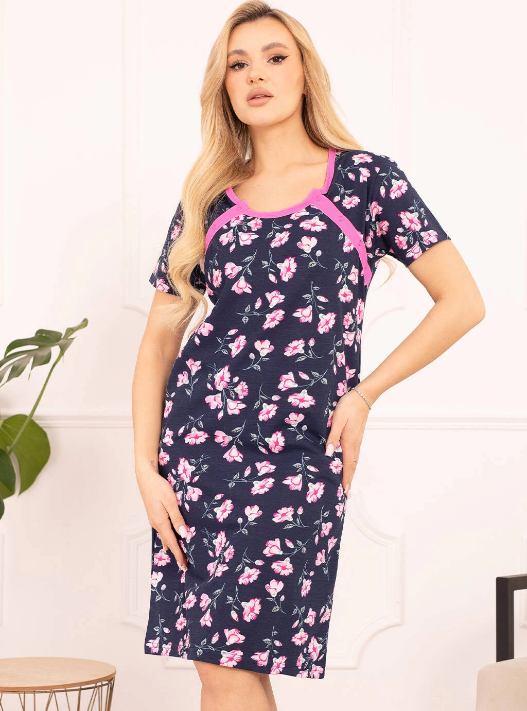 Śliczna granatowa koszula do karmienia i porodu. Różowe kwiaty na całości oraz delikatna bladoróżowa lamówka to wzór koło którego żadna przyszła mama nie może przejść obojętnie. Dodatkową zaletą tej koszuli są napy po obu stronach ułatwią karmienie piersią.