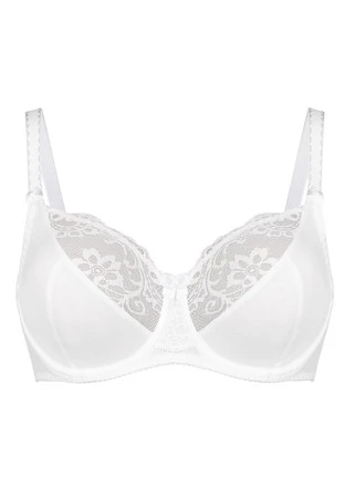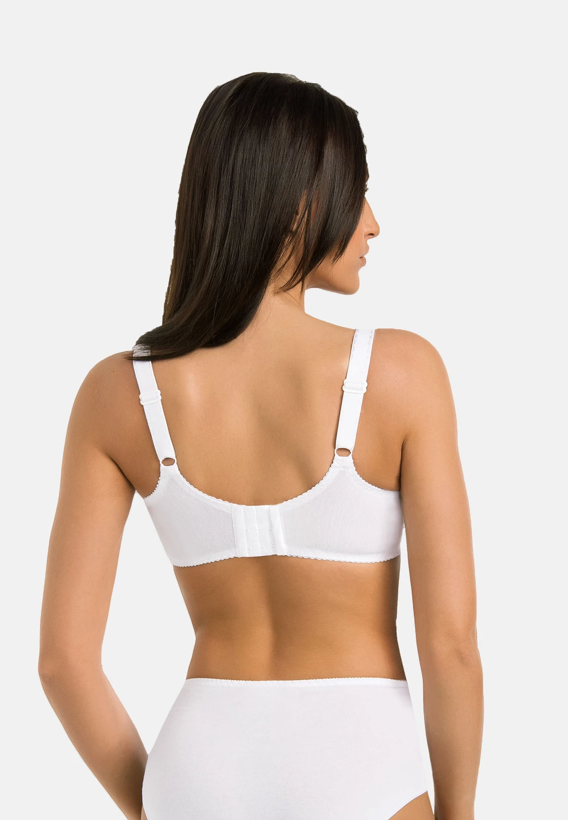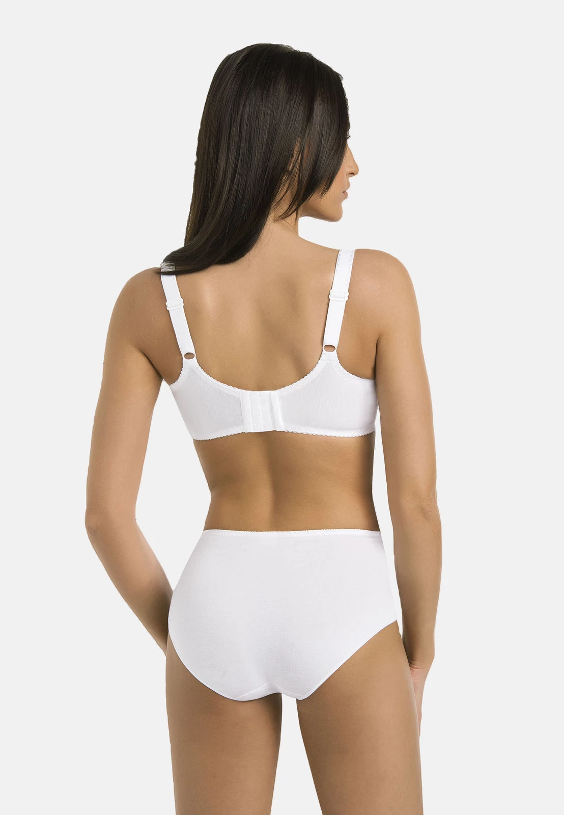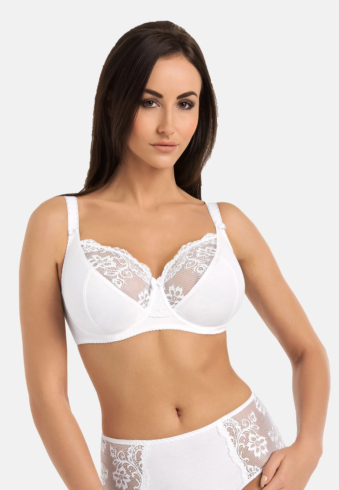 Biustonosz bawe�niany w kolorze bia�ym. Biustonosz mi�kki z fiszbinami wykonany jest z wysokogatunkowej bawe�ny, materia� na miseczce sk�ada si� w 100% z bawe�ny, natomiast na boczkach jest z dodatkiem lycry, �eby lepiej dopasowa� si� do cia�a. G�rna cz�� miseczki jest wyko�czona delikatn� koronk� o pi�knym motywie kwiatowym. Biustonosz posiada pionowe ci�cia, kt�re podnosz� biust do g�ry i poziome, kt�re dobrze spychaj� piersi do �rodka i tym samym �adnie je eksponuj�. Miski s� g��bokie i kryj� ca�e piersi, nie przecinaj�c ich. Biustonosz jest z boku wy�ej zabudowany, co pozwala zakry� kobiece niedoskona�o�ci. Szeroko�� rami�czek dostosowana jest do rozmiaru. Rami�czka ozdobione s� delikatn� kokardk� i posiadaj� regulacj�. Biustonosz jest bardzo wygodny i nadaje si� do codziennego u�ytku, dlatego te� ka�da kobieta powinna mie� go w swojej garderobie.�