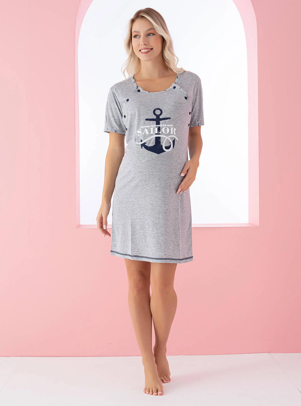 W naszym sklepie internetowym wszyscy staramy się żeby każda kobieta czuła się komfortowo i odnalazła Swoją koszulę nocną w naszej ofercie. Szara koszula ciążowa Sailor to przewiewna bawełna bezpieczna dla małego dziecka oraz wyjątkowo przyjemny w dotyku materiał żeby młoda mama również odczuwała komfort. Szybki dostęp do piersi dzięki otwarciu po bokach, ułatwia nie krępujące karmienie noworodka. Już dziś możesz wybrać różne modele koszul a nasi konsultanci pomogą Ci wybrać najlepszą koszule do porodu i karmienia jakiej szukasz.