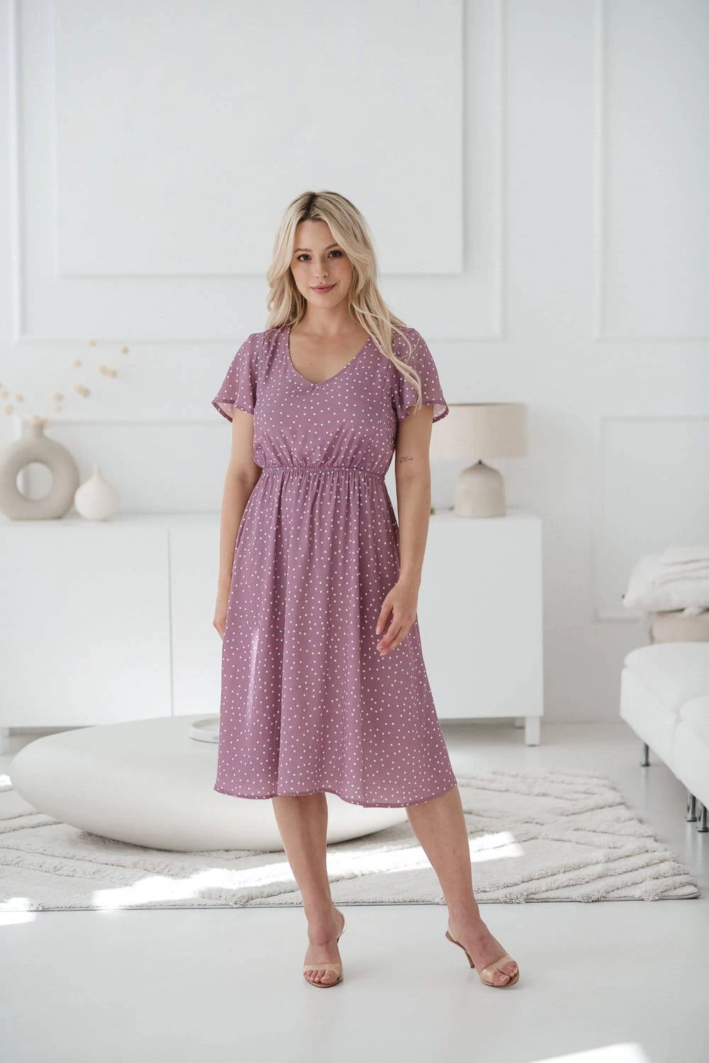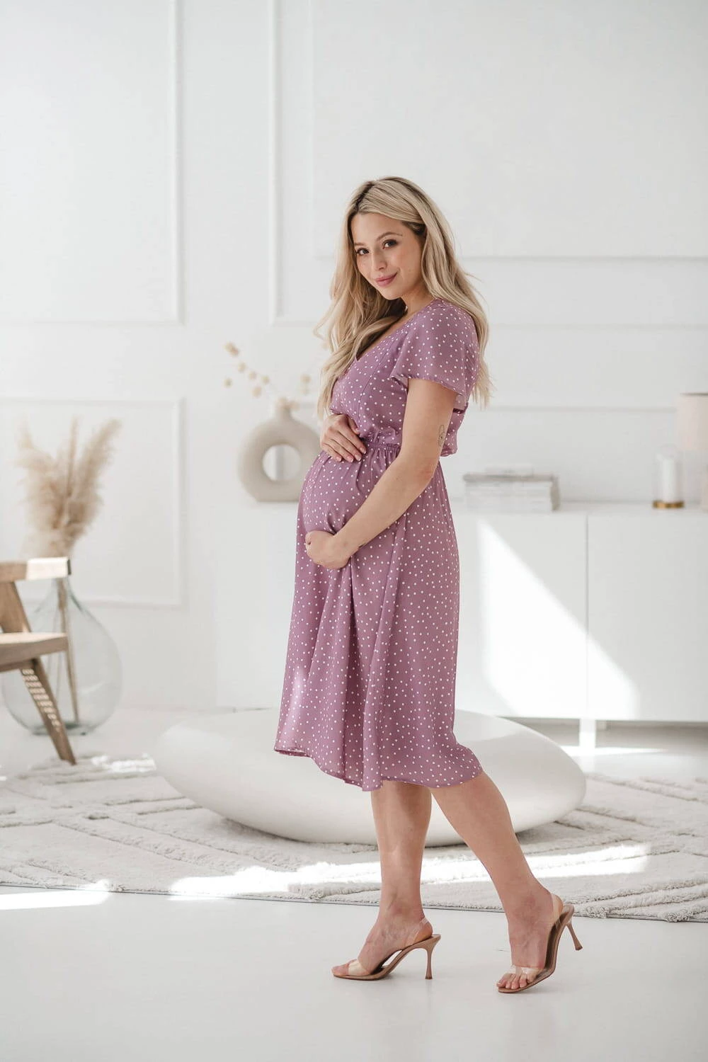 Sukienka ciążowa i do karmienia Lovely Dress Midi krótki rękaw lilowy róż w groszki