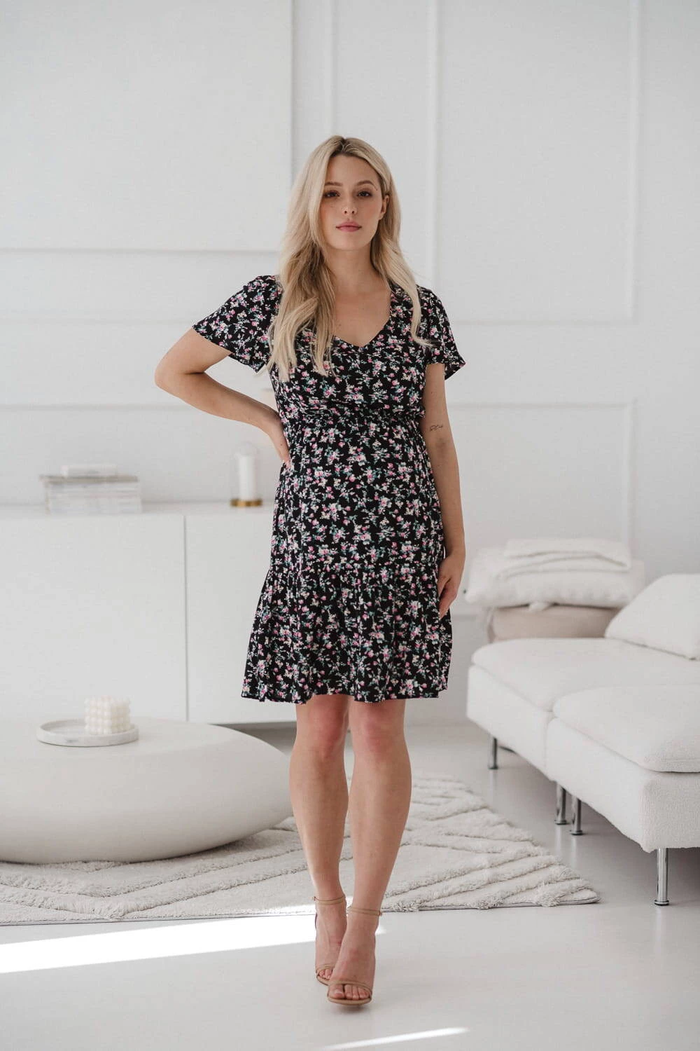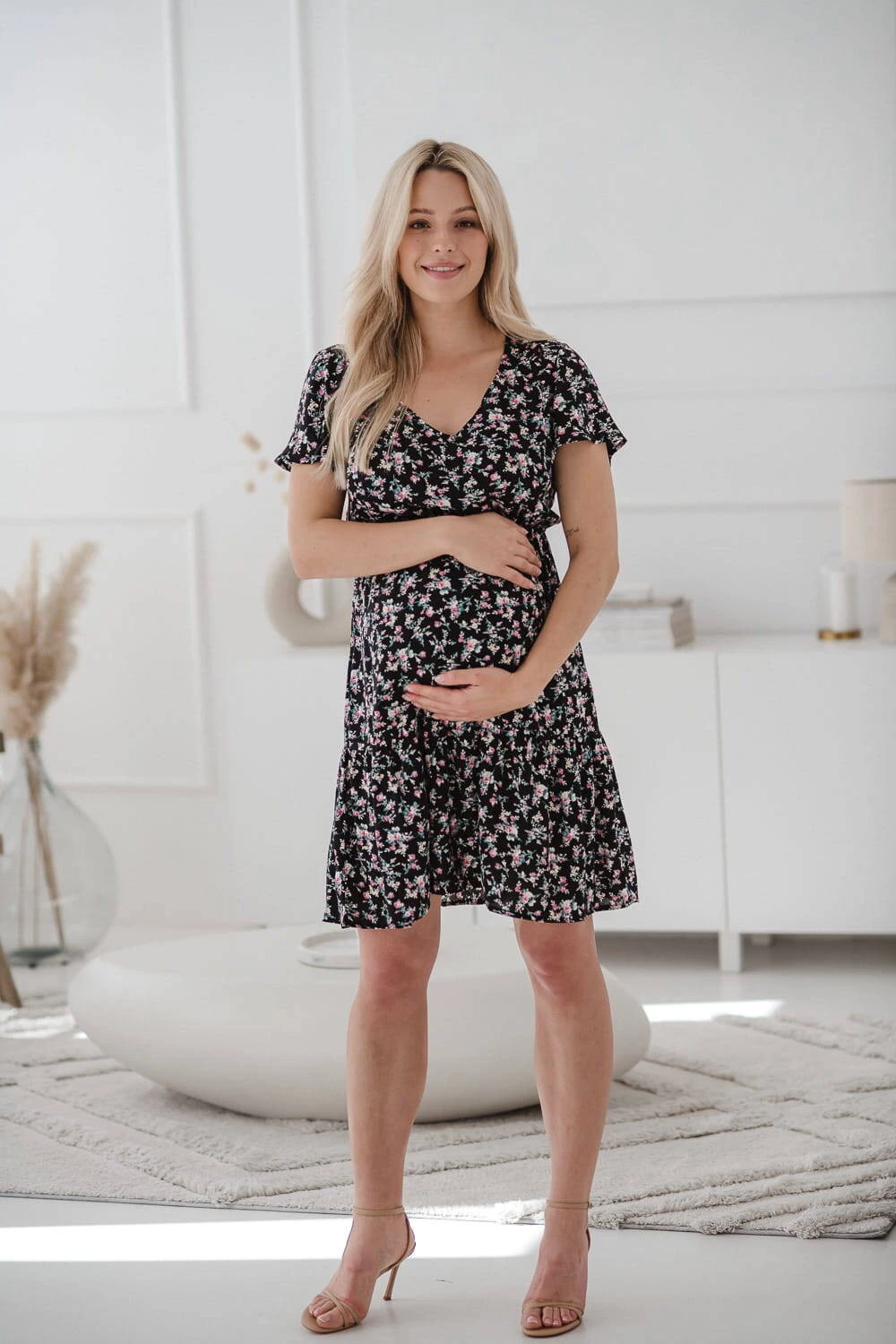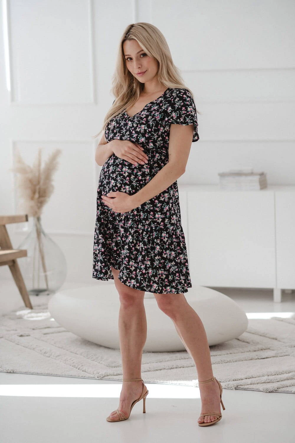 Sukienka do karmienia piersią i na czas ciąży Lovely Dress z krótkim rękawem w różyczki to doskonały wybór na letnie dni, zapewniający wygodę i styl na każdym etapie macierzyństwa. Sukienka dla mam będzie idealna zarówno na ciążowy brzuszek, jak i do wygodnego, dyskretnego karmienia piersią dzięki ukrytym zamkom i modnym, rozszerzanym rękawom. Dzięki gumce doskonale dopasowuje się do zmieniającej się sylwetki, gwarantując komfort zarówno w ciąży, jak i po porodzie w okresie karmienia piersią kiedy będziesz świeżo upieczoną mamą. Uszyta z najwyższej jakości 100% wiskozy sukienka dla karmiących mam, zapewnia lekkość i przyjemność noszenia, po zakończeniu tego okresu karmienia piersią te wyjątkowe sukienki dla ciężarnych pozwalają na noszenie ich jak zwykłej, eleganckiej kreacji. Rozkloszowany dół zakończony falbaną dodaje lekkości i uroku. Sukienka jest produktem polskim, uszytym z dbałością o detale, co zapewnia wysoką jakość wykonania.