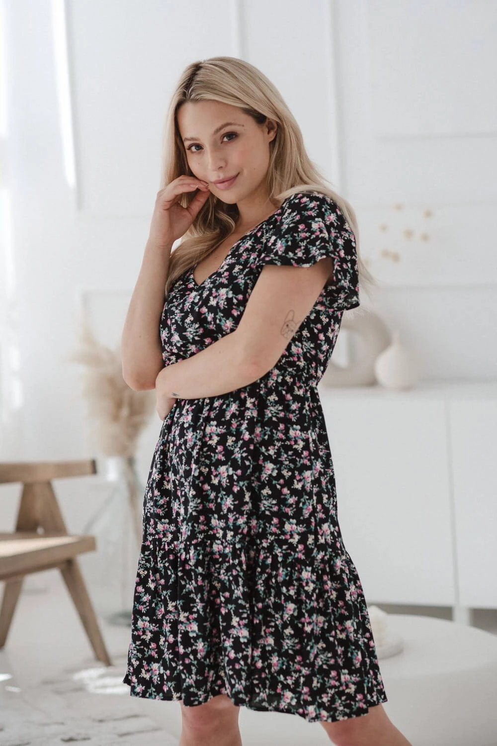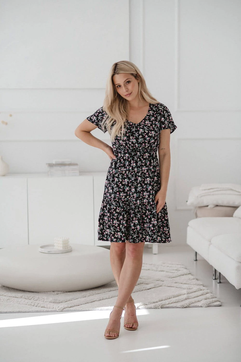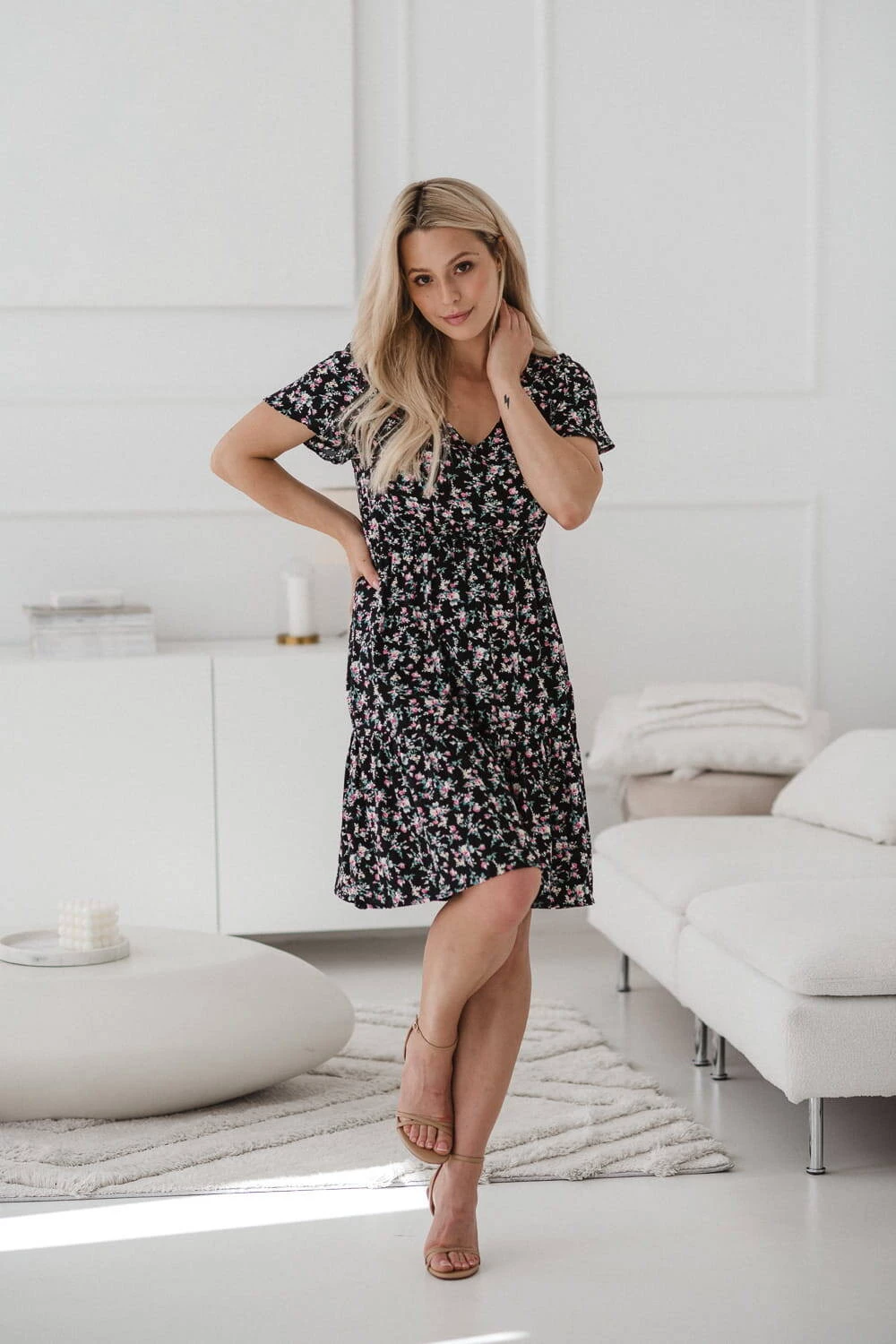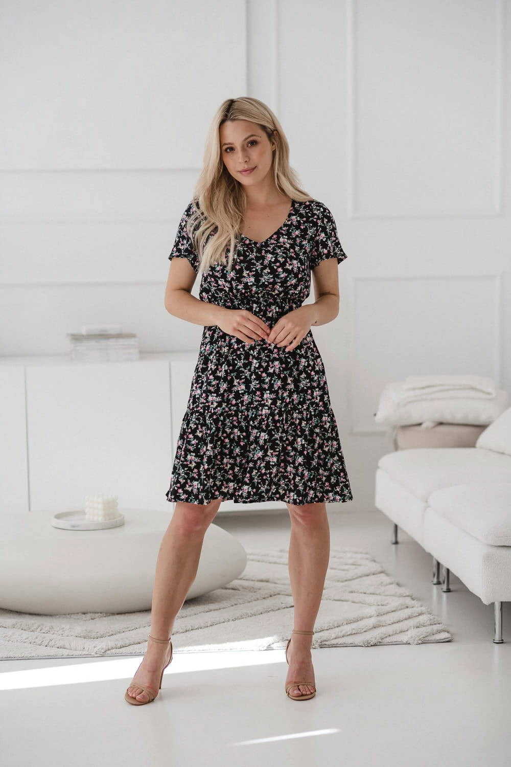 Sukienka do karmienia piersią i na czas ciąży Lovely Dress z krótkim rękawem w różyczki to doskonały wybór na letnie dni, zapewniający wygodę i styl na każdym etapie macierzyństwa. Sukienka dla mam będzie idealna zarówno na ciążowy brzuszek, jak i do wygodnego, dyskretnego karmienia piersią dzięki ukrytym zamkom i modnym, rozszerzanym rękawom. Dzięki gumce doskonale dopasowuje się do zmieniającej się sylwetki, gwarantując komfort zarówno w ciąży, jak i po porodzie w okresie karmienia piersią kiedy będziesz świeżo upieczoną mamą. Uszyta z najwyższej jakości 100% wiskozy sukienka dla karmiących mam, zapewnia lekkość i przyjemność noszenia, po zakończeniu tego okresu karmienia piersią te wyjątkowe sukienki dla ciężarnych pozwalają na noszenie ich jak zwykłej, eleganckiej kreacji. Rozkloszowany dół zakończony falbaną dodaje lekkości i uroku. Sukienka jest produktem polskim, uszytym z dbałością o detale, co zapewnia wysoką jakość wykonania.