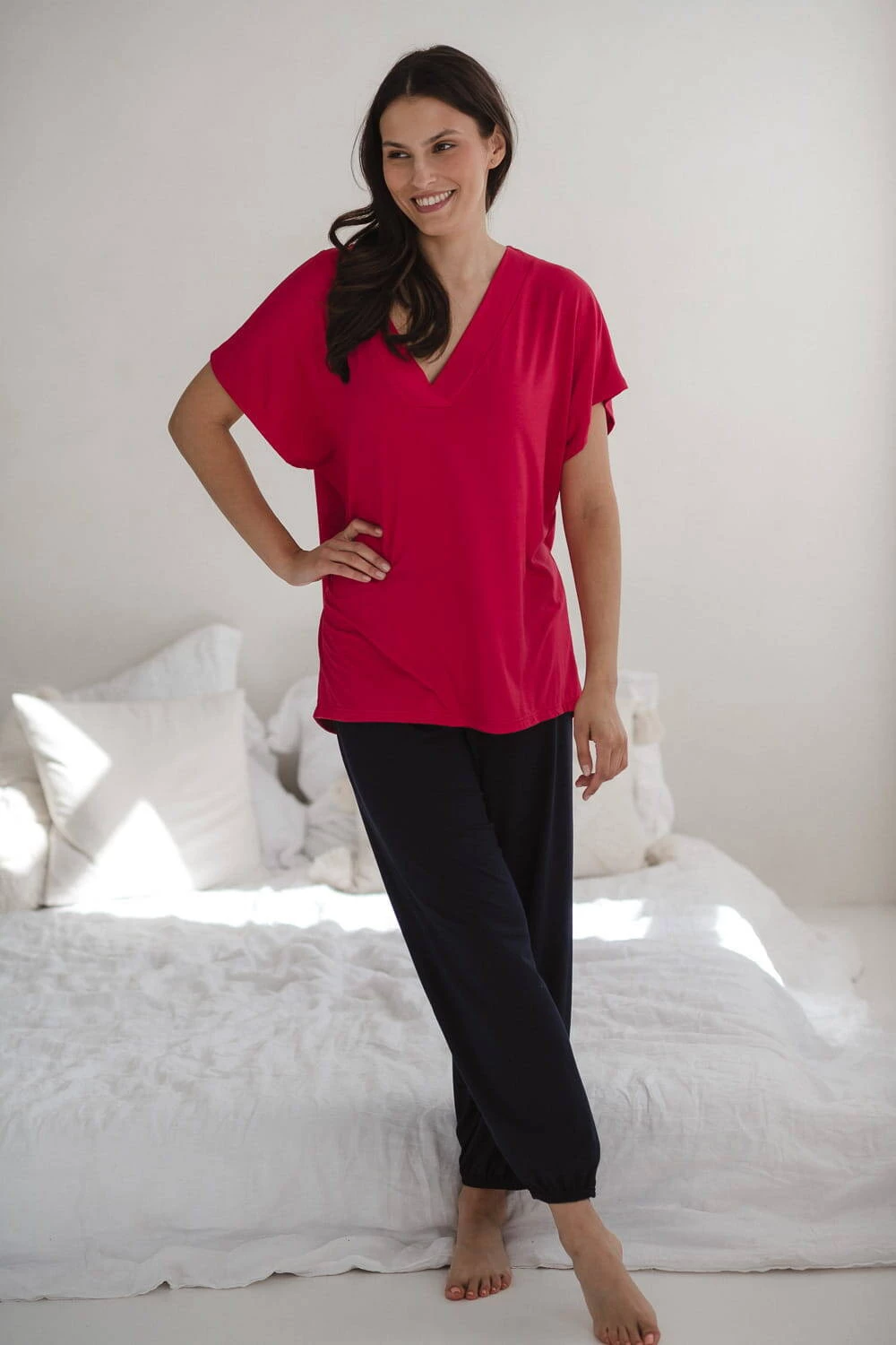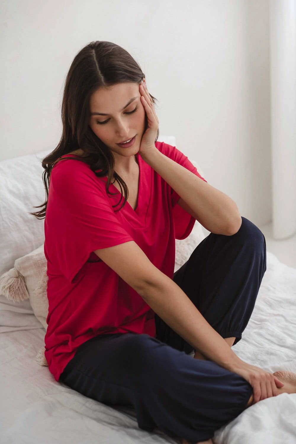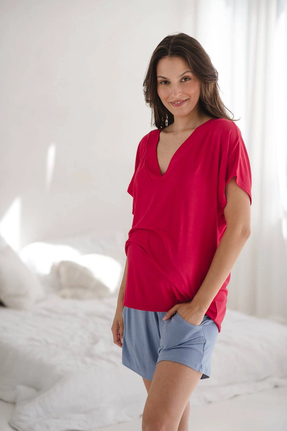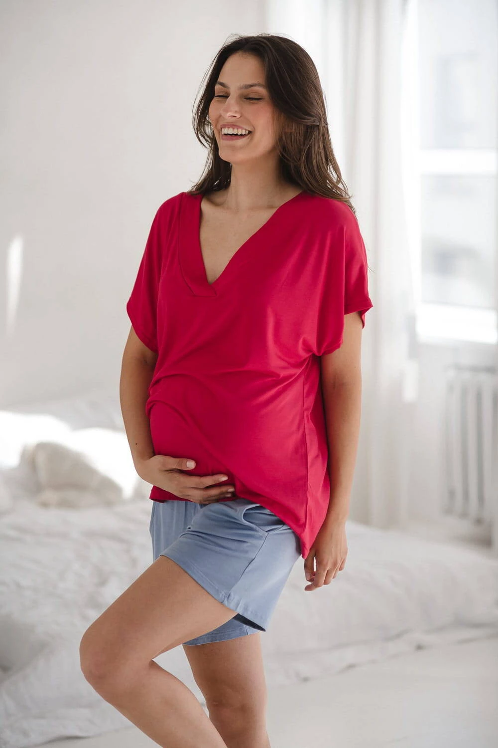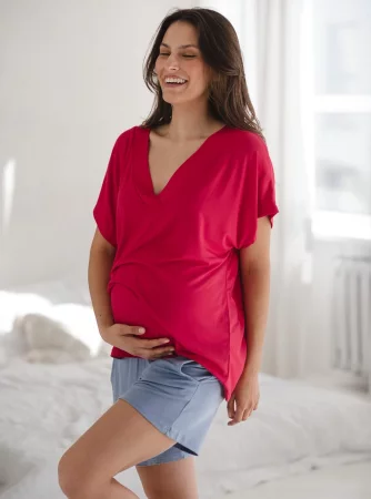 Bambusowa bluzka od piżamy ciążowej do karmienia krótki rękaw Moon malinowa