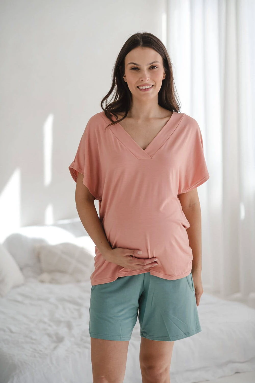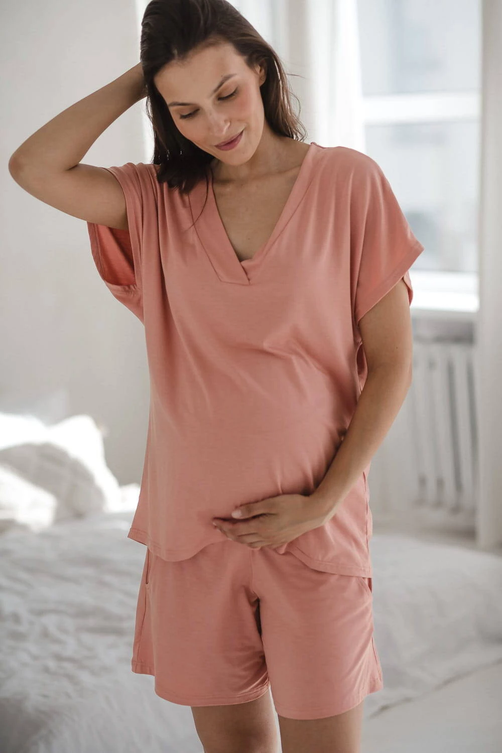 Bambusowa bluzka od piżamy ciążowej do karmienia krótki rękaw Moon herbaciana róża