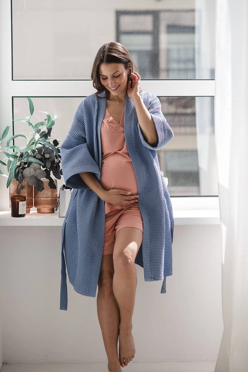 • Elastyczność i dopasowanie: Dzianina z domieszką elastanu dopasowuje się do zmieniających się kształtów ciała w ciąży i po porodzie.
