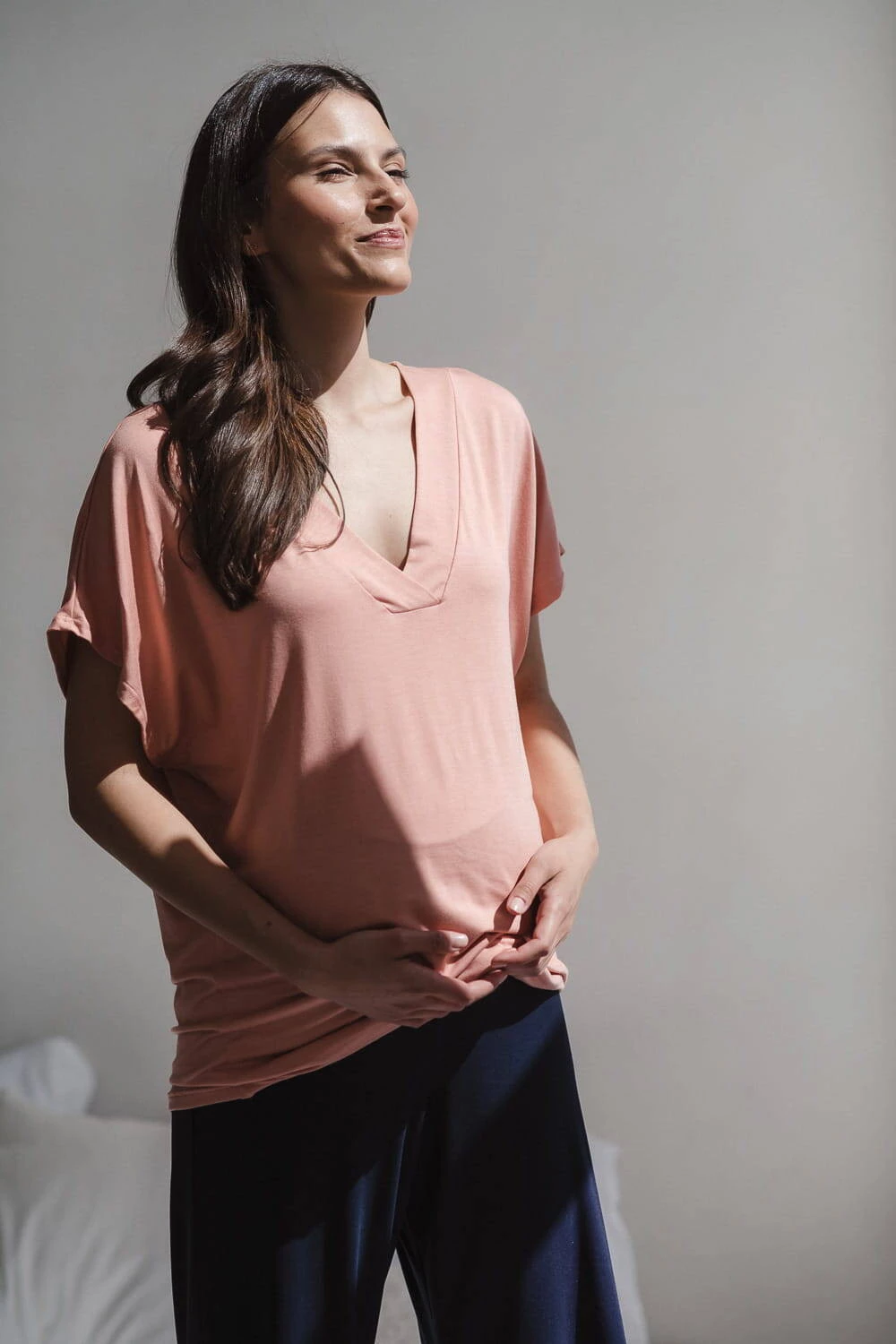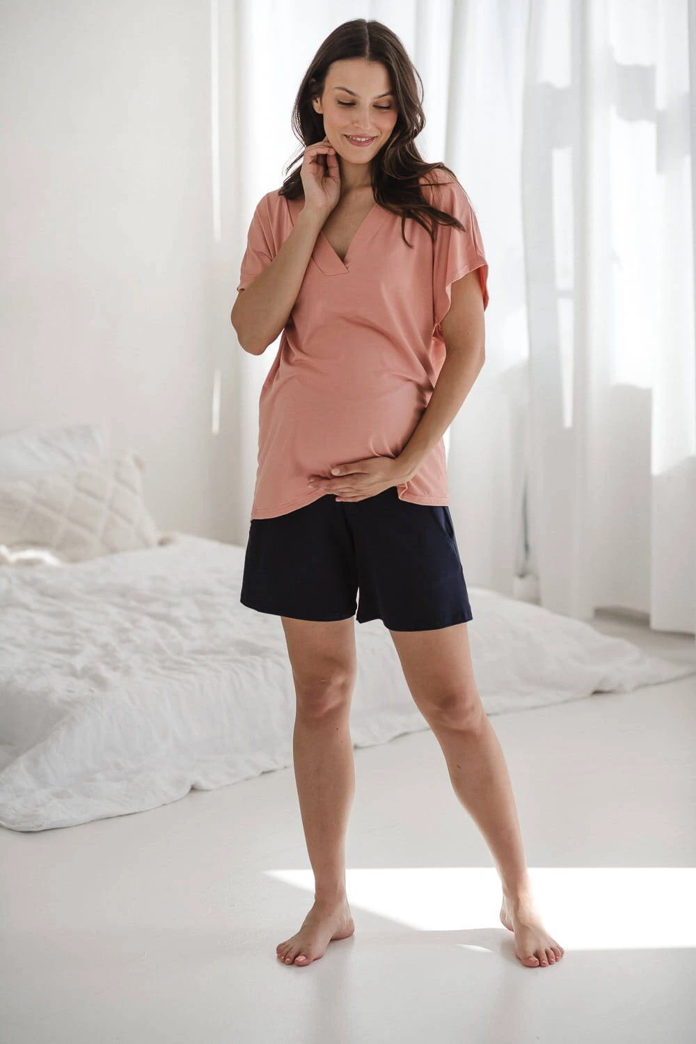 Bluzka od piżamy ciążowej Moon z krótkim rękawem to element kolekcji, którą stworzyliśmy do noszenia nie tylko w nocy, ale też na co dzień! Mamy wiedzą, jak wiele czasu spędza się w domu - odpoczywając przed porodem, karmiąc piersią, bawiąc się z maluszkiem, łapiąc drzemki... Właśnie dlatego stworzyliśmy linię prostych, wygodnych ubrań ciążowych i do karmienia Moon, w których będziesz czuć się komfortowo i pięknie przez cały dzień i noc.
