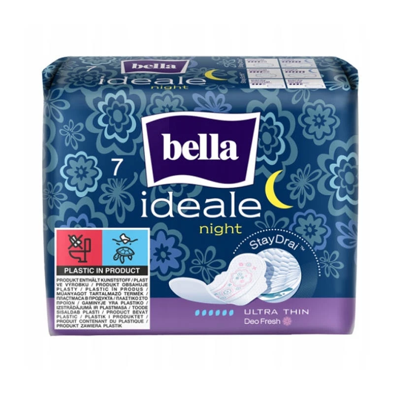 Ultracienkie podpaski higieniczne Bella Ideale StayDrai Night o podwyższonej chłonności błyskawicznie wchłaniają wilgoć, bardzo elastyczne dzięki czemu dopasowują się do każdego rodzaju odzieży.