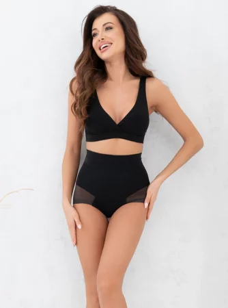 Figi maxi z wysokim stanem o właściwościach obciskająco-wyszczuplających. Podwójny przód wzmacnia funkcję wyszczuplającą brzuch, a figi nie są widoczne pod ubraniem. W tyle ozdobny, funkcjonalny, elastyczny tiul. W pasie delikatna gumka z silikonem.