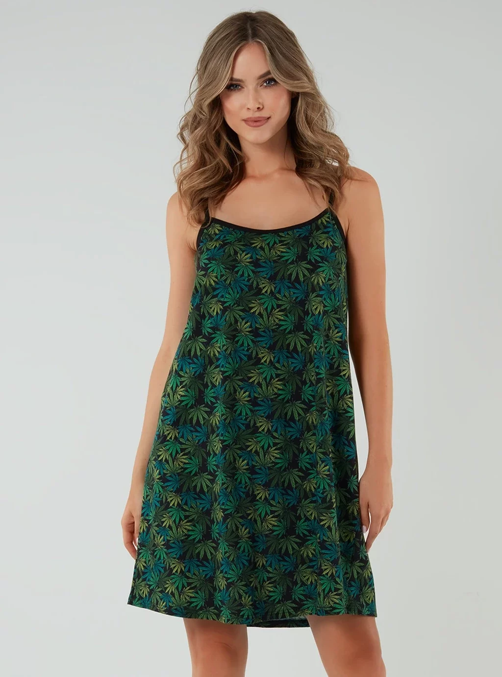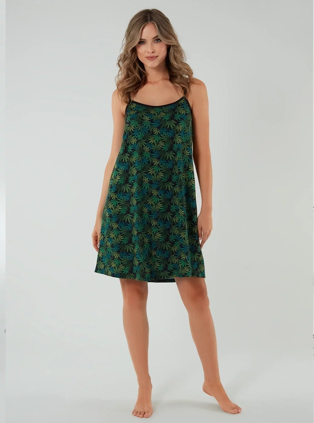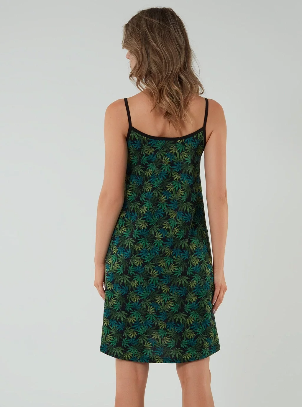 Odkryj perfekcyjne połączenie stylu i wygody z naszą koszulą nocną na ramiączkach. Ten ponadczasowy model, wzbogacony modnym, wakacyjnym wzorem, zapewnia komfort i elegancję każdej nocy. Trapezowy fason miękko układa się na sylwetce, gwarantując swobodę ruchów i wygodę noszenia. Koszula nocna wykonana z miękkiej, lekkiej i przewiewnej bawełny, idealnie sprawdzi się w ciepłe, letnie noce. Atrakcyjny roślinny nadruk przyciąga wzrok i dodaje energii, doskonale wpisując się w wakacyjną aurę. To idealny wybór dla miłośniczek wyrazistych printów i wyjątkowych połączeń kolorystycznych.