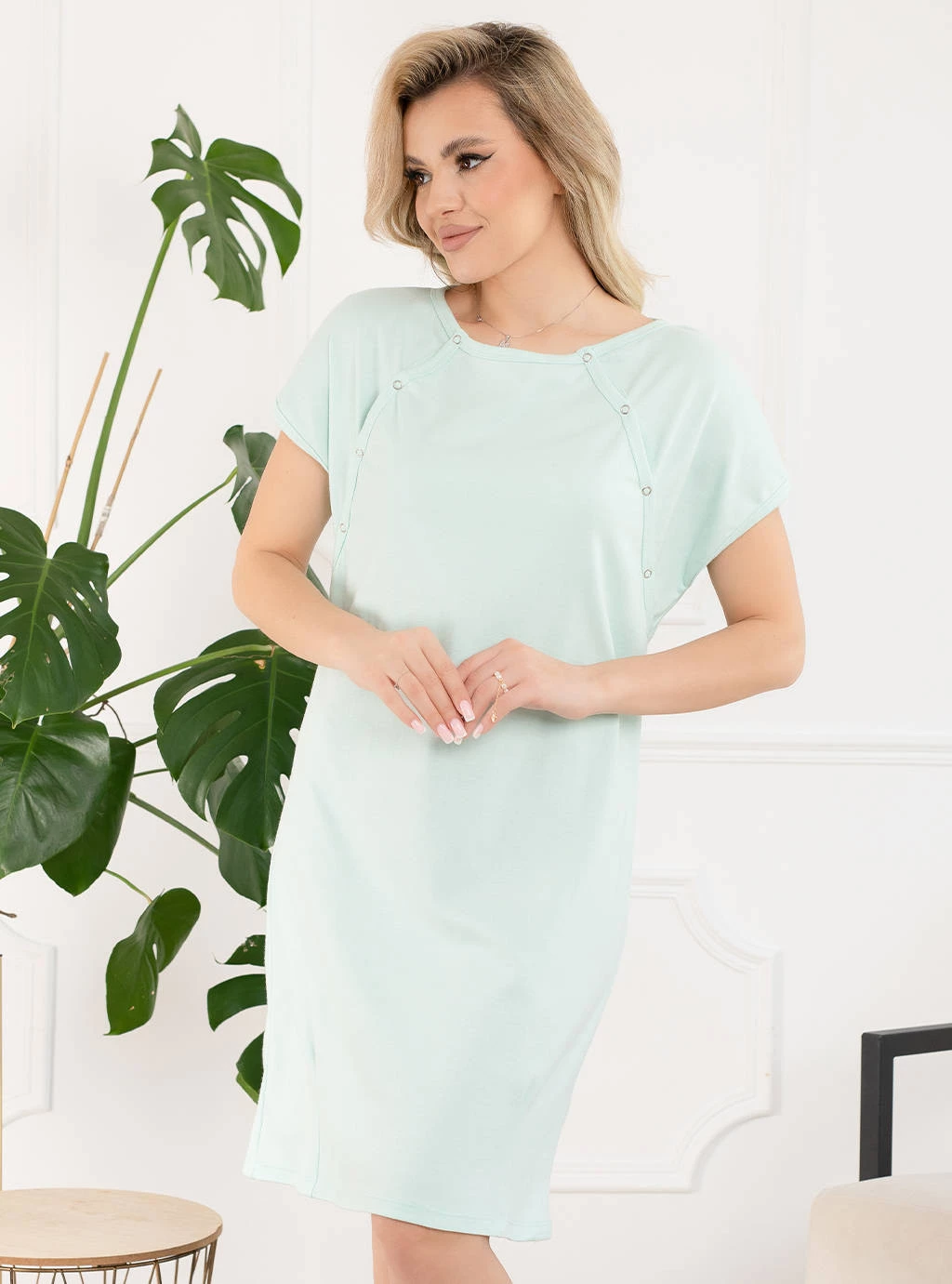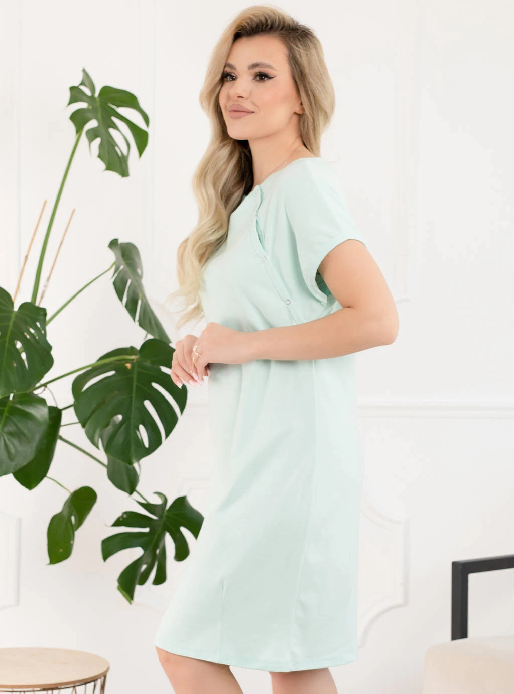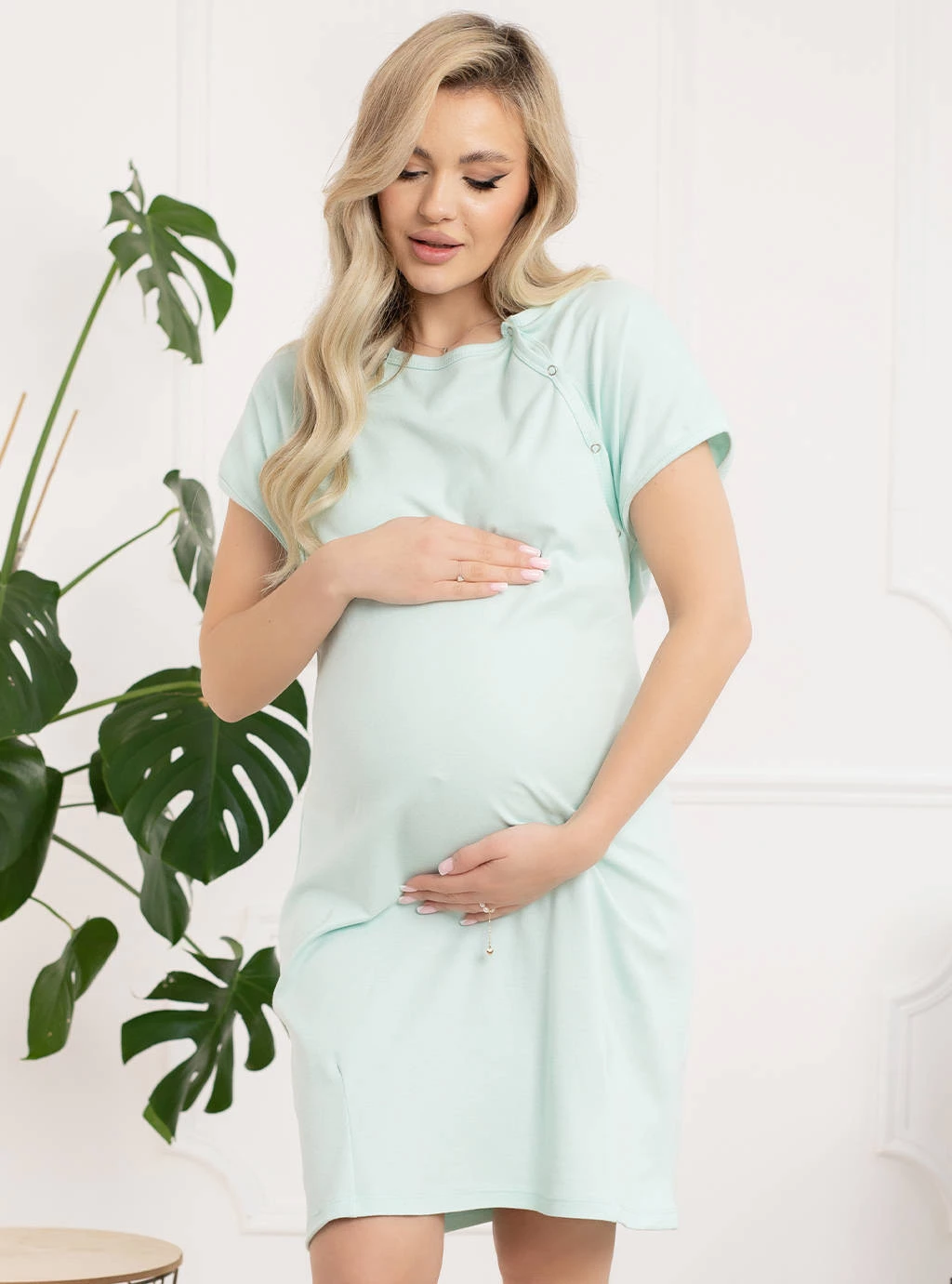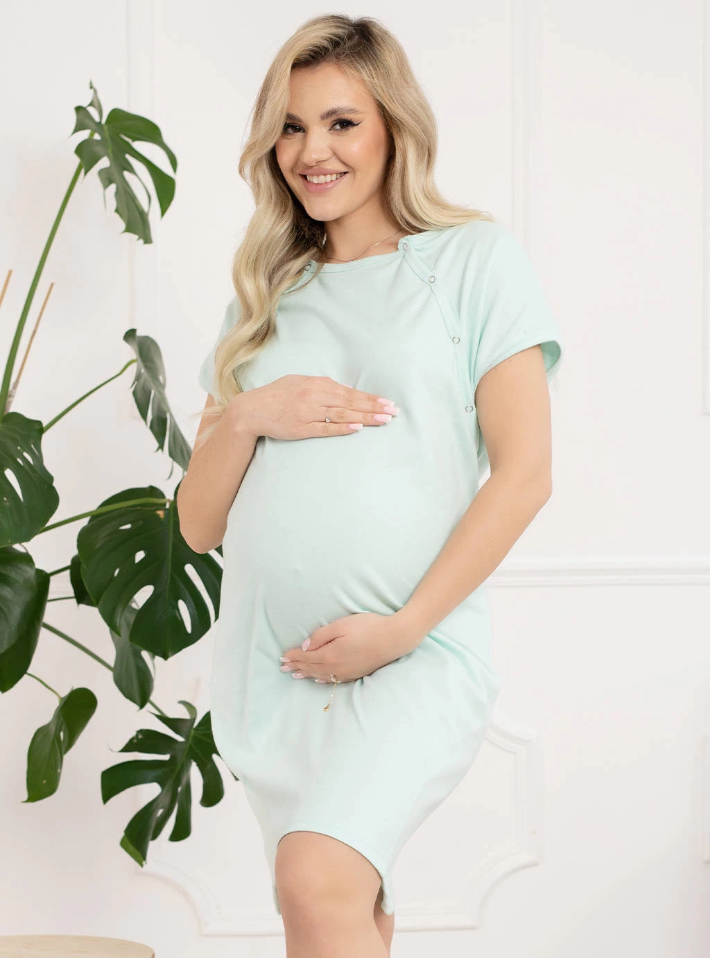Delikatna miętowa koszula do porodu i karmienia, rozpinana na zatrzaski z dwóch stron piersi oraz z tyłu po całej długości dla Twojej wygody, wyglądem przypomina modny krój nietoperz. Doskonała na czas pobytu w szpitalu i po domu. Zapięcie na zatrzaski z tyłu koszuli ułatwi Ci higienę i pozwoli czuć się wyjątkowo. Twoja wyprawka musi zawierać koszule z naszej pastelowej kolekcji.