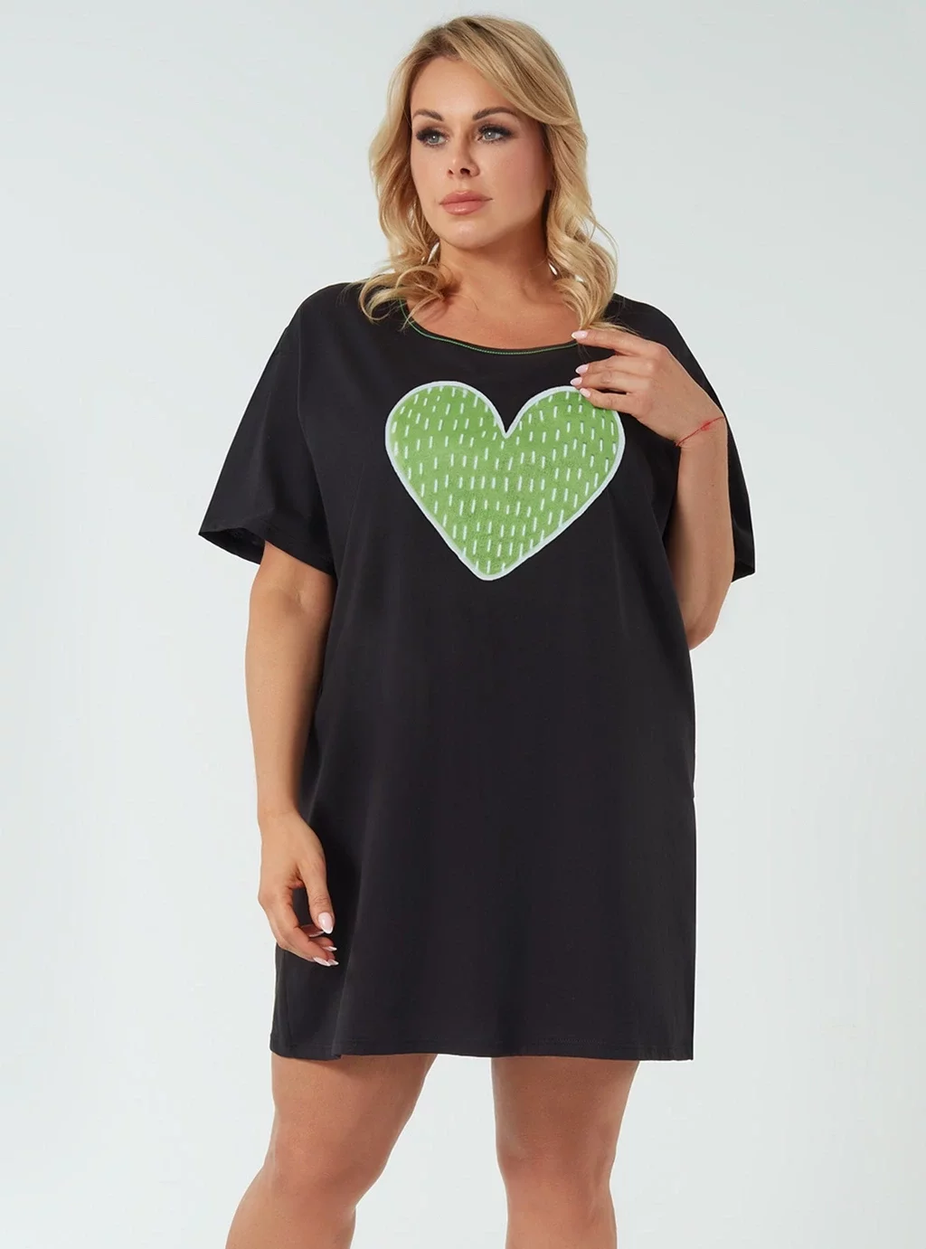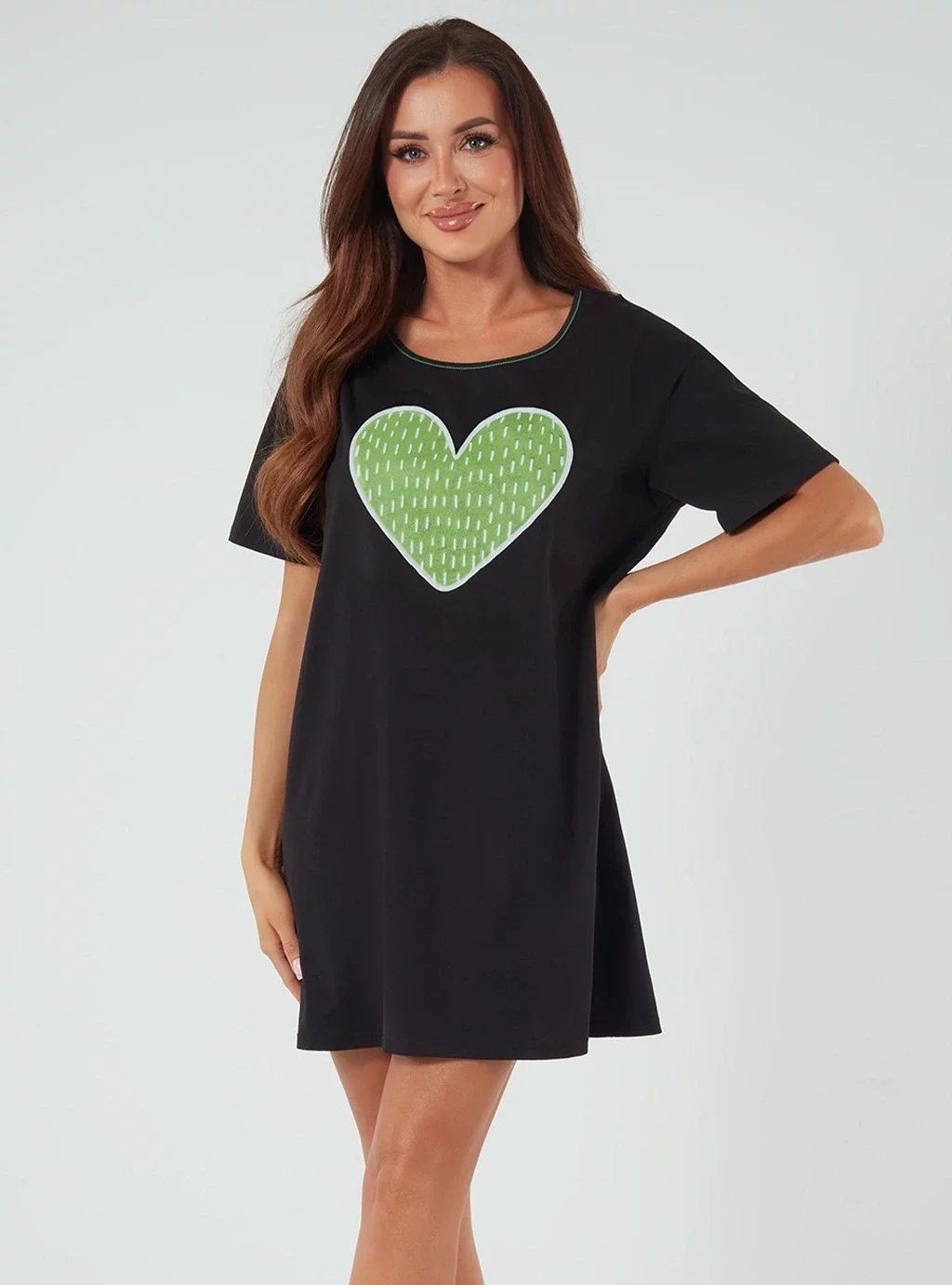 Damska koszula nocna z krótkim rękawem to propozycja dla kobiet, które kochają wyraziste printy i dla których liczy się dbałość o każdy szczegół. Posiada ona prosty, luźny fason, który dobrze układa się na sylwetce. Na przodzie widoczny jest okrągły dekolt z kontrastową lamówką oraz ozdobny nadruk prezentujący serduszko. Bawełniana koszula nocna zapewni Ci uczucie komfortu podczas snu. Utrzymana jest w trzech modnych kolorach, które tworzą ze sobą harmonijną całość. Ma ona również praktyczną długość, dzięki czemu zda egzamin nawet w największe upały.