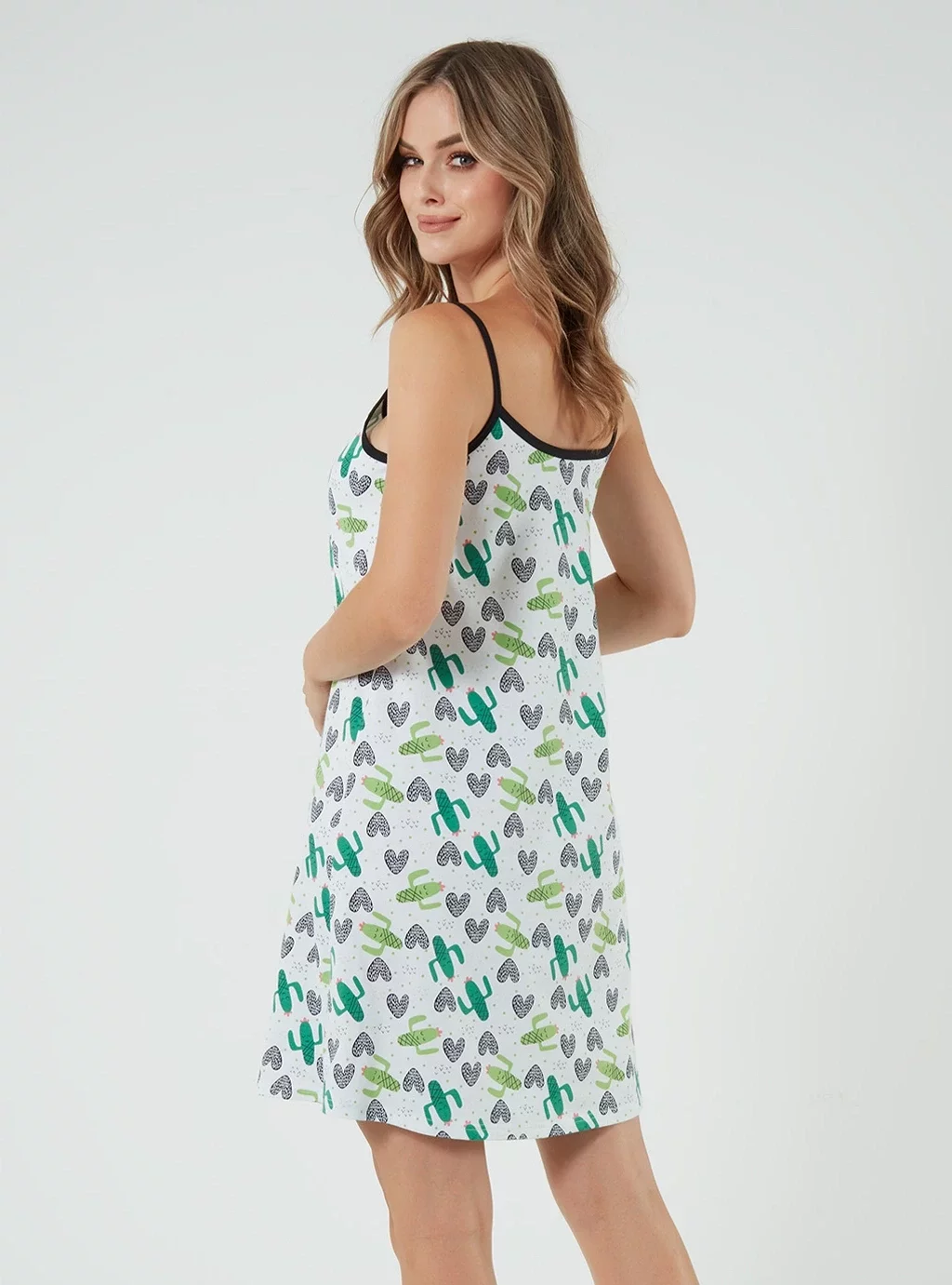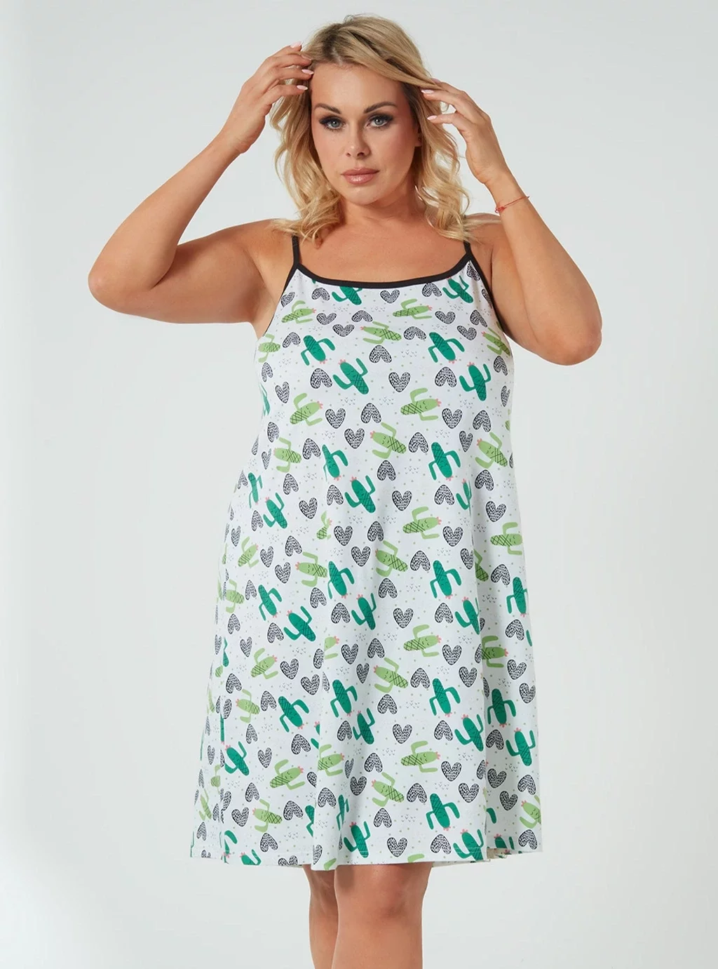 Stylowa koszula nocna na ramiączkach to idealny wybór dla kobiet, które szukają przewiewnej i wygodnej bielizny nocnej. Ten model charakteryzuje się luźnym, lekko trapezowym fasonem, który rozszerza się ku dołowi, zapewniając maksymalny komfort noszenia. Na przodzie koszuli znajduje się okrągły, klasyczny dekolt, który dodaje jej elegancji. Kolorowy nadruk doskonale wpisuje się w wakacyjną aurę, czyniąc tę koszulę idealnym wyborem na wiosnę i lato. Polecamy ją szczególnie fankom wiosennych printów i niesamowitej wygody.