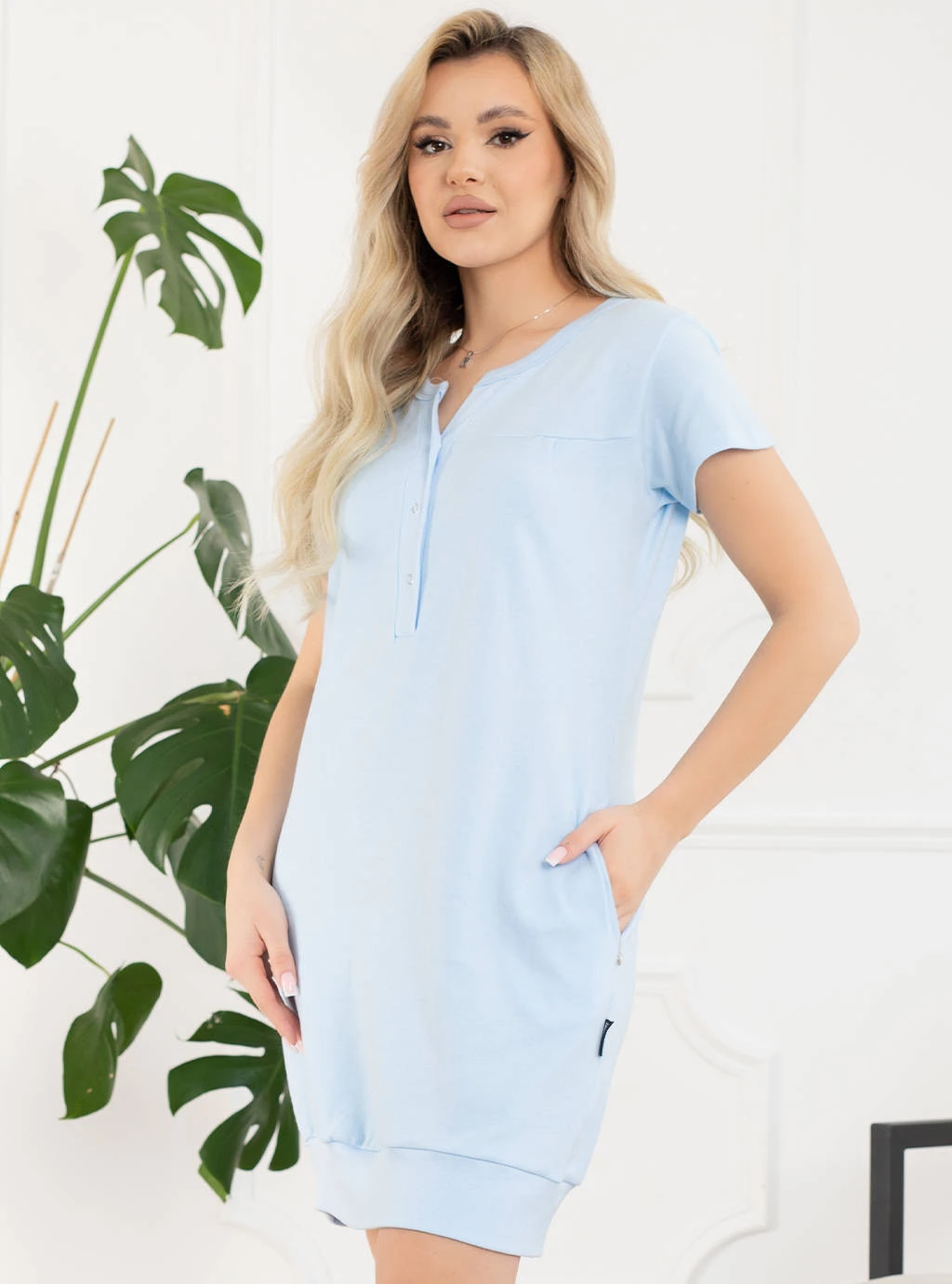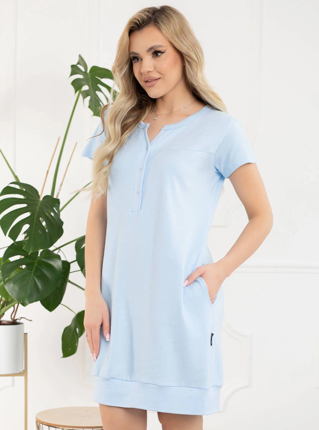 Koszule nocne Sunny to uszyte w Polsce wysokiej jakości koszule do porodu dla Pań w ciąży. Koszula ciążowa w ślicznym pastelowym odcieniu błękitu z maleńkimi zakładkami w okolicy piersi i ładnym ściągaczem u dołu. W kształcie przypomina sukienkę bombkę i spokojnie może zastąpić różne ubrania ciążowe od bluzek po tuniki. Koszula do karmienia rozpinana na napy bezniklowe nie uczula mamy i dziecka. Dodatkowym atutem jaki posiadają pastelowe produkty z serii Sunny są małe kieszonki które pozwolą ogrzać ręce lub schować różne drobiazgi.