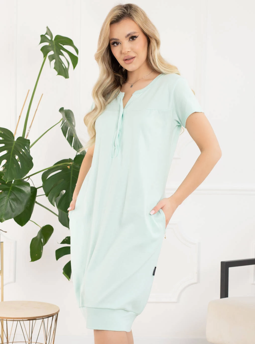 Koszule ciążowe w odcieniach klasycznych i ślicznych letnich pastelach z najlepszej bawełnianej tkaniny. Sunny koszula miętowa została uszyta w kształcie tradycyjnej bombki na ładnym karczu z drobnymi zaszewkami u góry i delikatnym ściągaczem u dołu koszuli. Przyszła mama będzie zachwycona ponieważ model ma wszyte kieszonki w których możesz pochować różne drobiazgi ciążowe. Koszule nocne Sunny dzięki swojemu ponadczasowemu krojowi z powodzeniem zastąpią różne ubrania ciążowe np. tuniki czy cienkie bluzy.