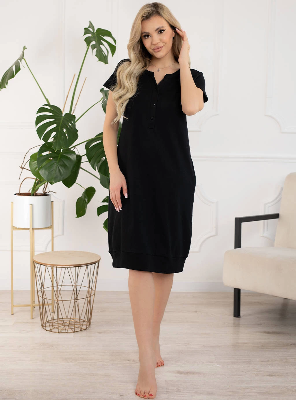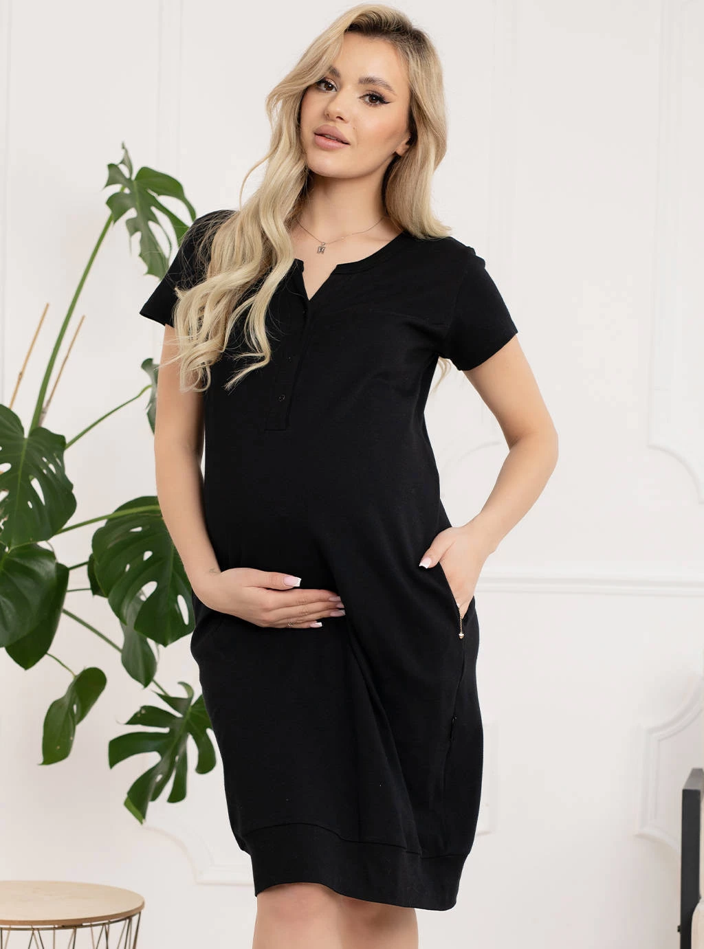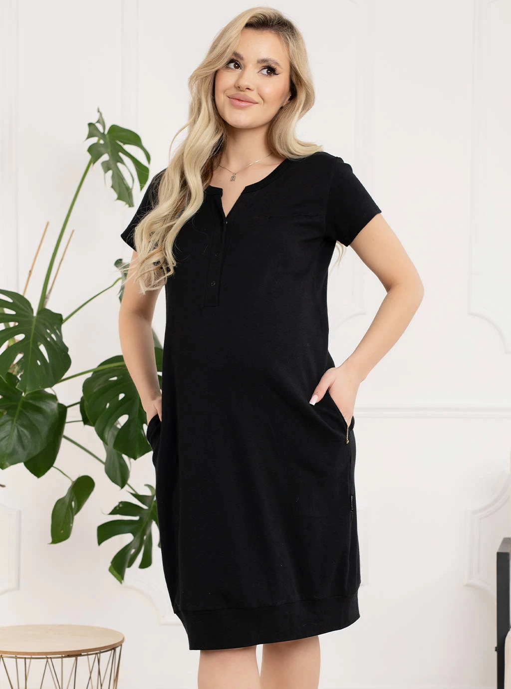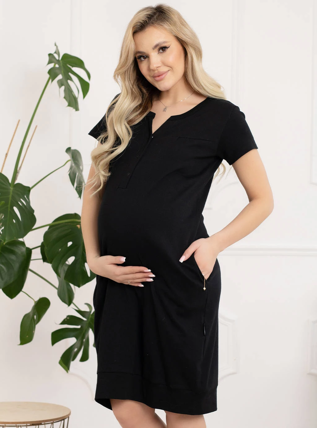 Koszula ciążowa w kolorze czerni o wygodnym kroju sukienki bombki. Koszula Sunny dołem ma wszyty ściągacz a górą śliczne zaszewki. Koszule do porodu w kolekcji Sunny o długości midi to delikatne pastele lub klasyczne kolory, wykonane z bawełny w jakości premium dla waszej wygody posiadają kieszenie oraz bezniklowe zatrzaski żeby ułatwić karmienie piersią. Wybierając Sunny w kolorze czerni, bez problemu możesz zastąpić ubrania ciążowe typu sukienka czy tunika i nadal wyglądać atrakcyjnie i kobieco. Już dziś zaznaj komfortu i wygody bawełnianej tkaniny która dopasuje się do zmieniającego ciała i rosnących piersi.