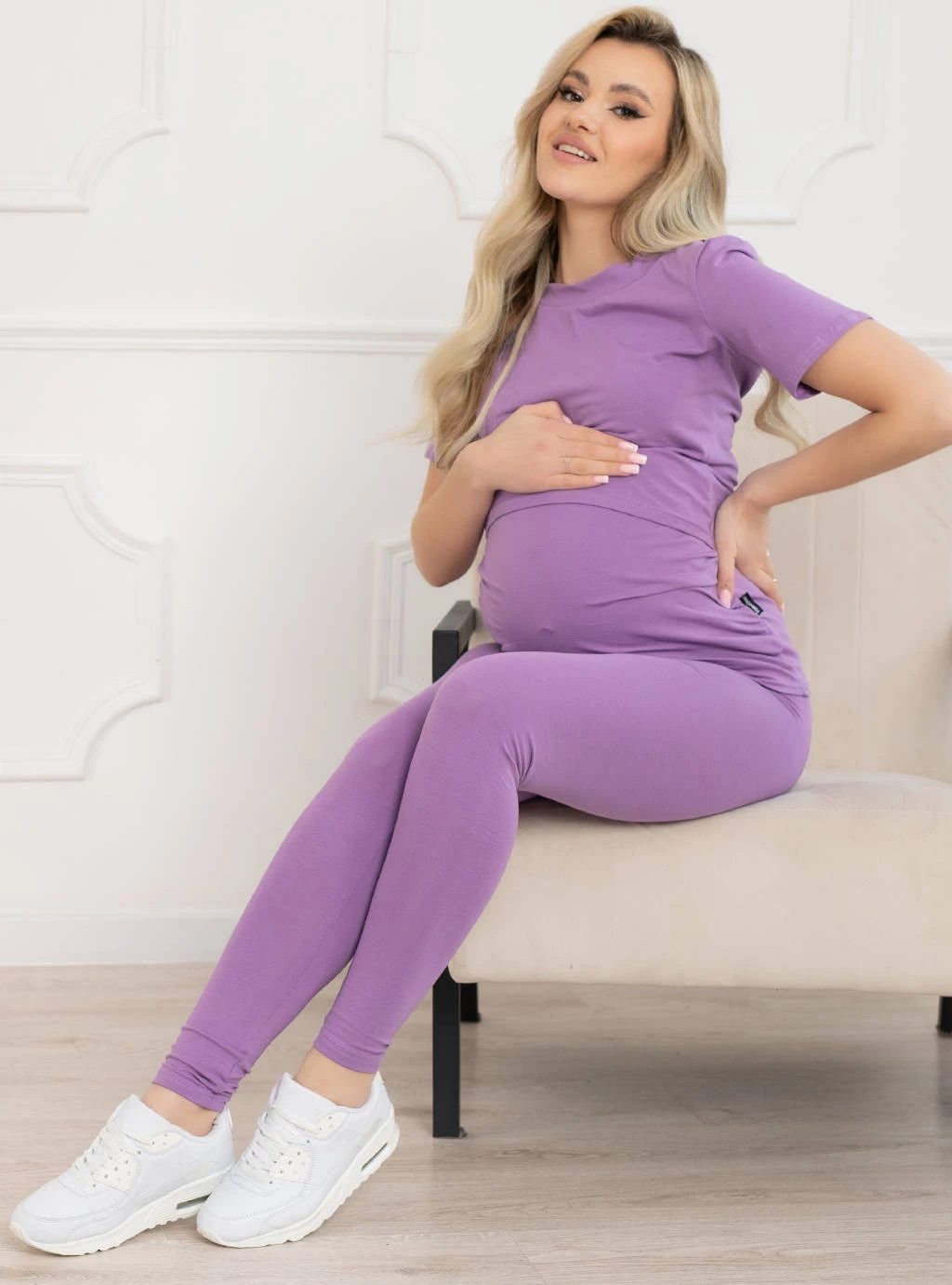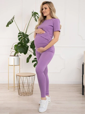Fioletowy zestaw dla kobiet w ciąży zachwyci na pewno spore grono kobiet. Komplet Euphoria składa się z bluzki z krótkim rękawem i z legginsów z panelem ciążowym pod brzuch w tym samym kolorze.
