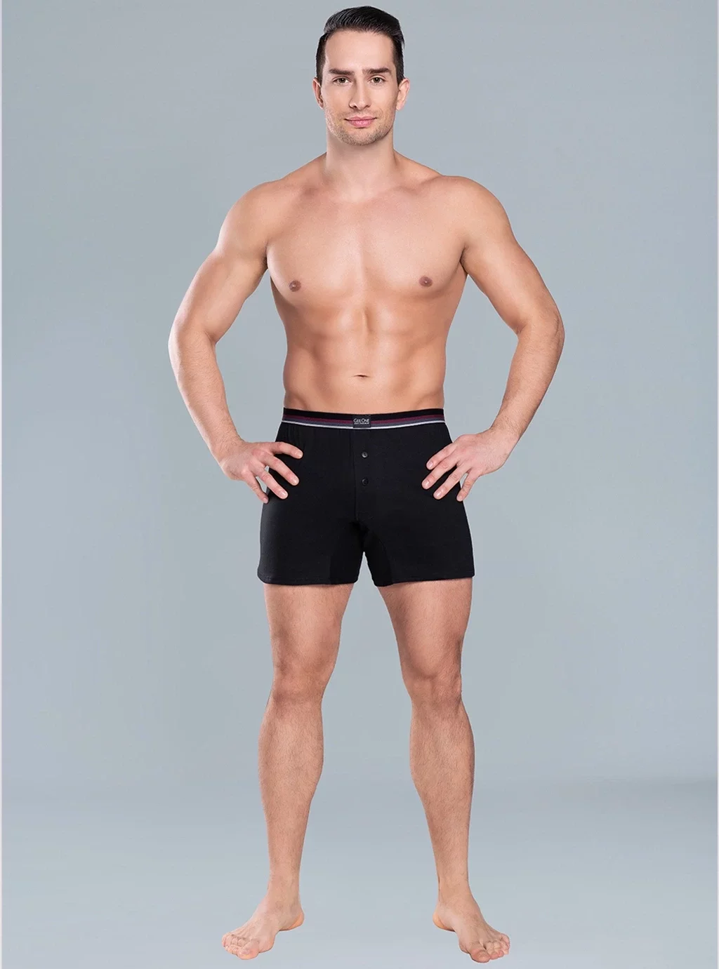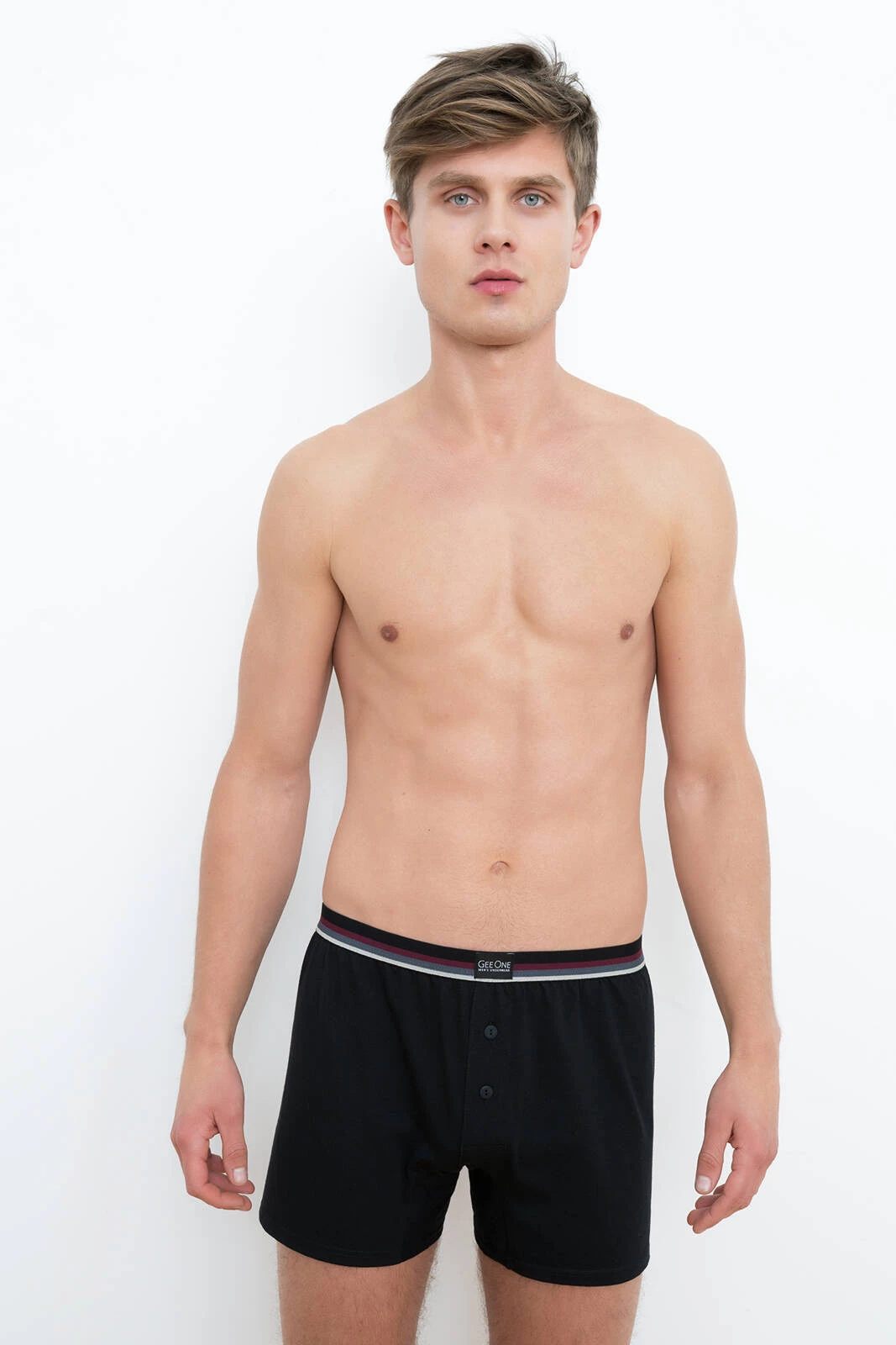 • Wykończenie: Bokserki o luźnej linii z bezuciskową ozdobną gumą, zapinane na guziki.