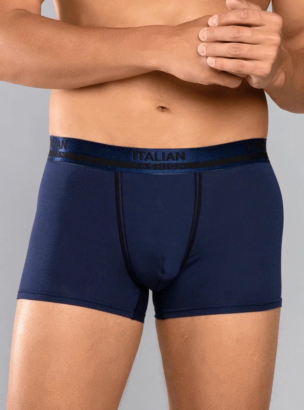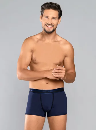 Zwróćcie uwagę na klasyczny granatowy kolor, który nadaje temu produktowi nowoczesnego wyglądu. Kontrastowe czarne szwy i modny pasek z napisem "Italian Fashion" podkreślają ich stylowy charakter. Klasyczny krój zapewnia wygodę noszenia, a jednocześnie doskonale uwydatnia męską sylwetkę. Dzięki zastosowaniu wiskozy i elastanu, bokserki są niezwykle miękkie i przyjemne w dotyku. Elastyczny pas zapewnia pewne trzymanie, a jednocześnie jest na tyle delikatny, że nie uciska brzucha. Dzianina użyta do uszycia tych komfortowych bokserek jest lekka i elastyczna, dzięki czemu męskie bokserki idealnie przylegają do ciała, zapewniając pełną swobodę ruchów.