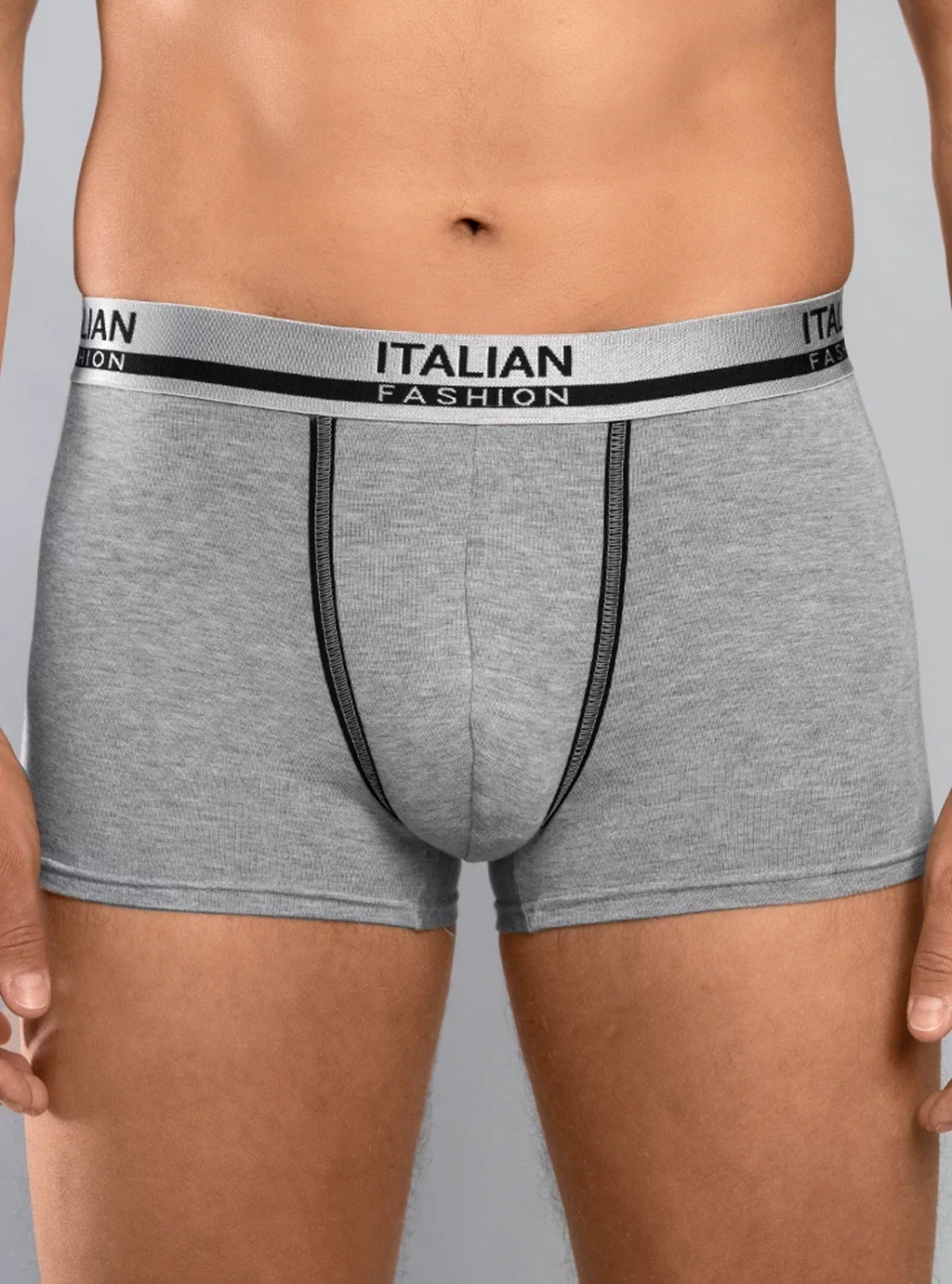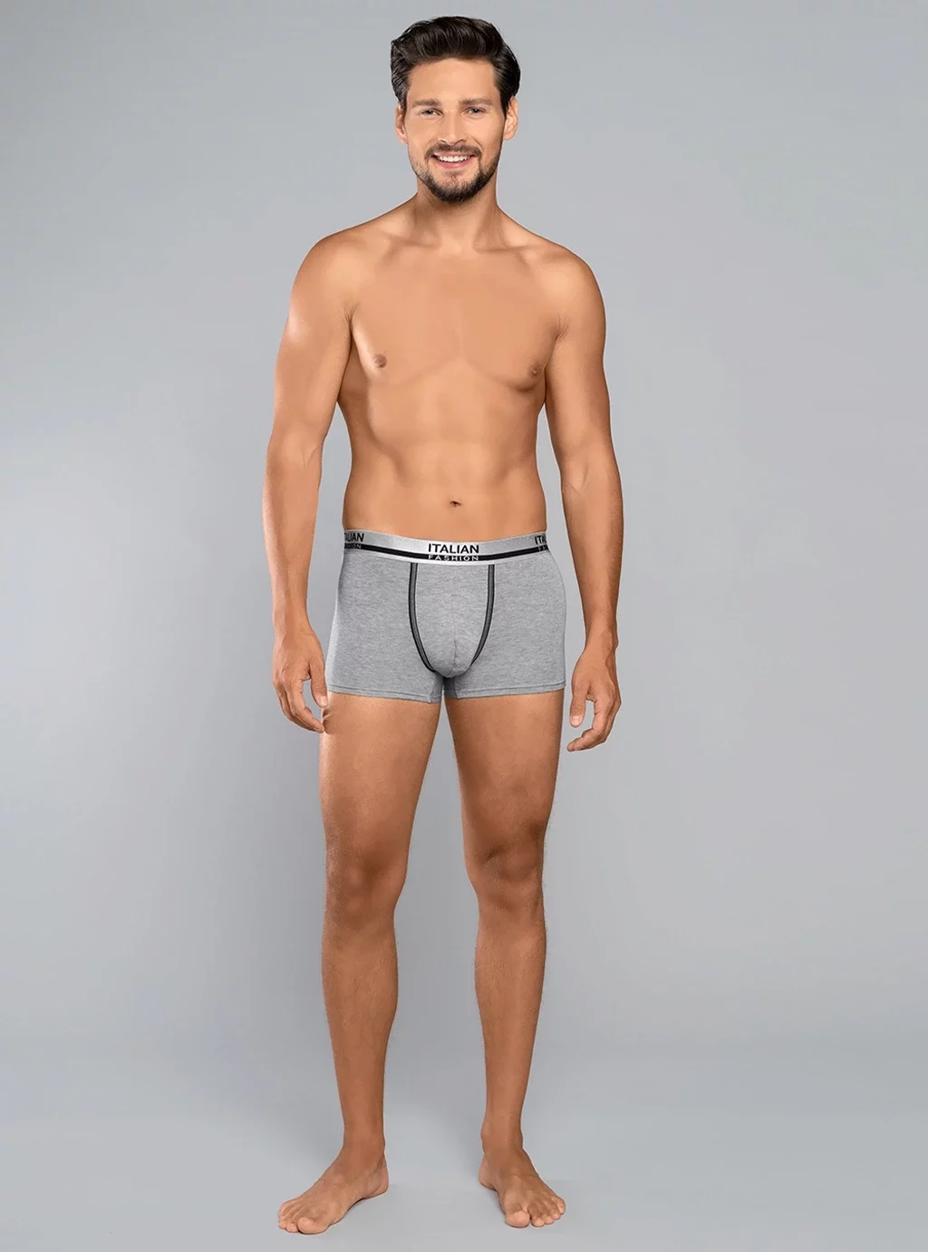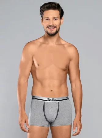 Zwróćcie uwagę na klasyczny szary kolor, który nadaje temu produktowi nowoczesnego wyglądu. Kontrastowe czarne szwy i modny pasek z napisem "Italian Fashion" podkreślają ich stylowy charakter. Klasyczny krój zapewnia wygodę noszenia, a jednocześnie doskonale uwydatnia męską sylwetkę. Dzięki zastosowaniu wiskozy i elastanu, bokserki są niezwykle miękkie i przyjemne w dotyku. Elastyczny pas zapewnia pewne trzymanie, a jednocześnie jest na tyle delikatny, że nie uciska brzucha. Dzianina użyta do uszycia tych komfortowych bokserek jest lekka i elastyczna, dzięki czemu męskie bokserki idealnie przylegają do ciała, zapewniając pełną swobodę ruchów.
