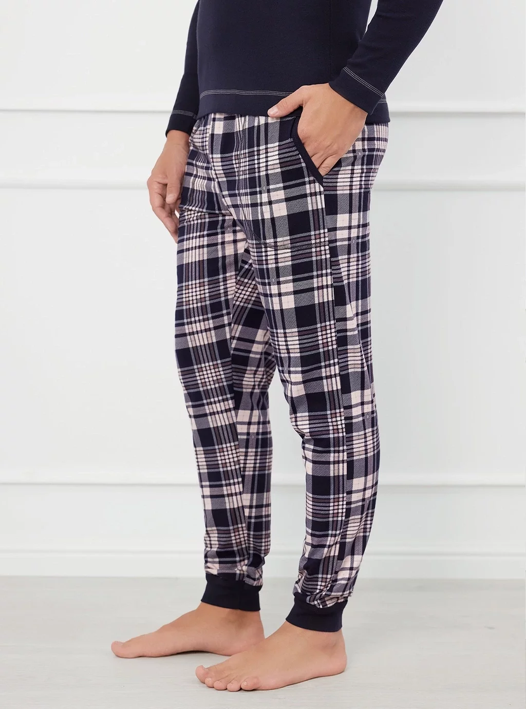 Prezentowana piżama męska posiada prosty, wygodny fason. Górna część to bluzka z okrągłym dekoltem z lamówką i długim rękawem. Utrzymana jest ona w jednolitym kolorze, u dołu widoczne jest zaś modne przeszycie. Komplet uzupełniają spodnie pokryte klasycznym wzorem w kratę. Po bokach mają dwie praktyczne kieszenie. Model sprawdzi się również jako piżama młodzieżowa.