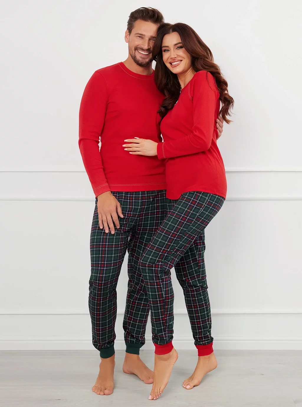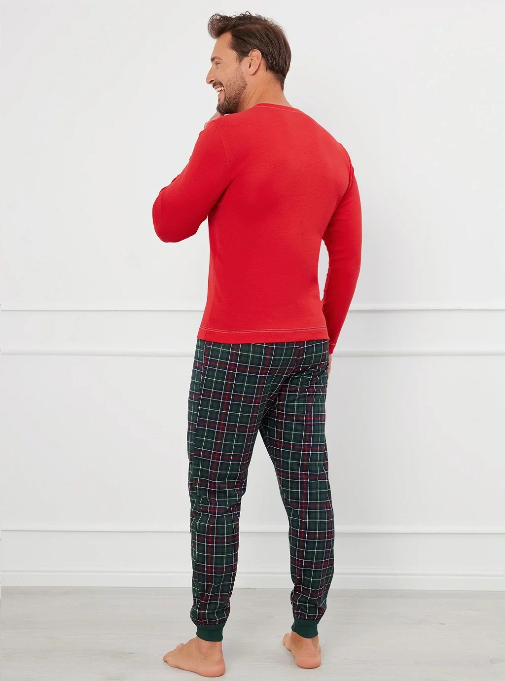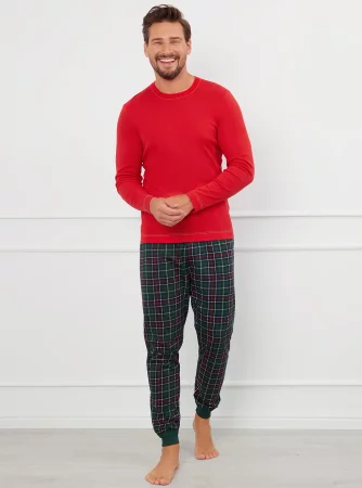 Wygodna męska piżama o lekko dopasowanej linii, idealna na każdą noc. Bluza w jednolitym kolorze z klasycznym okrągłym dekoltem wykończonym kontrastowym przeszyciem zapewnia wygodę i swobodę ruchów. Spodnie z modnym wzorem w kratę, zakończone praktycznymi ściągaczami na dole, zapobiegają podwijaniu się nogawek, co zapewnia dodatkowy komfort podczas snu. Wykonana z wysokiej jakości, miękkiej bawełny.