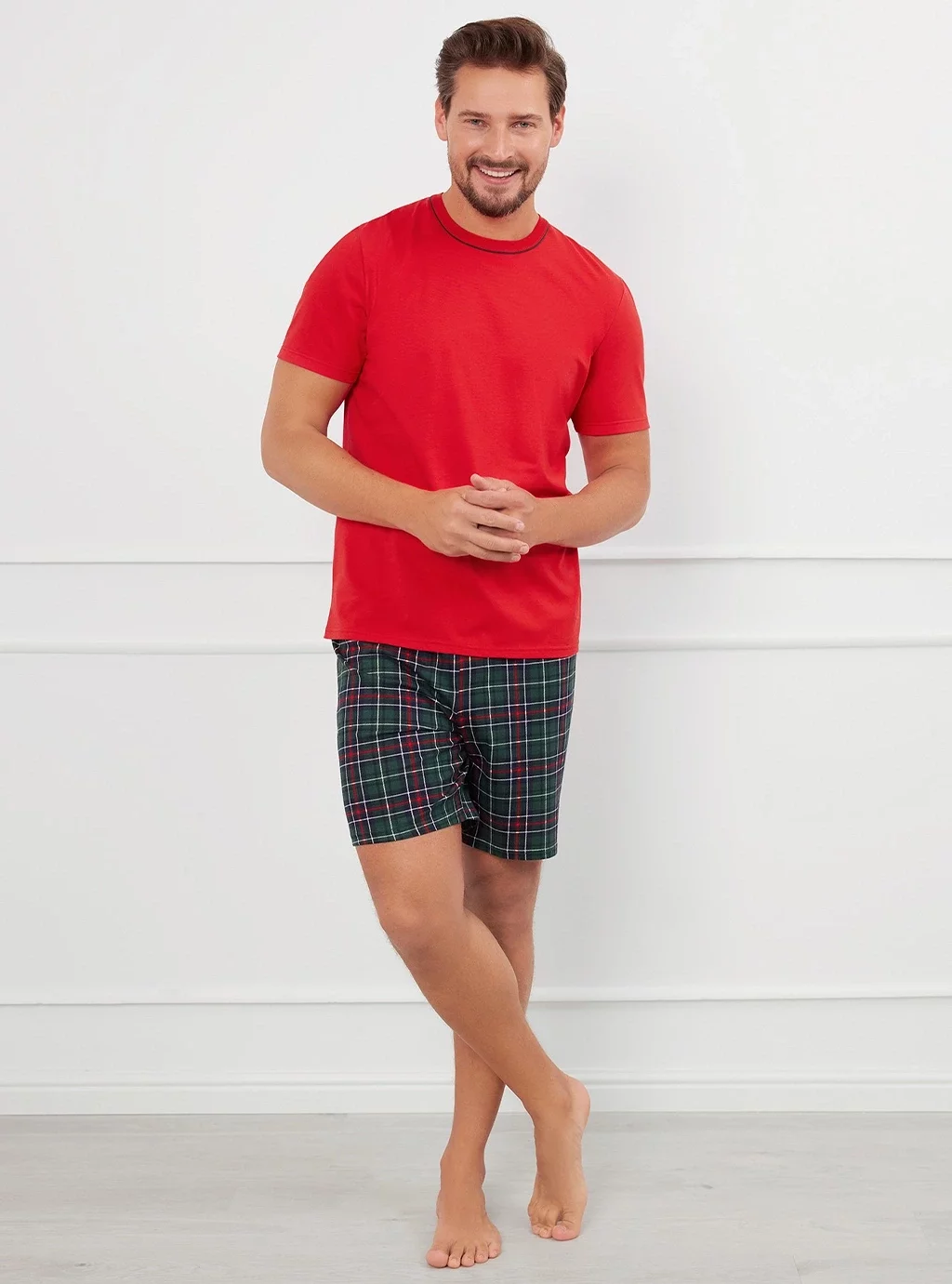 Krótka piżama męska to rozwiązanie dla mężczyzn, dla których komfort jest kwestią priorytetową. Uszyta została z miękkiej bawełny. Posiada klasyczny, wygodny fason. Pierwsza jej część to jednolita koszulka z krótkim rękawem oraz okrągłym dekoltem, obszytym kontrastową nicią. Druga część to luźne, krótkie spodenki ozdobione ponadczasowym wzorem w kratę.