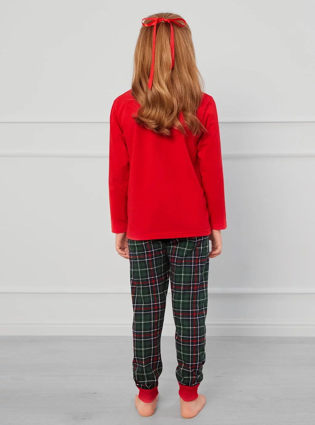 Piżama dziecięca o prostej linii składa się z bluzki w jednolitym kolorze z okrągłym dekoltem oraz spodni w kratkę zakończonych praktycznymi ściągaczami. Klasyczny krój nie krępuje ruchów, a wysokiej jakości, miękka tkanina jest przyjazna dla skóry, gwarantując ciepło i wygodę przez całą noc.