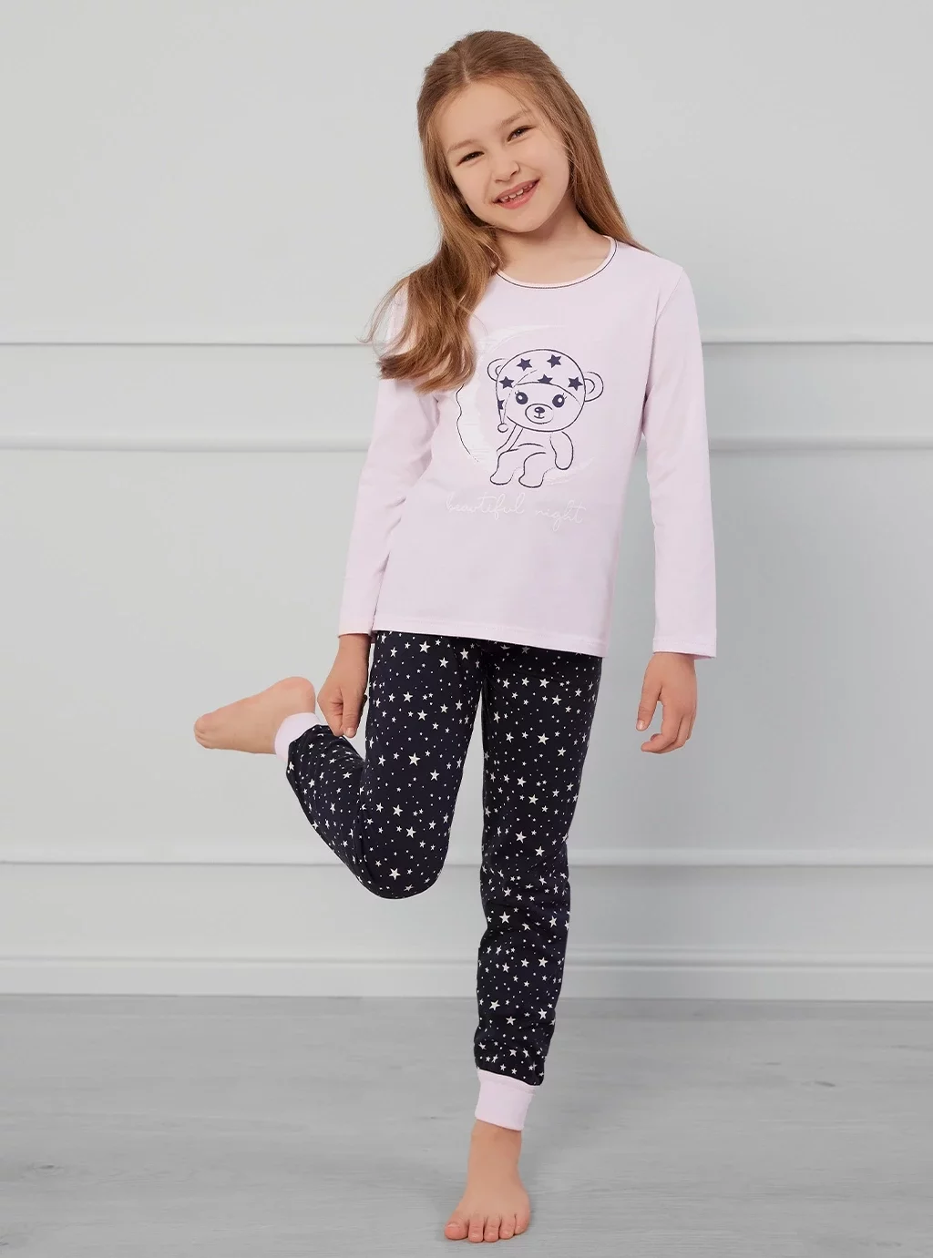 Prezentowana piżama dziewczęca posiada prosty, klasyczny, zapewniający wygodę fason. Górę stanowi bluzka z długim rękawem i okrągłym dekoltem obszytym lamówką. Wyróżnia ją nadruk z misiem siedzącym na księżycu. Wykonany on został techniką sitodruku, który zapewnia wysoki poziom trwałości. Całości dopełniają długie spodnie pokryte wzorem w gwiazdki. Zakończone są one komfortowymi ściągaczami.