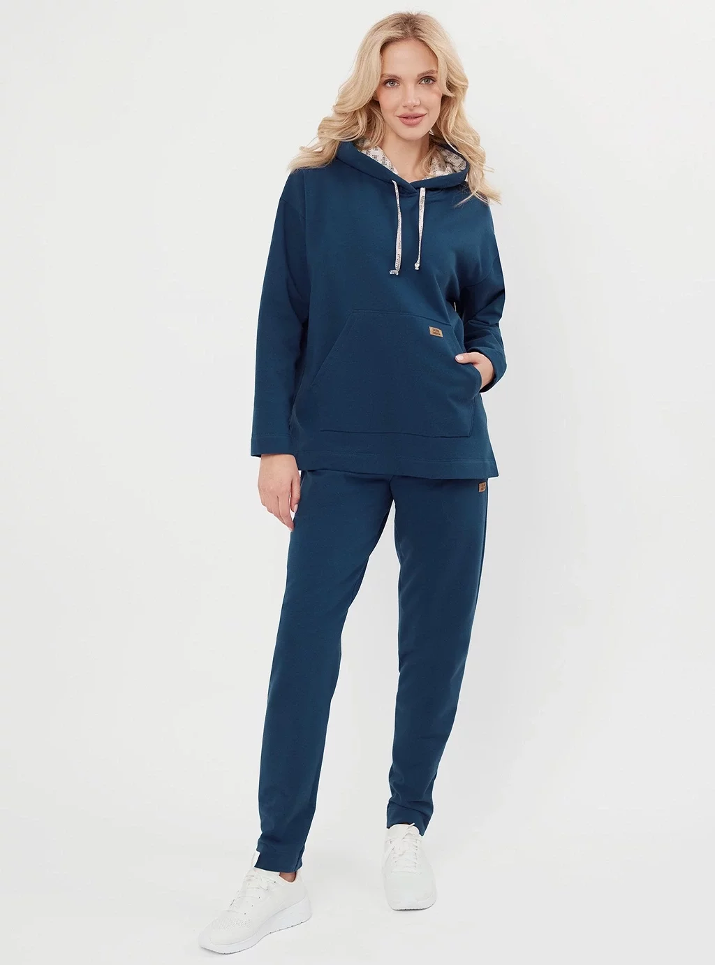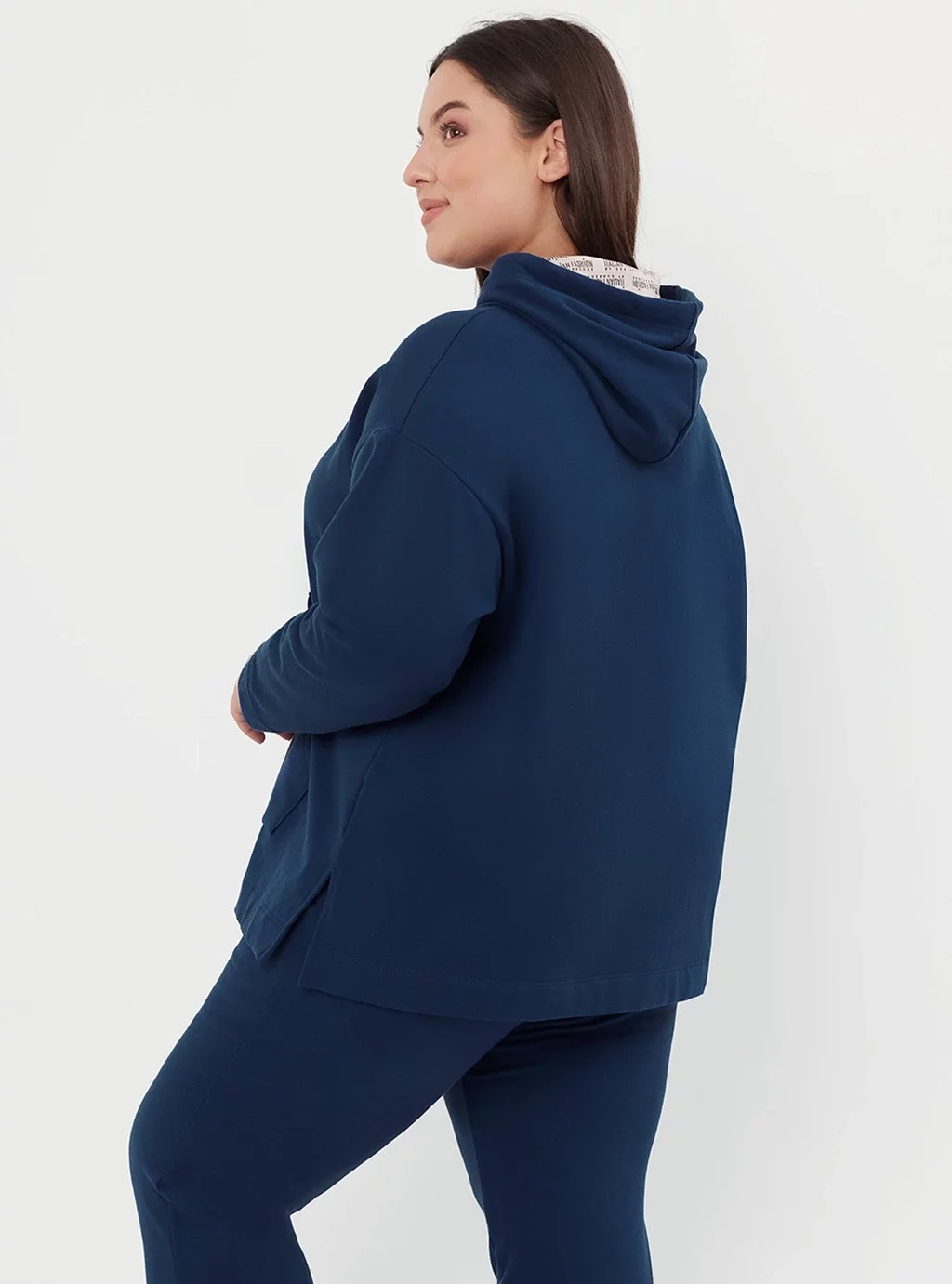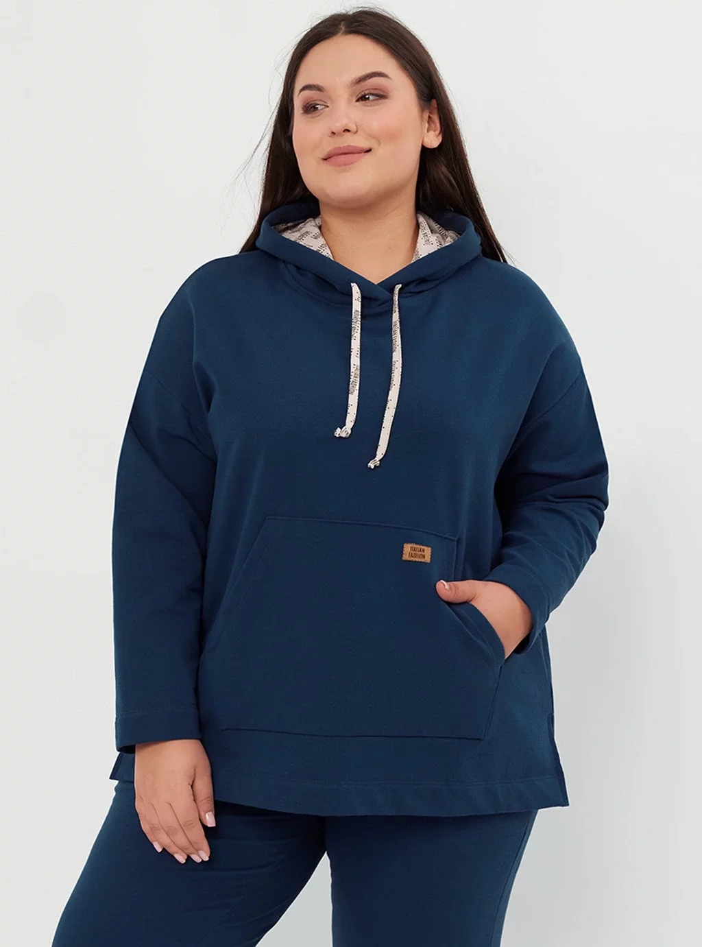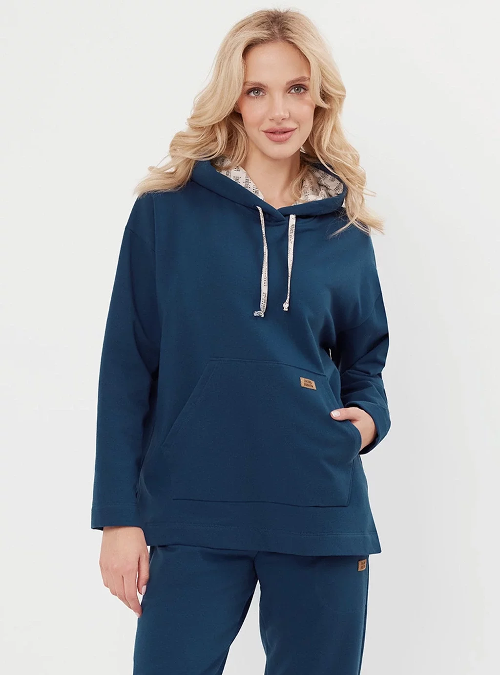 Bluza o luźnej linii z kapturem. Kaptur wykończony firmowym printem. Na przodzie duża kieszeń typu kangurka z firmową naszywką. W dole, po bokach bluzy rozporki.