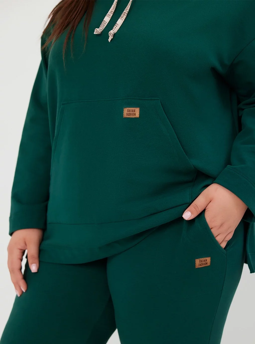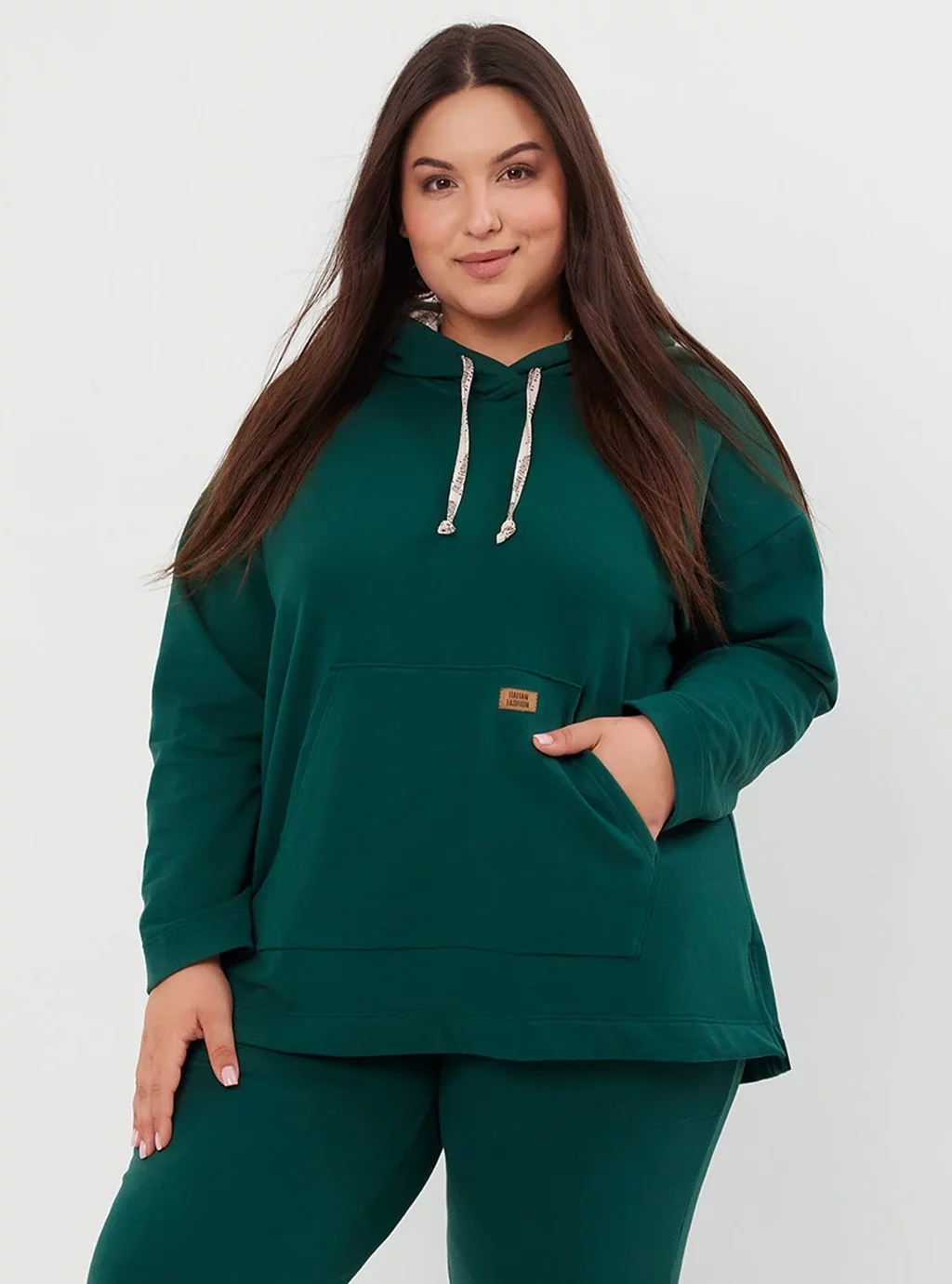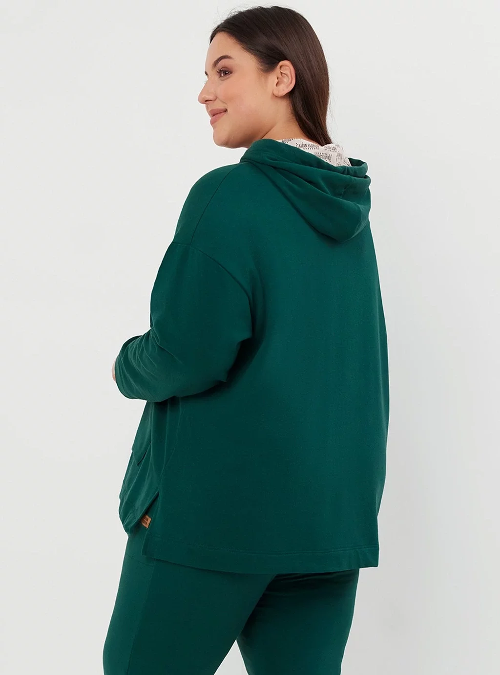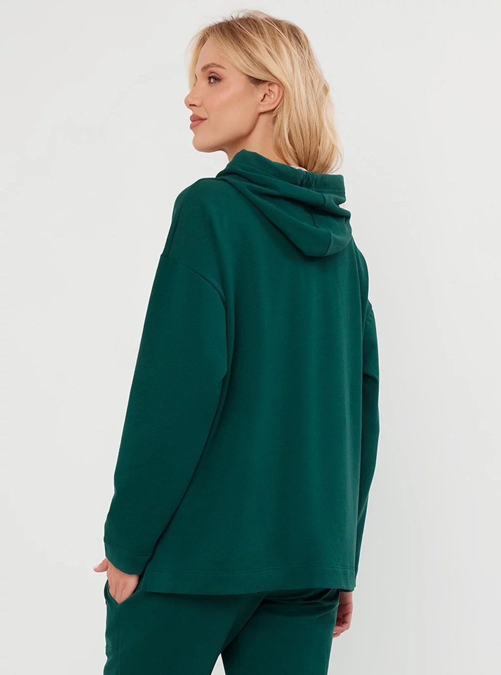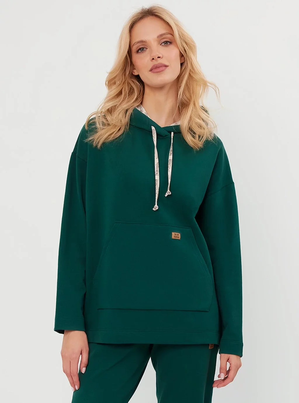 Bluza o luźnej linii z kapturem. Kaptur wykończony firmowym printem. Na przodzie duża kieszeń typu kangurka z firmową naszywką. W dole, po bokach bluzy rozporki.
