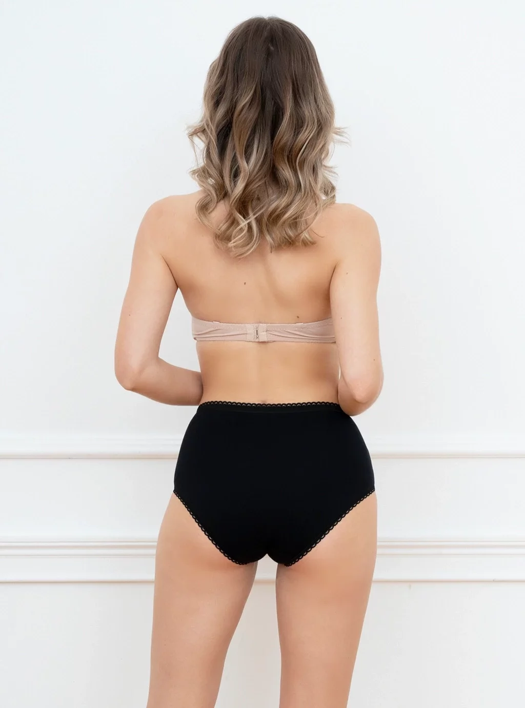 Figi o klasycznej linii. W przodzie ozdobna koronka. W talii i nogawkach ozdobna, nieuciskająca gumka.
