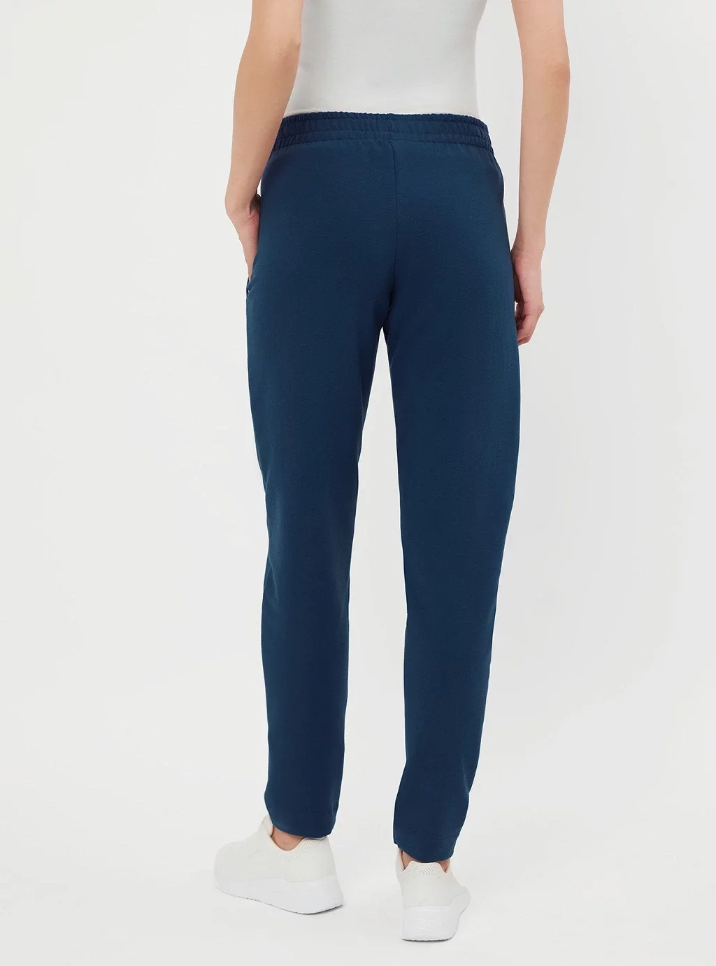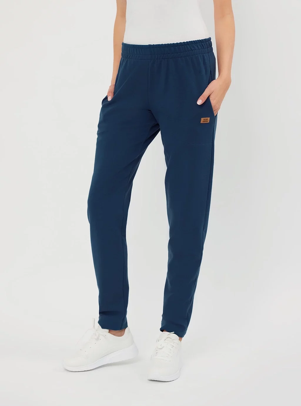 Spodnie o prostej linii z kieszeniami. W pasie szeroka, nieuciskająca guma w tunelu. Na kieszeni ozdobna naszywka firmowa.
