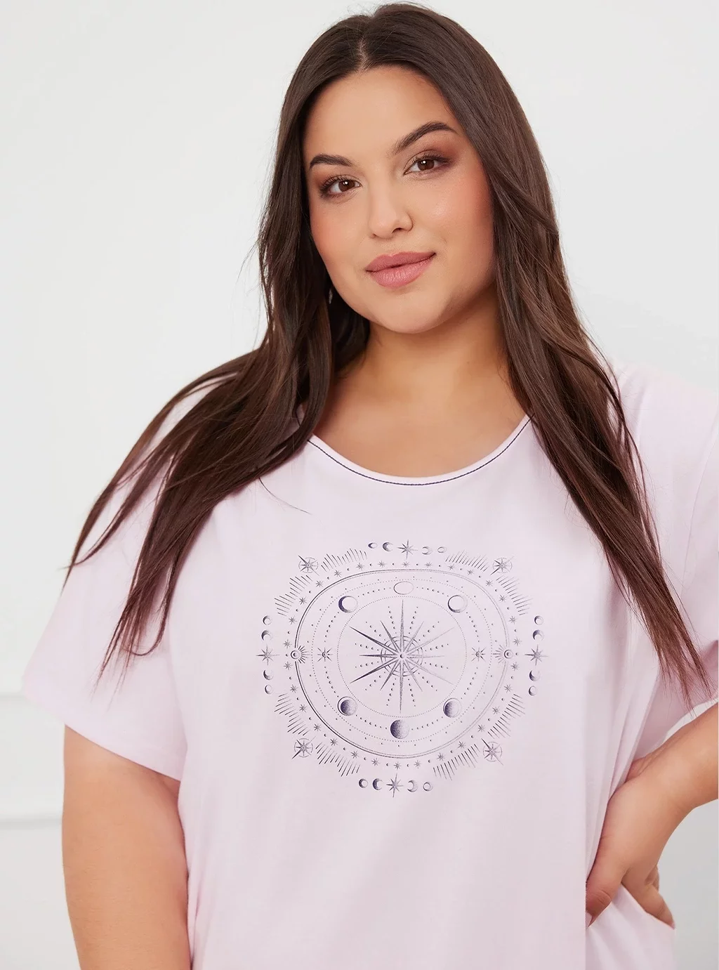Koszula typu T-shirt o prostej linii. W przodzie okrągły dekolt i ozdobny nadruk.