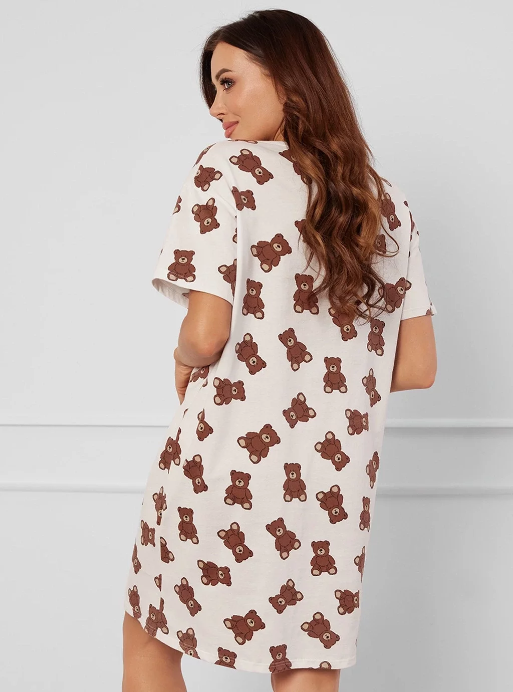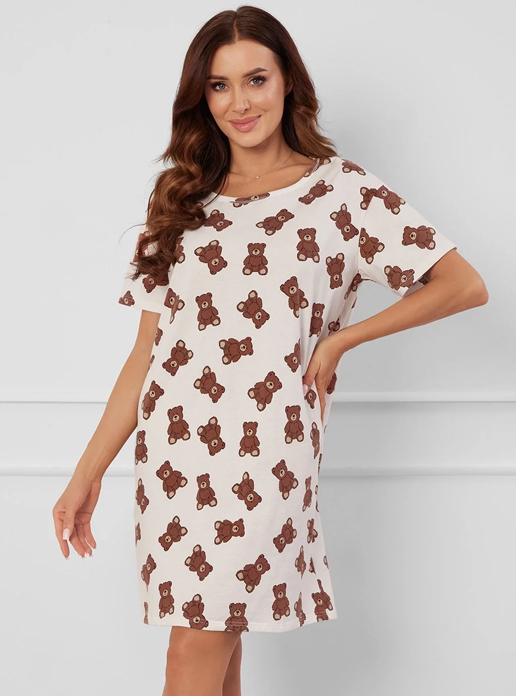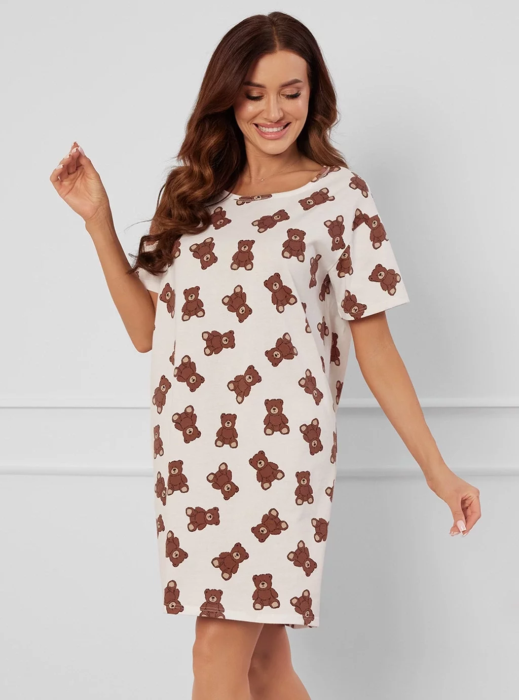 Młodzieżowa koszula nocna w jasnym kolorze i uroczym nadrukiem misiów w stylu T-shirt to świetny wybór dla tych, którzy cenią sobie komfort i swobodę. Dzięki prostej linii zapewnia pełną wygodę podczas snu i relaksu. Klasyczny okrągły dekolt dodaje jej uniwersalnego charakteru. Koszula wykonana jest z miękkiej bawełny, która jest przyjazna dla skóry.
