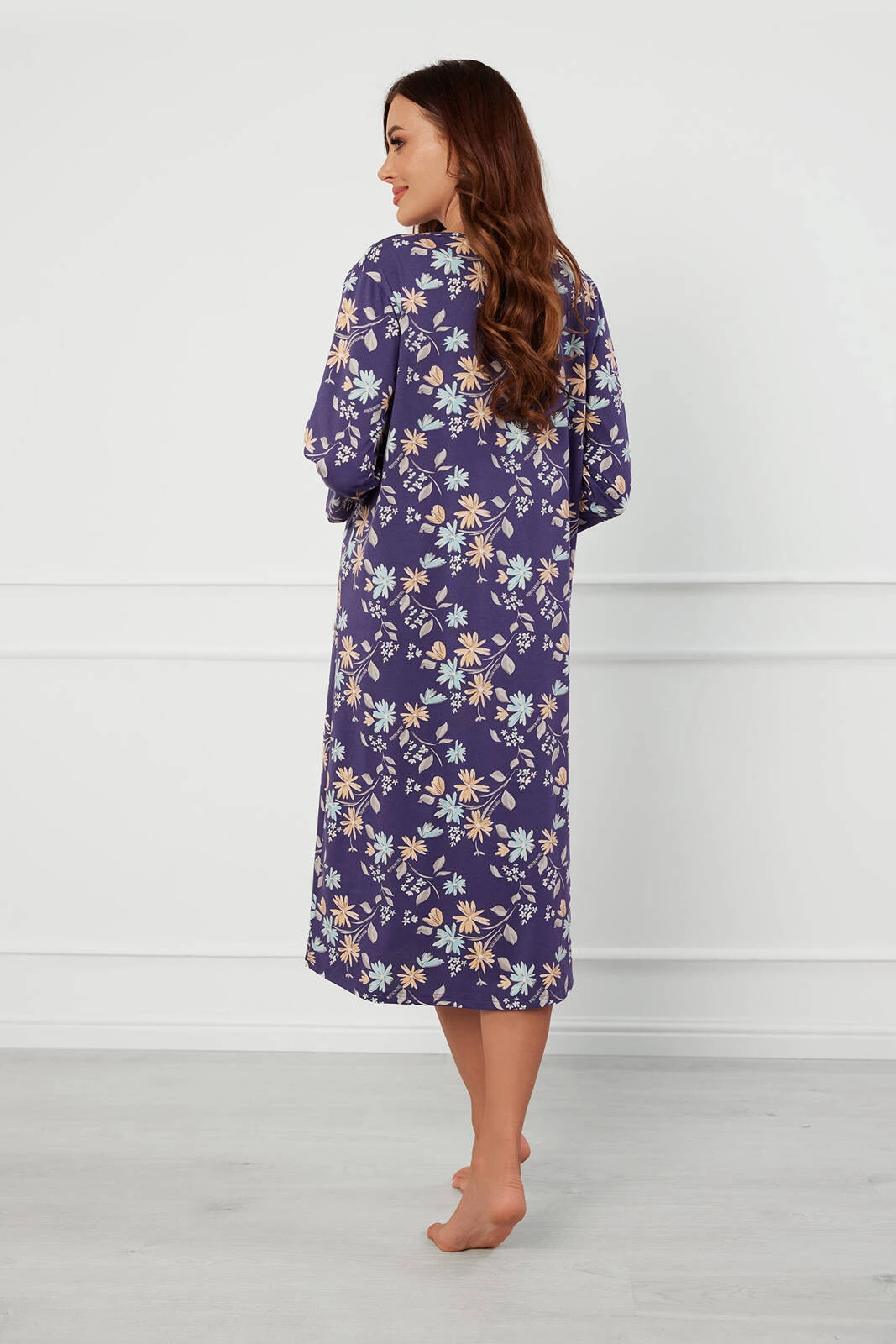 Ta stylowa koszula nocna łączy elegancję z funkcjonalnością, tworząc idealny wybór. Okrągły dekolt dodaje jej klasy, a rękawy o długości ¾ oraz długość sięgająca połowy łydki zapewniają komfort i swobodę ruchów. Kwiatowy wzór subtelnie zdobi całość, nadając jej delikatnego uroku. Wykonana z miękkiej bawełny, która jest przyjemna w dotyku.