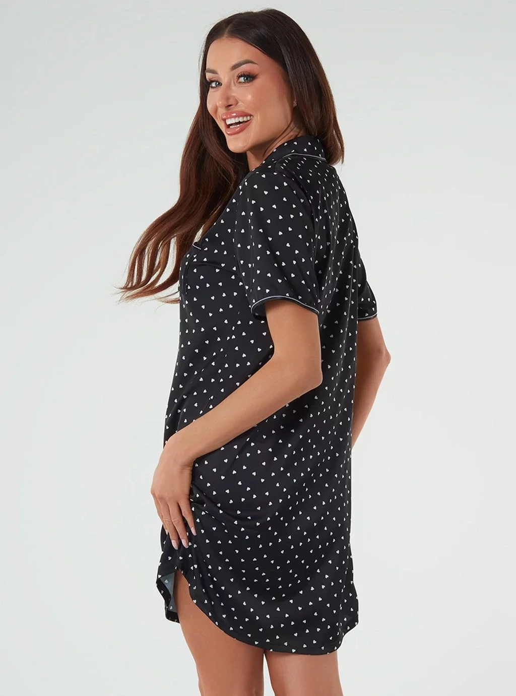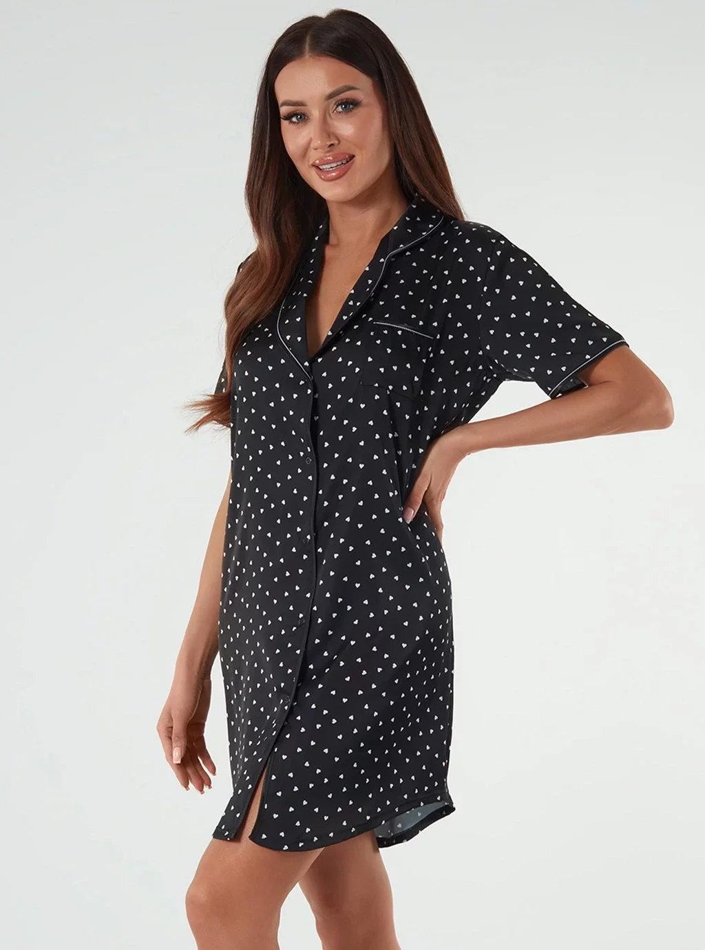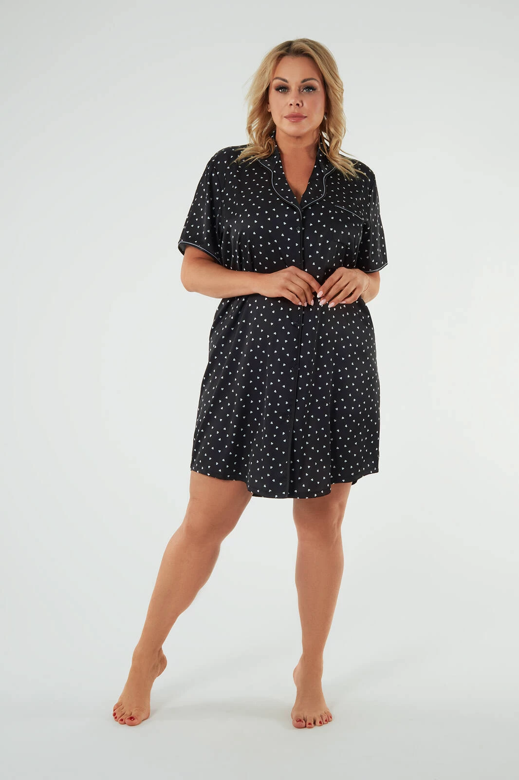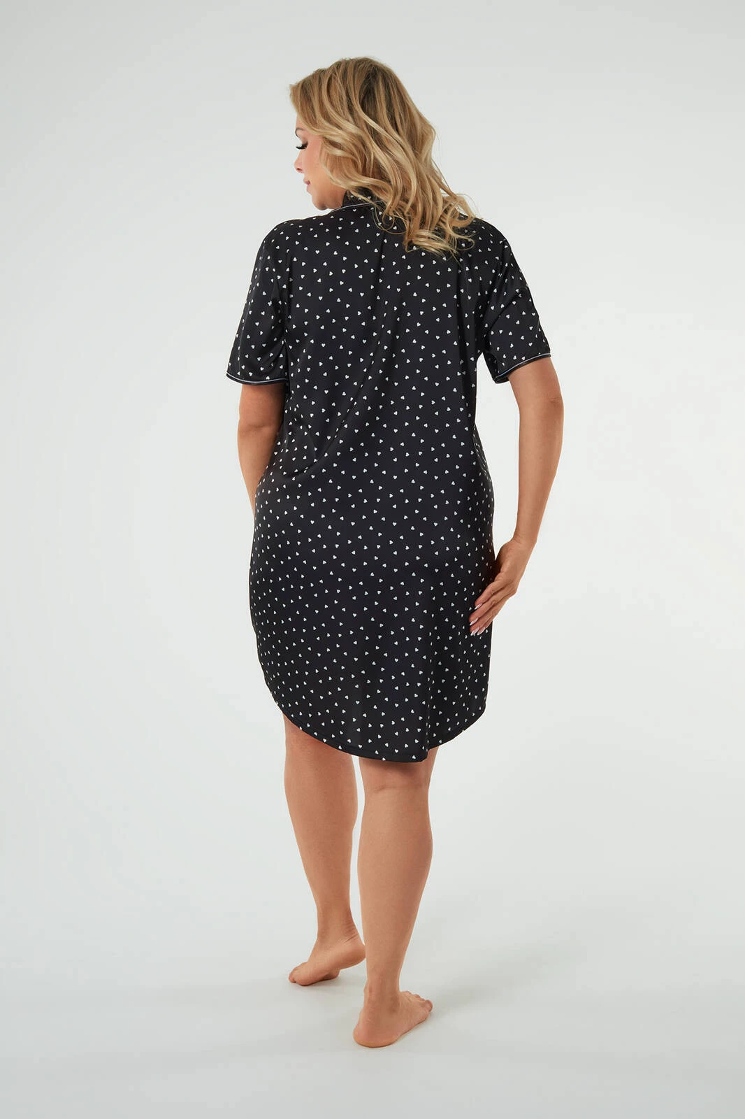 Dekolt w kształcie litery "V", wykończony eleganckim kołnierzykiem z wyrazistą lamówką, podkreśla jej subtelną elegancję, a niewielka kieszonka na przodzie dodaje całości uroku. Urokliwy wzór w serduszka dodaje lekkości, idealnie pasując do wiosennych i letnich nocy. Krótkie rękawy sprawiają, że koszula jest idealna na cieplejsze dni, zapewniając komfort i styl na każdą porę dnia.