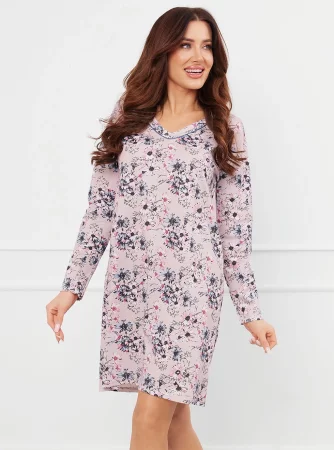 Prezentowana koszula nocna z długim rękawem to połączenie prostoty i funkcjonalności. Jej wygodny, prosty fason sprawia, że jest idealna do nocnego wypoczynku, zapewniając pełną swobodę ruchów. Dekolt w serek pięknie eksponuje szyję, dodając kobiecego uroku, a praktyczna długość do kolan pozwala na komfortowy sen. Koszula została ozdobiona subtelnym florystycznym nadrukiem, który wprowadza delikatny, romantyczny akcent, a jej paleta barw wprowadza przytulną atmosferę. Wykonana z wysokiej jakości bawełny, zapewnia optymalny komfort termiczny, co jest kluczowe dla zdrowego i wygodnego snu. To doskonały wybór na chłodniejsze noce, kiedy komfort i styl idą w parze.