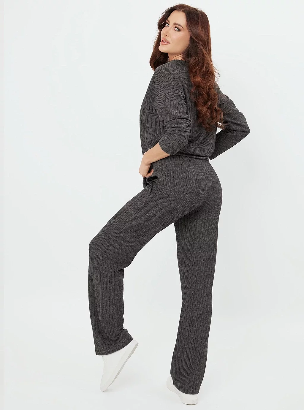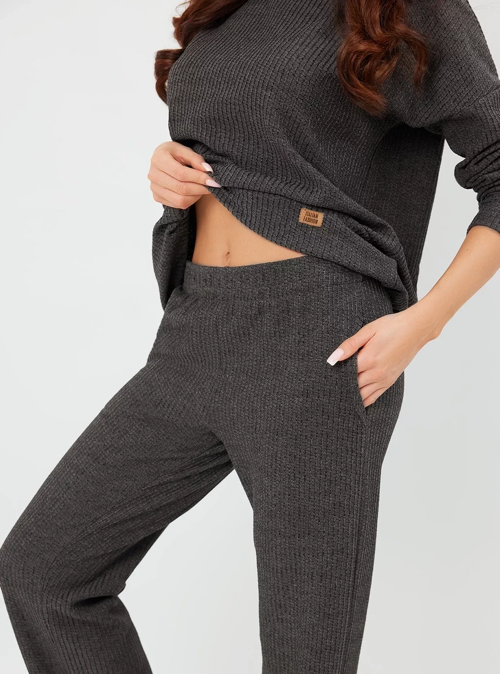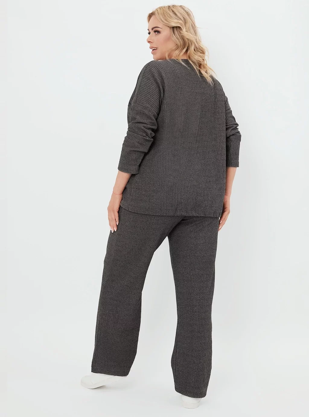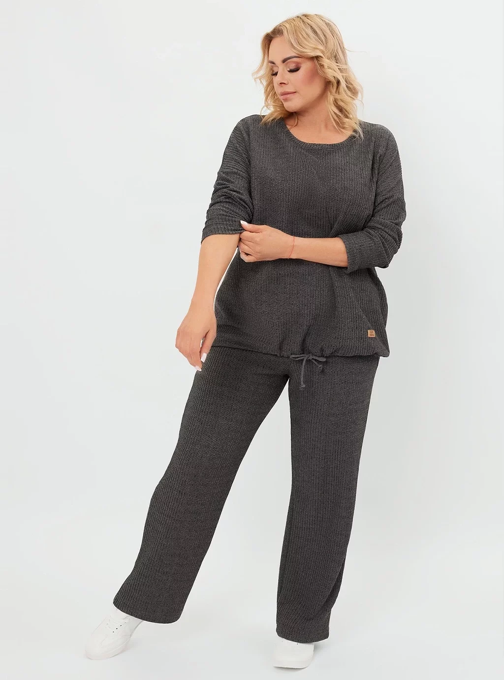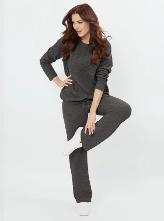 Ten komplet damski to doskonały wybór dla kobiet, które cenią sobie wygodę i styl. Górna część zestawu to bluzka z okrągłym dekoltem i długimi rękawami, wyposażona w praktyczne troczki przy dolnym brzegu, które umożliwiają dopasowanie jej do sylwetki, podkreślając kobiecą formę. Dół stanowią długie spodnie o prostej nogawce, z kieszeniami po bokach oraz elastyczną gumą w pasie, zapewniającą komfort noszenia. Komplet wykonano z 95% dzianiny wiskozowej z 5% poliestru, stworzonej w technologii reliefowej, co nadaje materiałowi modny splot w drobne warkocze. Szczotkowana wewnętrzna strona materiału jest niezwykle miękka i ciepła, co czyni ten zestaw idealnym na chłodniejsze dni, oferując połączenie komfortu i elegancji w codziennych stylizacjach.