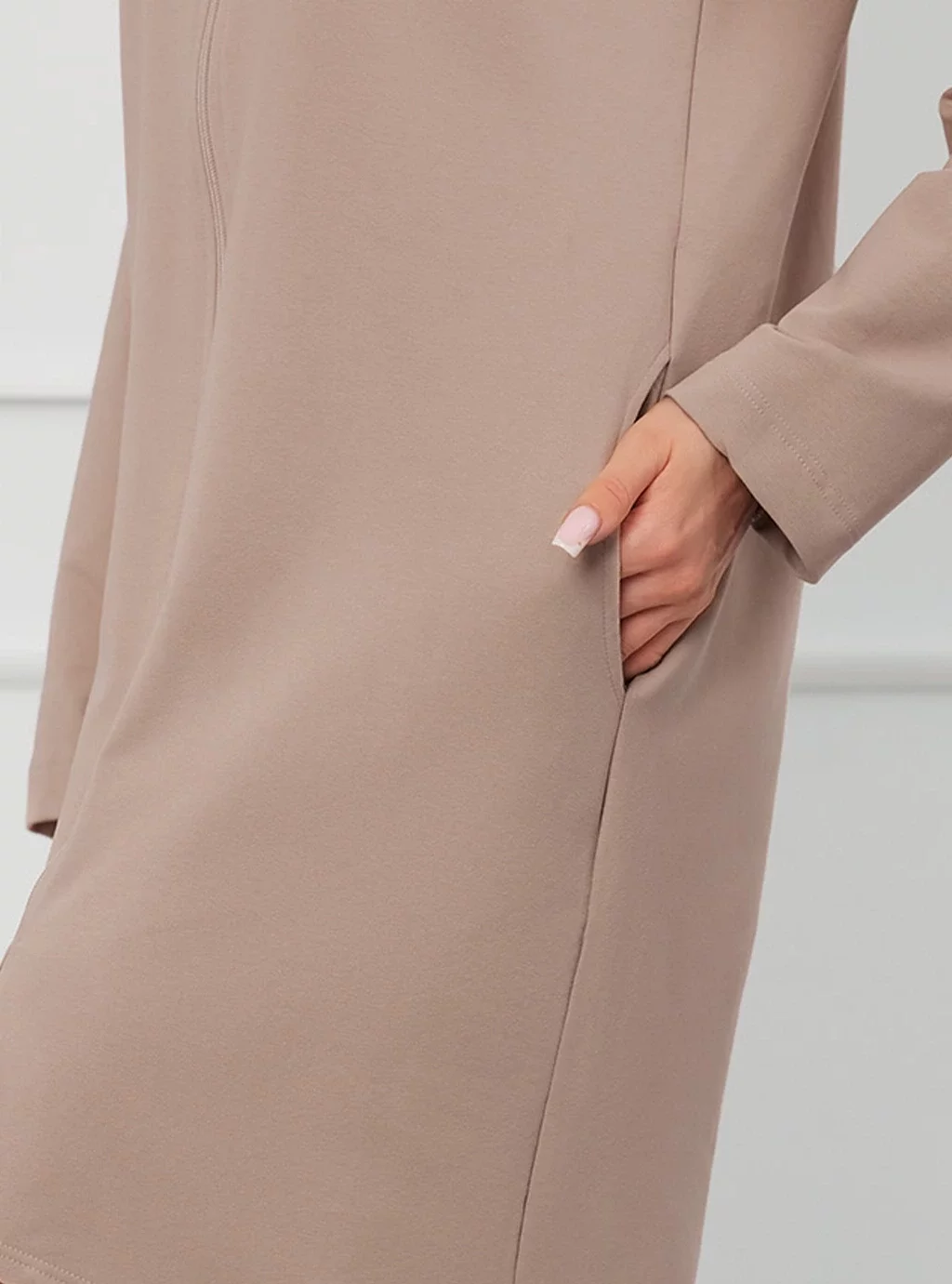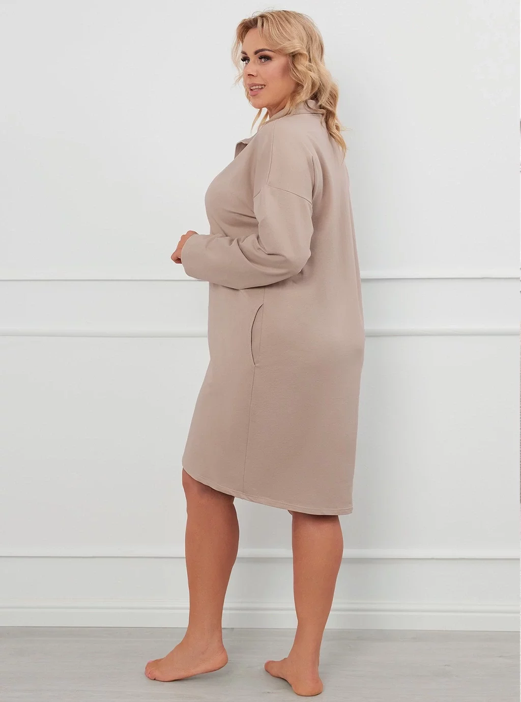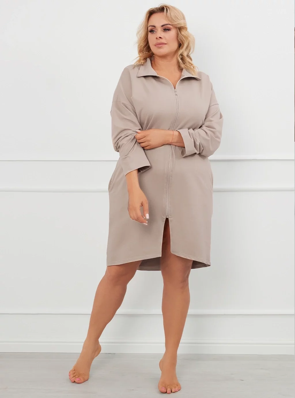 Szlafrok o prostej linii z suwakiem na całej długości przodu. Szlafrok z kieszeniami, przy szyi stójka.