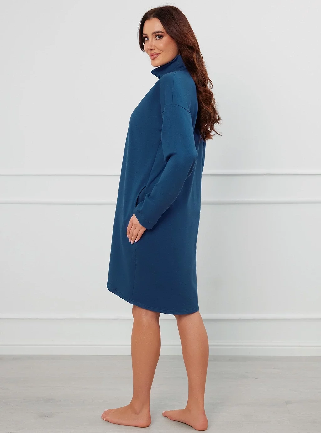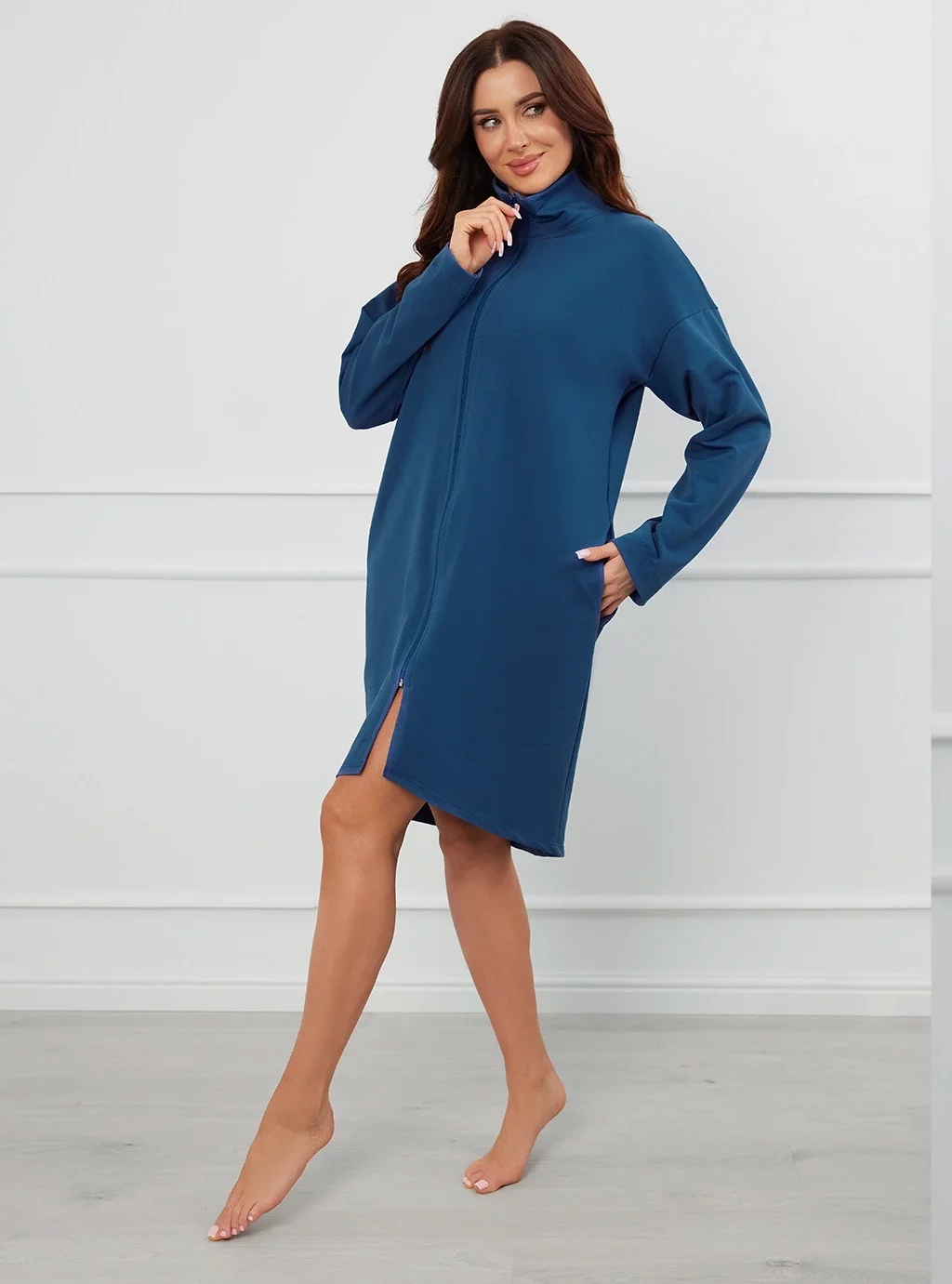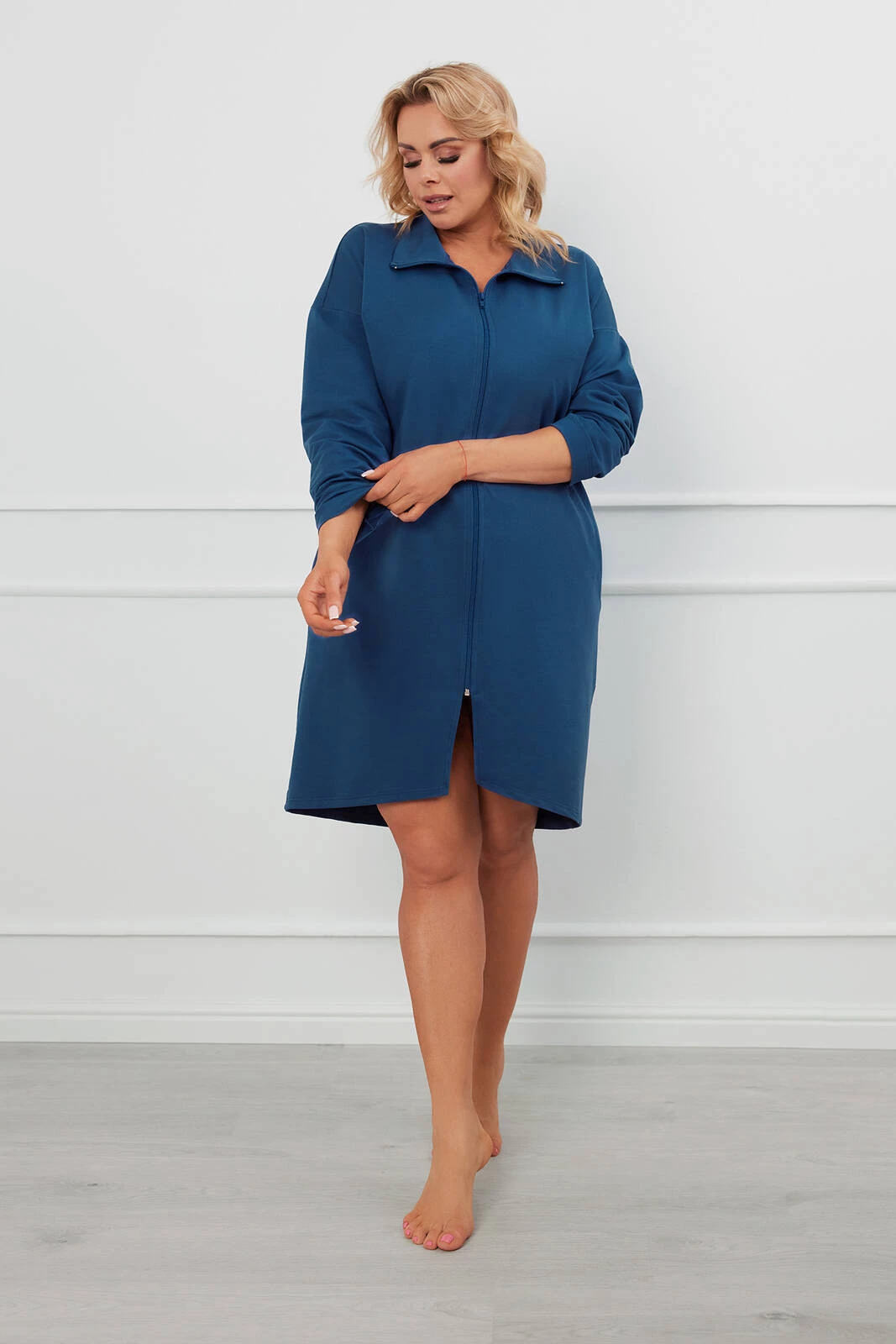 Szlafrok o prostej linii z suwakiem na całej długości przodu. Szlafrok z kieszeniami, przy szyi stójka.