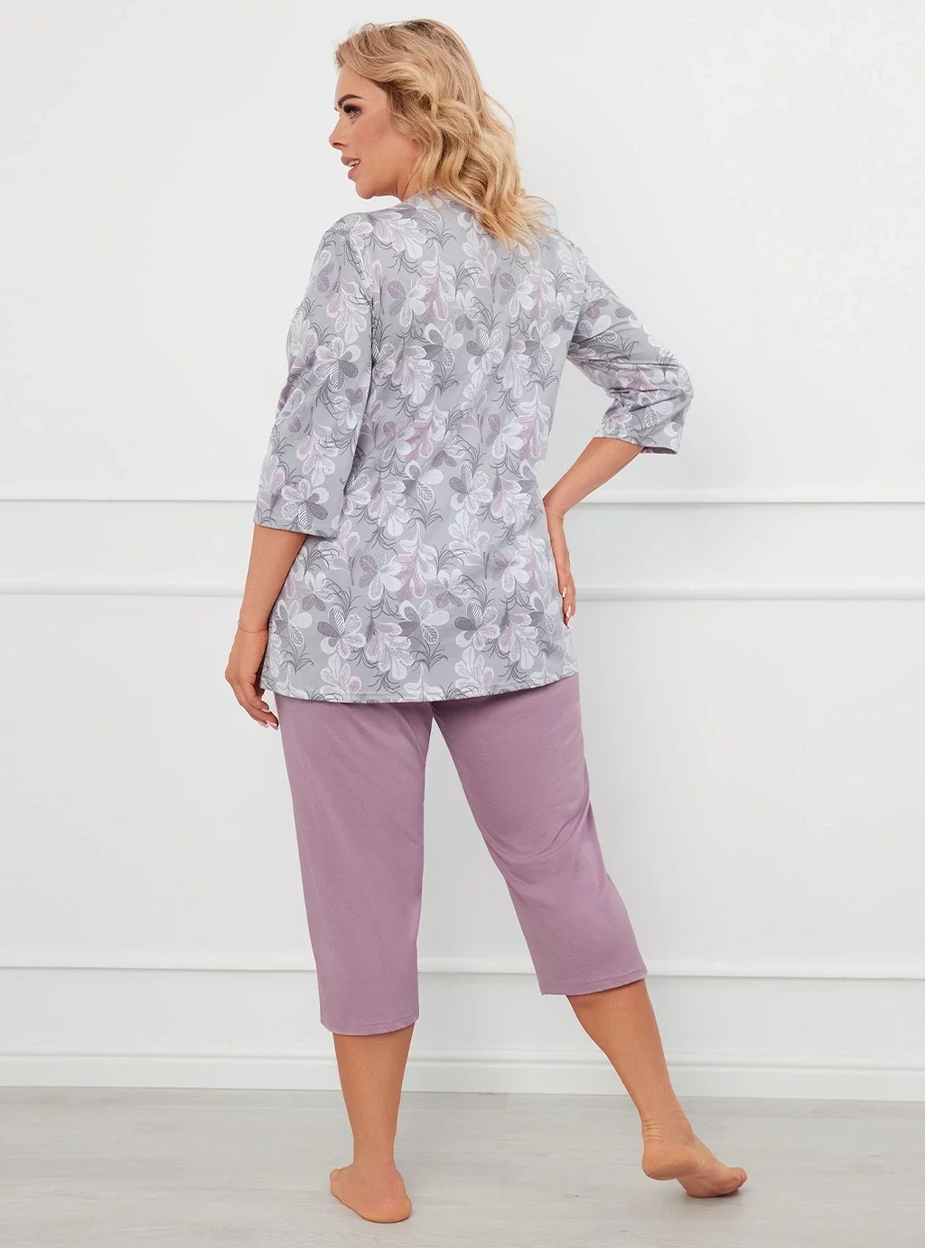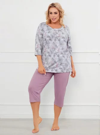 Piżama o luźnej linii. W bluzie okrągły dekolt z marszczeniem, wykończony atłasowym lampasem i kokardką. Spodnie z wygodną, nieuciskającą gumą w tunelu.