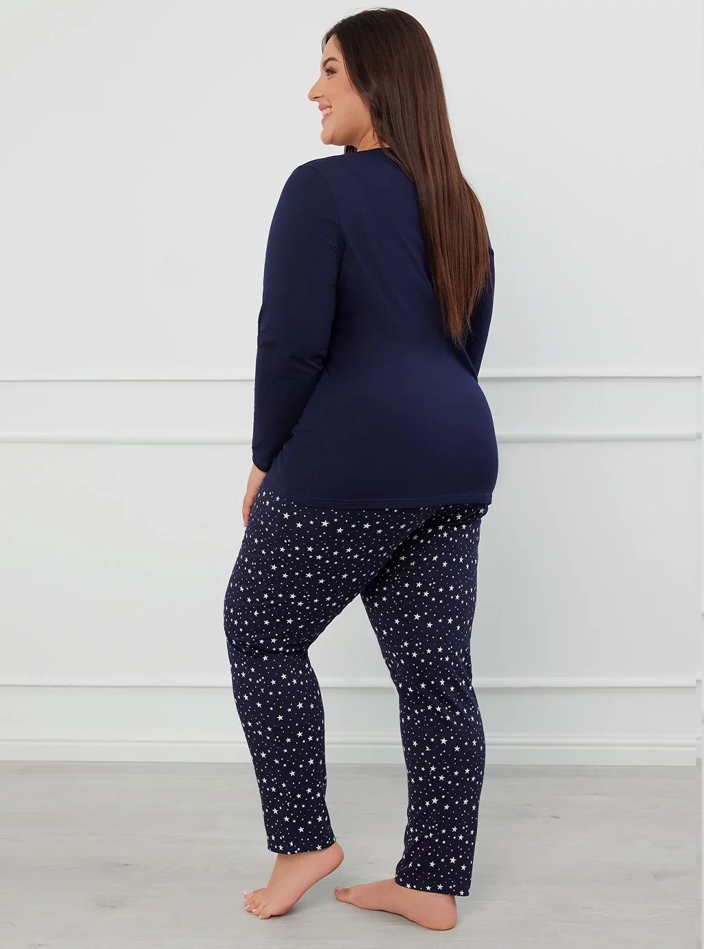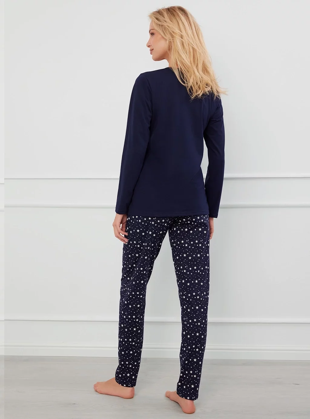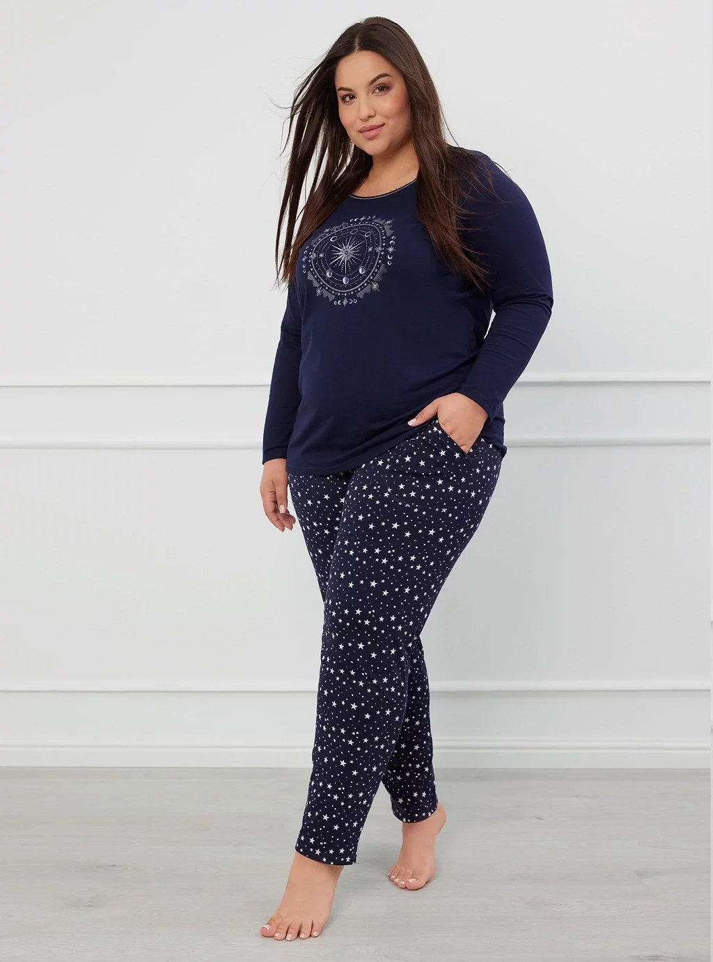 Stylowa piżama damska z kosmicznym motywem to idealny wybór dla osób, które cenią wygodę oraz unikalny design. Całość została wykonana z miękkiego, bawełnianego dżerseju, który zapewnia komfort i przyjemność noszenia. Piżama ma klasyczny, wygodny fason, z długimi rękawami oraz długimi nogawkami, co sprawia, że jest doskonała na chłodniejsze noce. Modna góra, ozdobiona nadrukiem przedstawiającym fazy księżyca, świetnie współgra z dołem, na którym widnieją gwiazdki, tworząc spójną, kosmiczną całość. Wykonana z bawełny, piżama jest miękka, gładka i odporna na rozciąganie, co sprawia, że będzie służyć przez długi czas, zachowując swój kształt i komfort.