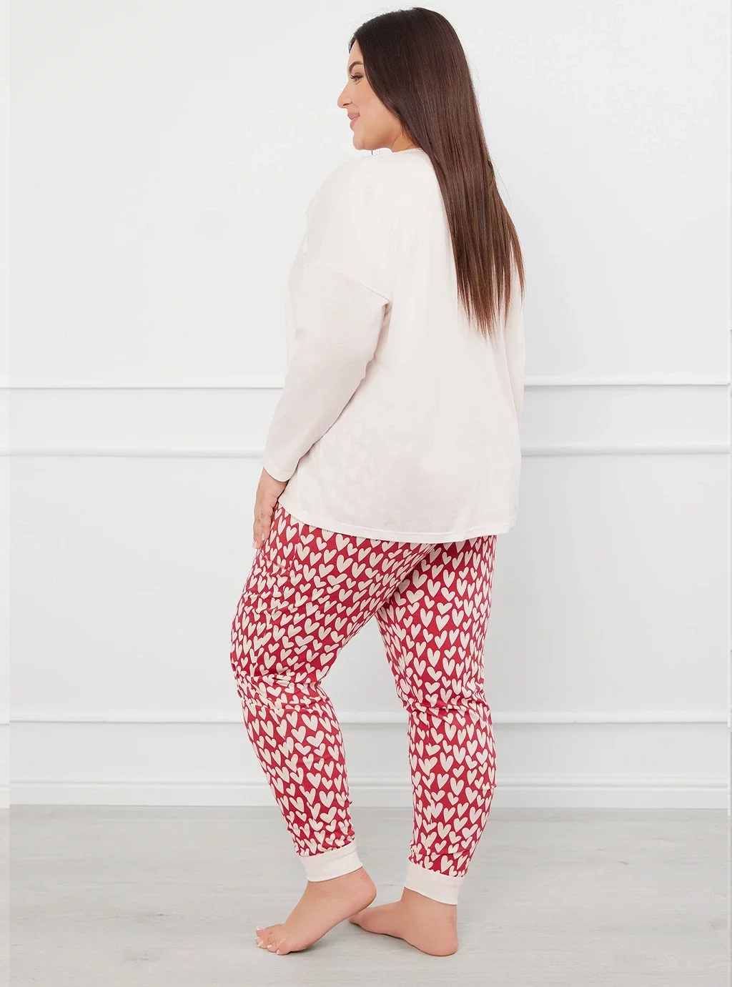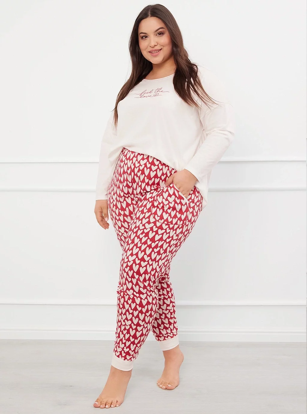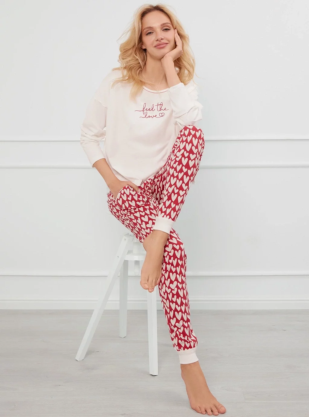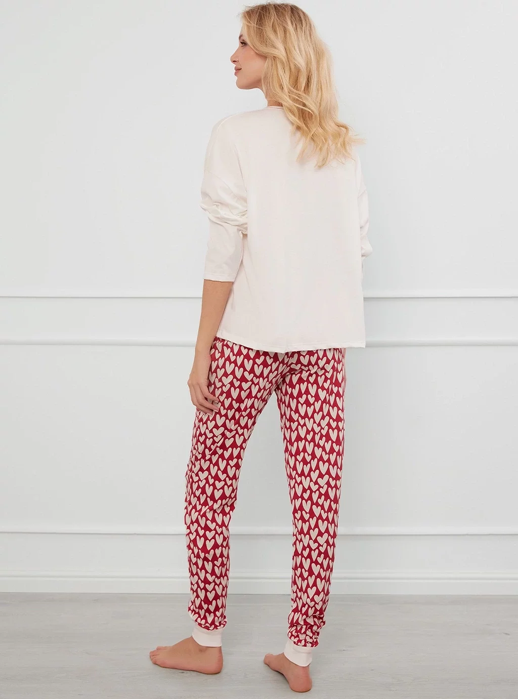 Piżama o prostej, luźnej linii. Szeroka, luźna bluza z dekoltem w serek i ozdobnym nadrukiem z przodu. Spodnie z kieszeniami i ściągaczami w dole.