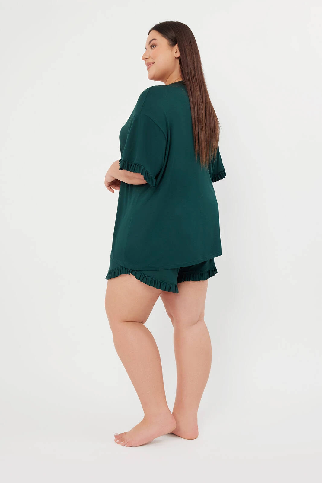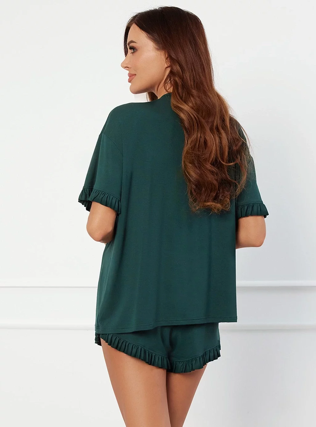 Piżama o luźnej, prostej linii. W bluzie okrągły dekolt i rękawki wykończone falbanką. Spodenki z wygodną, nieuciskającą gumą w tunelu, wykończone falbanką w dole.