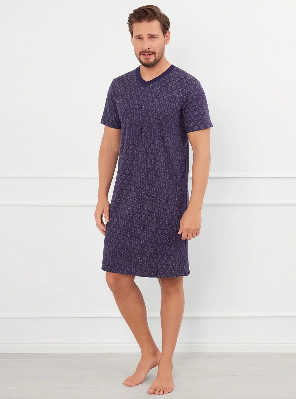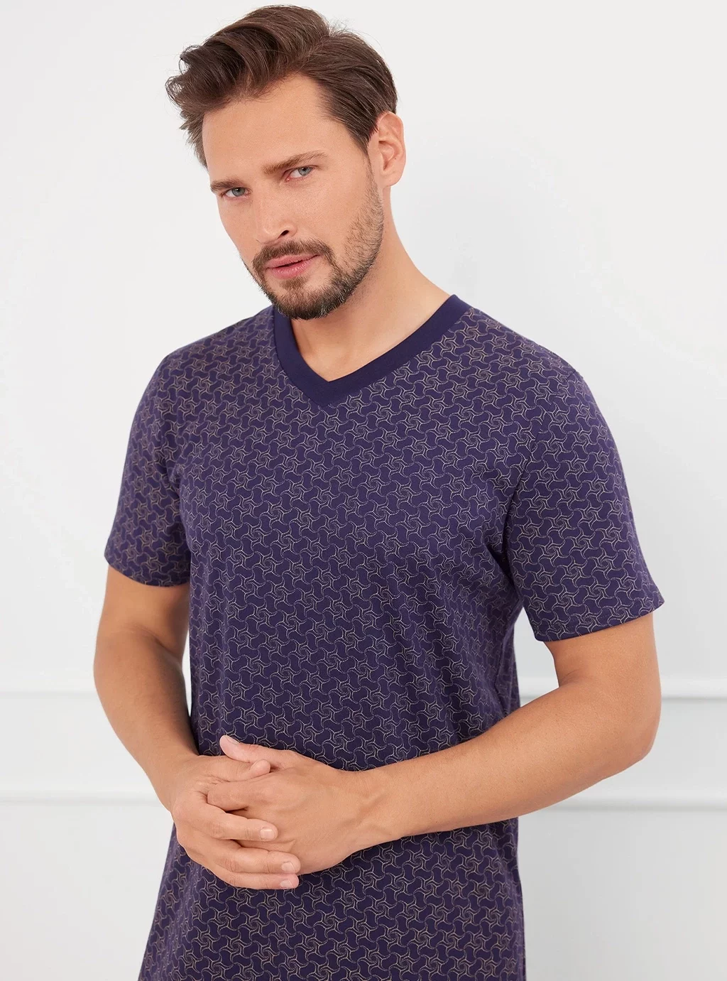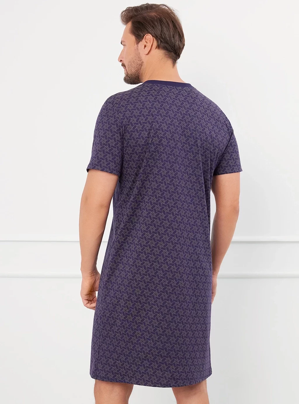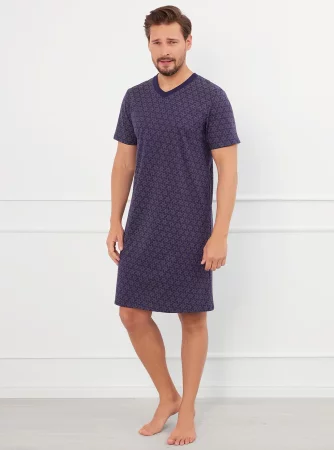 Krótka męska koszula nocna to doskonała propozycja dla panów szukających komfortu i elegancji. Wykonana w 100% z wysokiej jakości bawełny, gwarantuje miękkość i przewiewność, zapewniając wygodę przez całą noc. Luźny krój nie ogranicza ruchów, a dekolt w kształcie litery V elegancko podkreśla sylwetkę, ułatwiając zakładanie i zdejmowanie koszuli. Głęboki odcień granatu wzbogacony dyskretnym, geometrycznym wzorem dodaje koszuli nocnej wyrafinowanego wyglądu, łącząc komfort z klasycznym stylem.