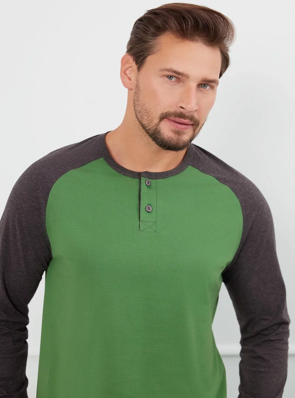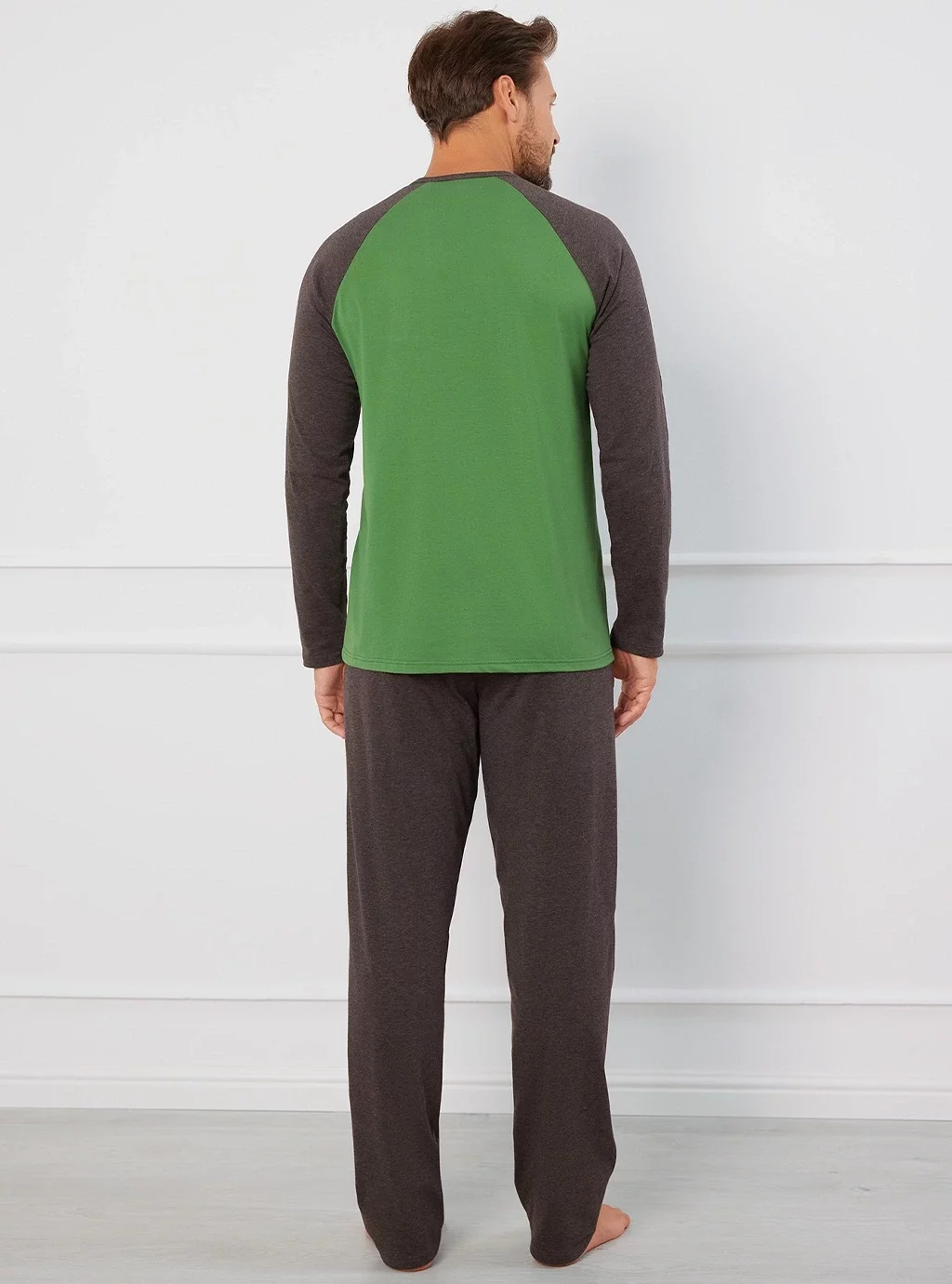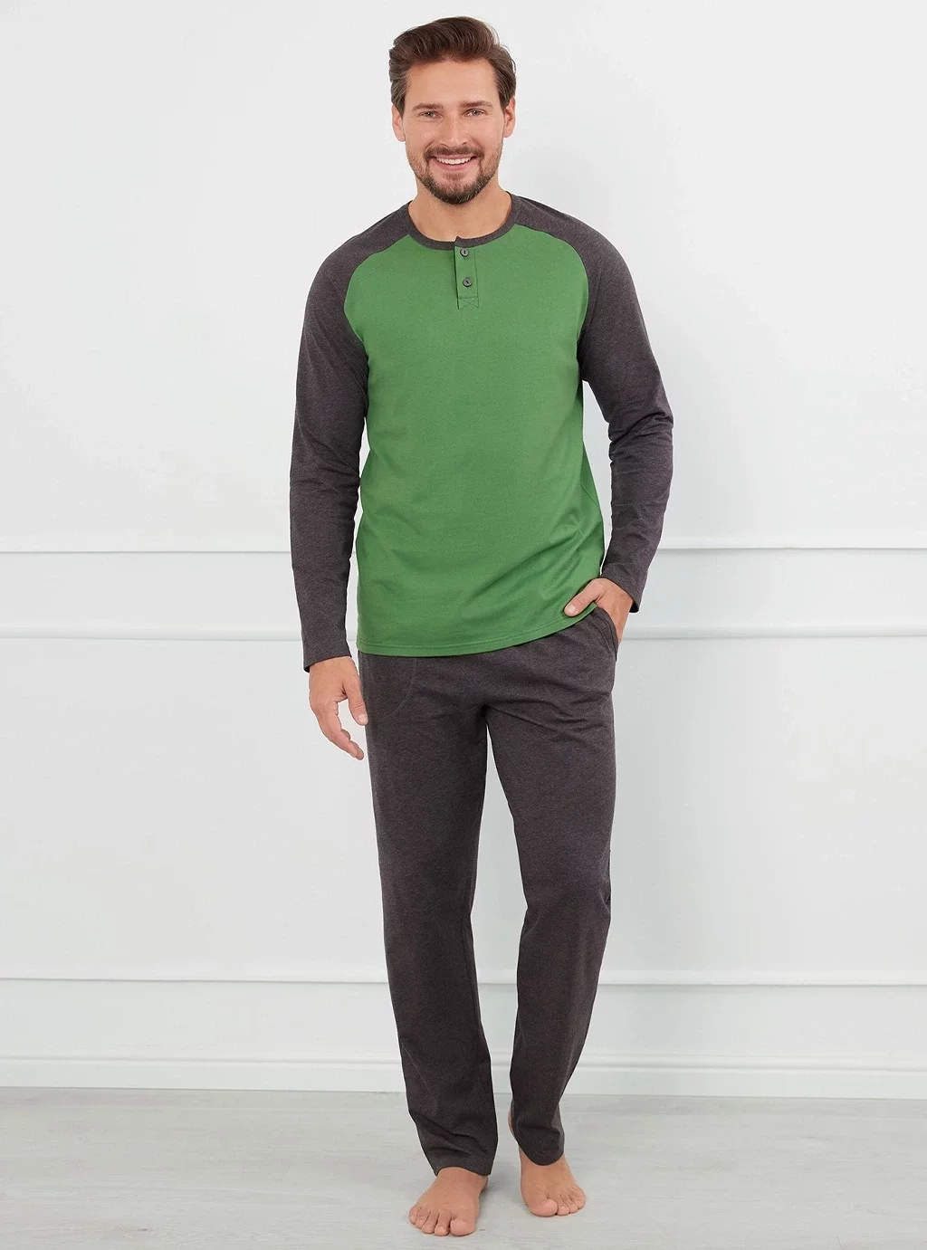 Piżama o klasycznej linii. W bluzie okrągły dekolt i zapięcie polo na guziki. Spodnie z kieszeniami.